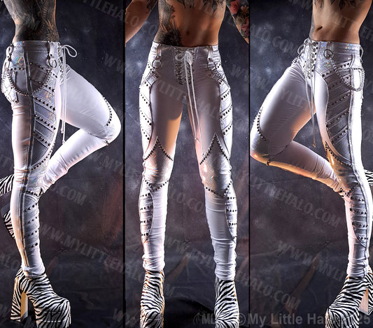 White Holographic Rivet & Chain Glam Rock Skinny Pants #7