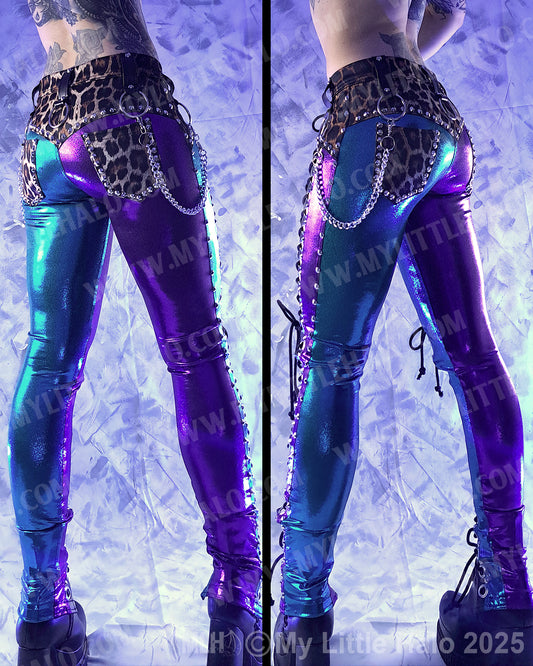 #1 Purple & Turquoise Leopard Print Front Lace up Pants