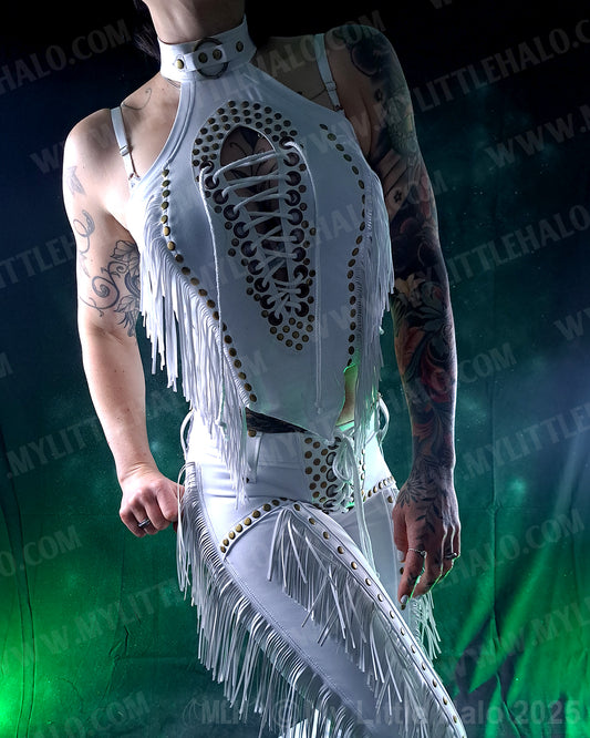 #1 White Fringed Peephole Crop Top w Lace up Back