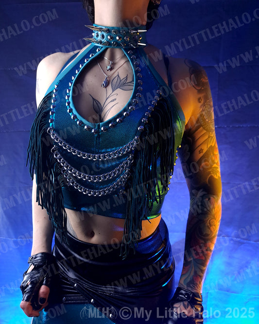 #17 Spiked & Fringed Teal Peephole Halter Top