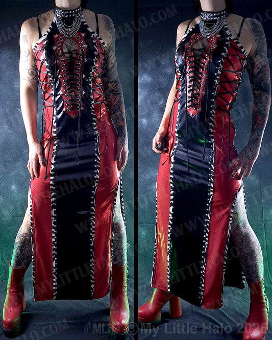 Rock and metal themed alternative mini dresses and maxi dresses. Handmade with faux leather, spandex, rivets, O-rings, chains and spikes.
