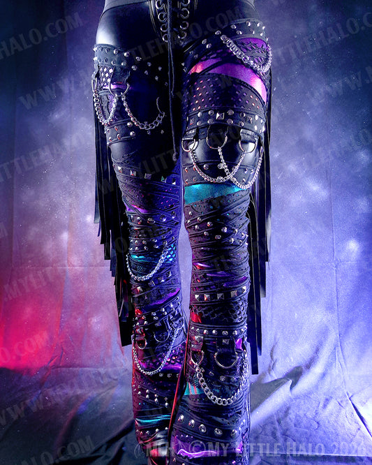 High Waisted Claret, Purple & Teal Rivet & Chain Goth Flares #16