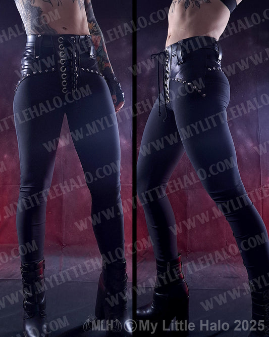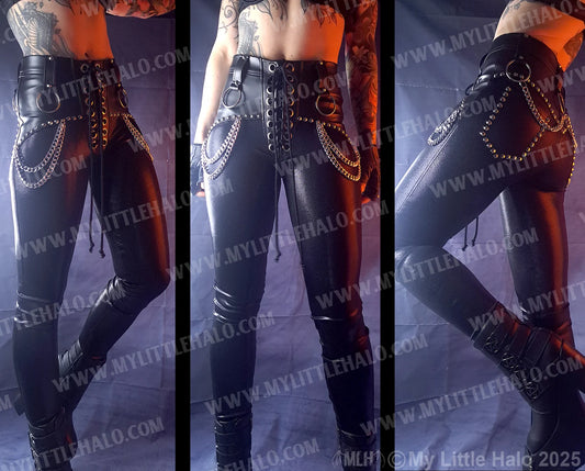 Rock chick pants, flares and leggings in multi-size, made by hand in small batches of multiple sizes, only one of each size per design released! Created with high quality spandex and leather, with rivets, O-rings, D-rings, chains & spikes.