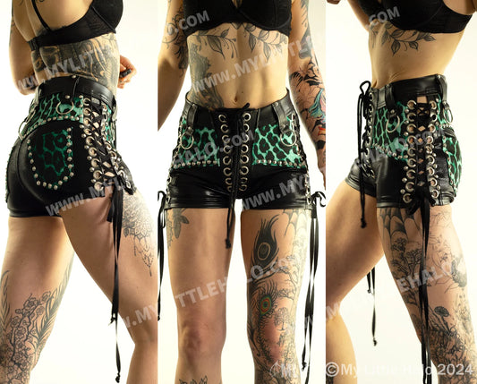 Multi-size shorts, lace up shorts and studded hotpants, made in small batches of multiple sizes. Low and high waisted shorts with lace up fly and lace up sides, studs, eyelets, rings and chains.