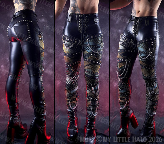 Influenced by classic stagewear, rock metal fashion and the underground alternative scene, these trousers are made to stand out, not disappear into a crowd. Expect details like lace up fronts and sides, faux leather panels, chains, rivets and contrast fabrics, combined with fits that are actually wearable for real life, not just photos.