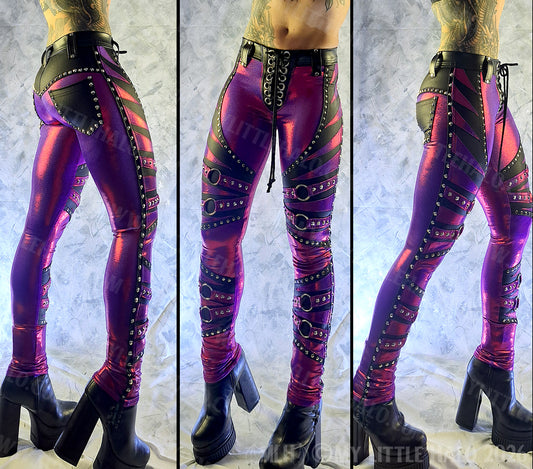 High Waisted Claret, Purple & Teal Rivet & Chain Goth Flares #16