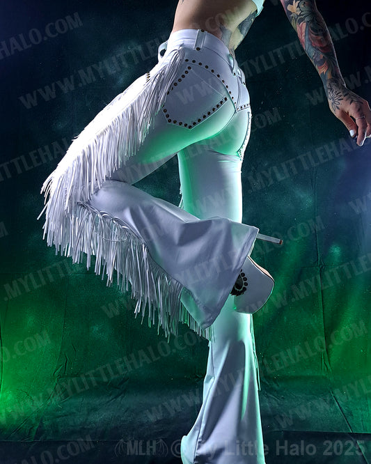 #1 White Fringed Peephole Crop Top w Lace up Back
