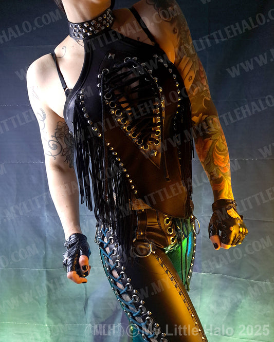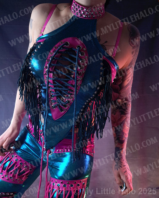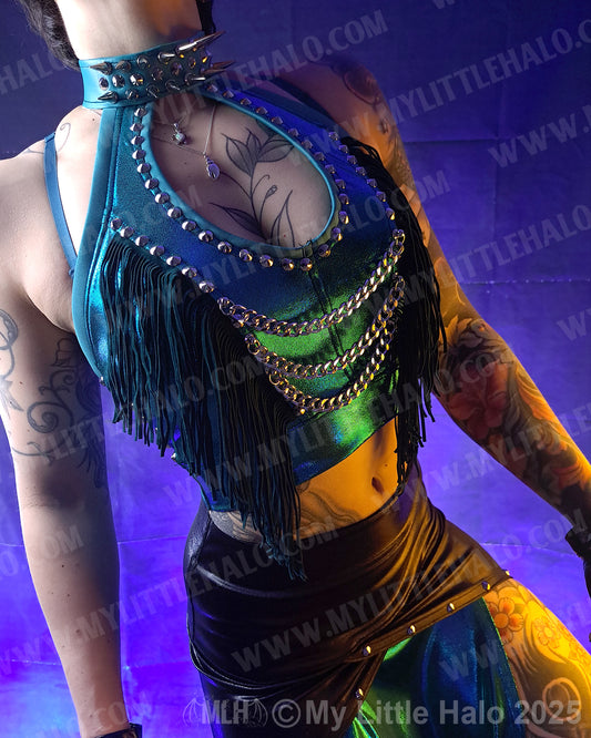 #17 Spiked & Fringed Teal Peephole Halter Top