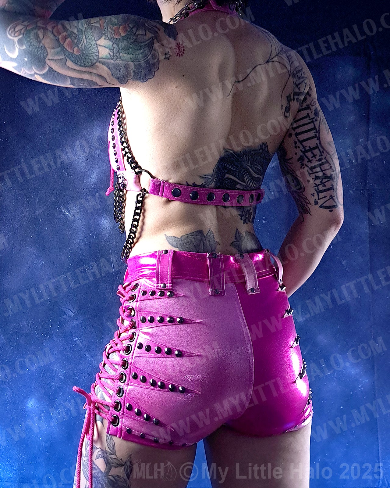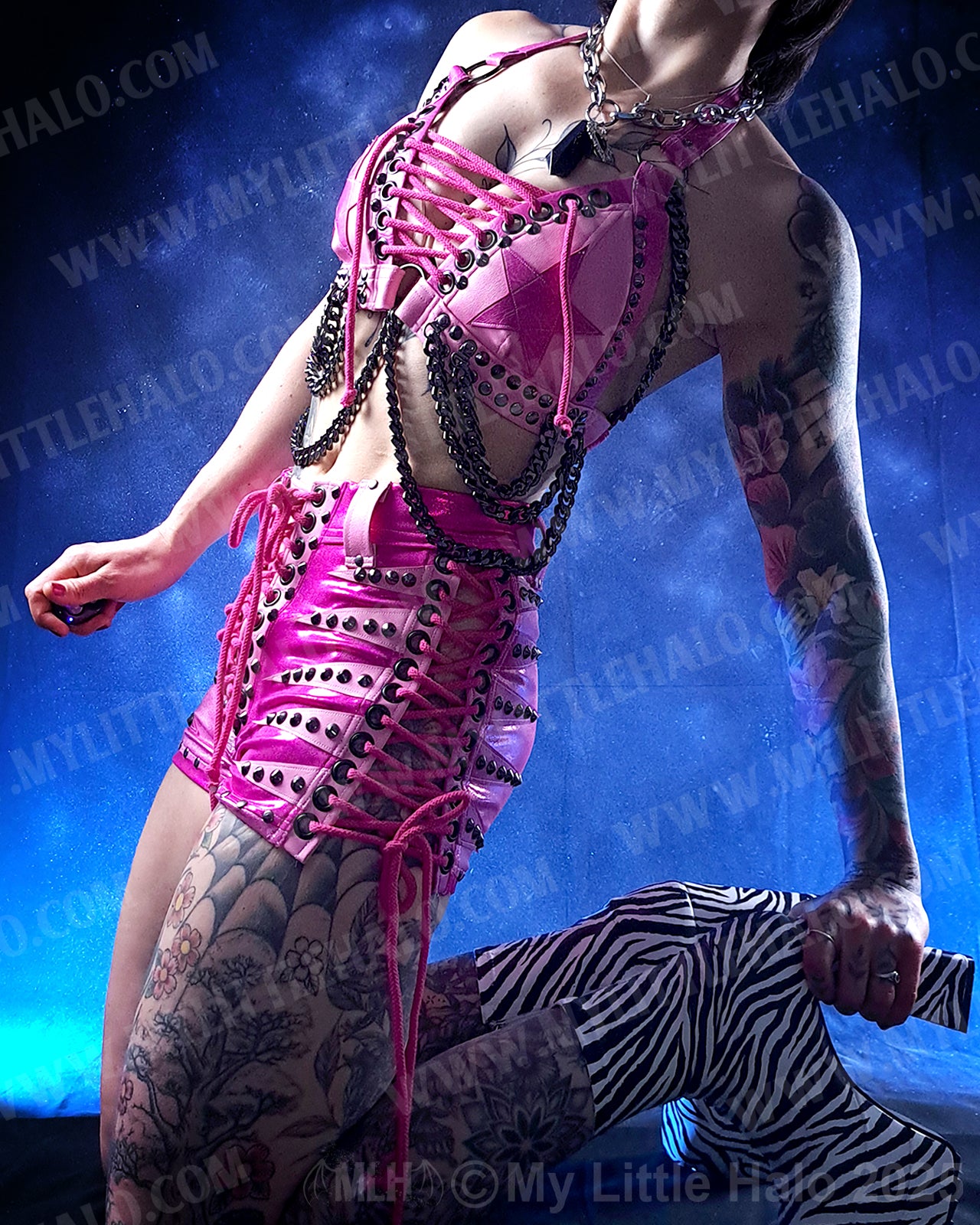 Padded bikini halter in dark & light pink with stars on the bust, lace up front, loads of chunky gunmetal chain and adjustable back and halter neck straps. Made with faux leather & soft spandex lining. (This bikini halter is smaller than the others in this collection and will best fit a smaller bust)