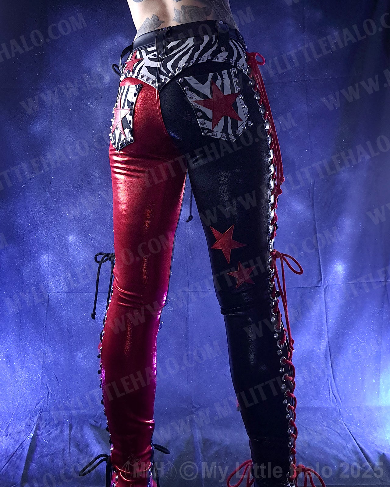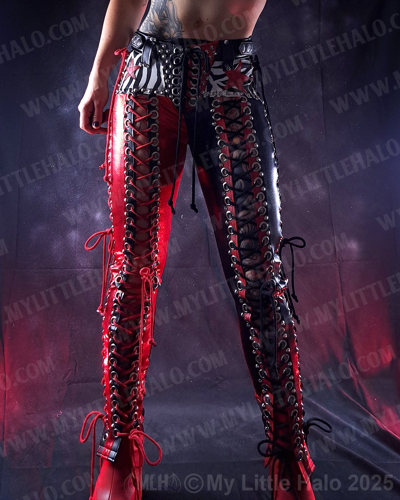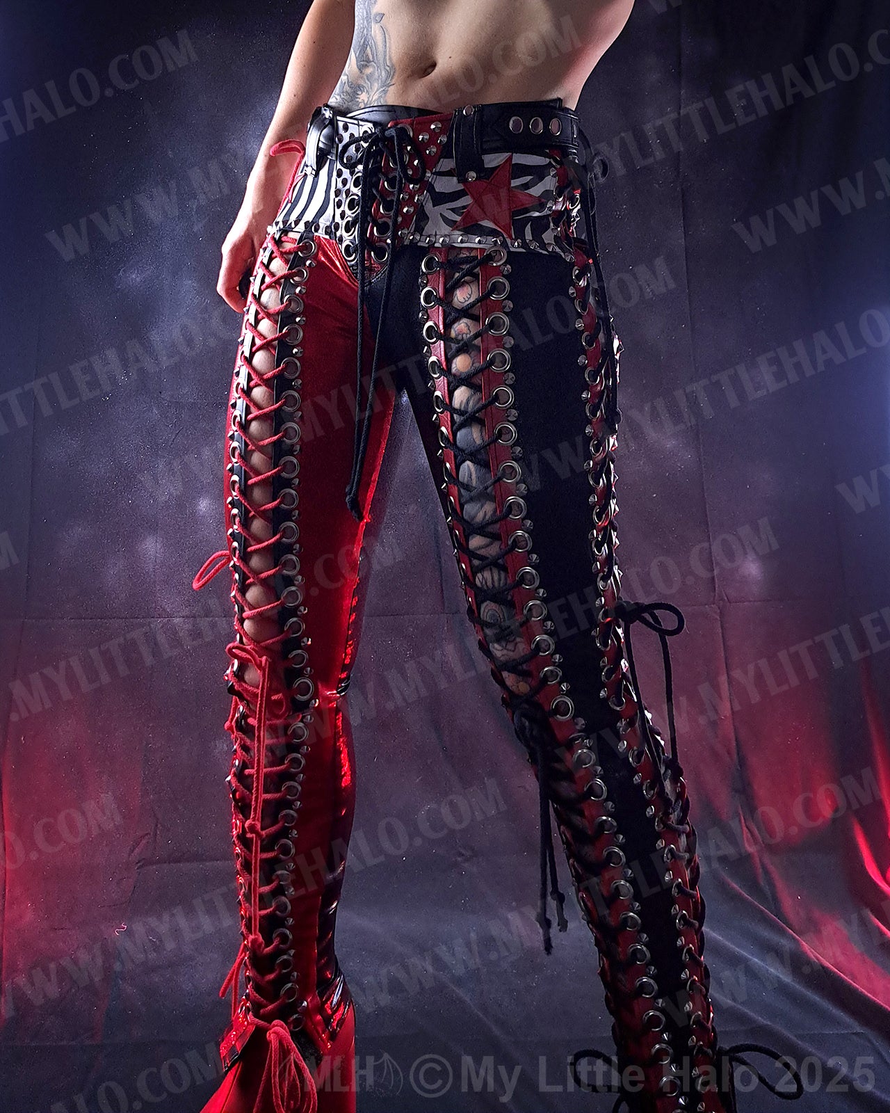 Super fun glam rock themed lace up pants with lace up front and lace up sides. Alternating red and black accents with zebra print overlays, red leather stars, loads of silver eyelets and rivets. The open lace up sides mean they are highly adjustable and there are adjustable popper fastenings on the waistband. Made with red and black metallic spandex, scuba and faux leather. One of a kind item, all leathers are faux.