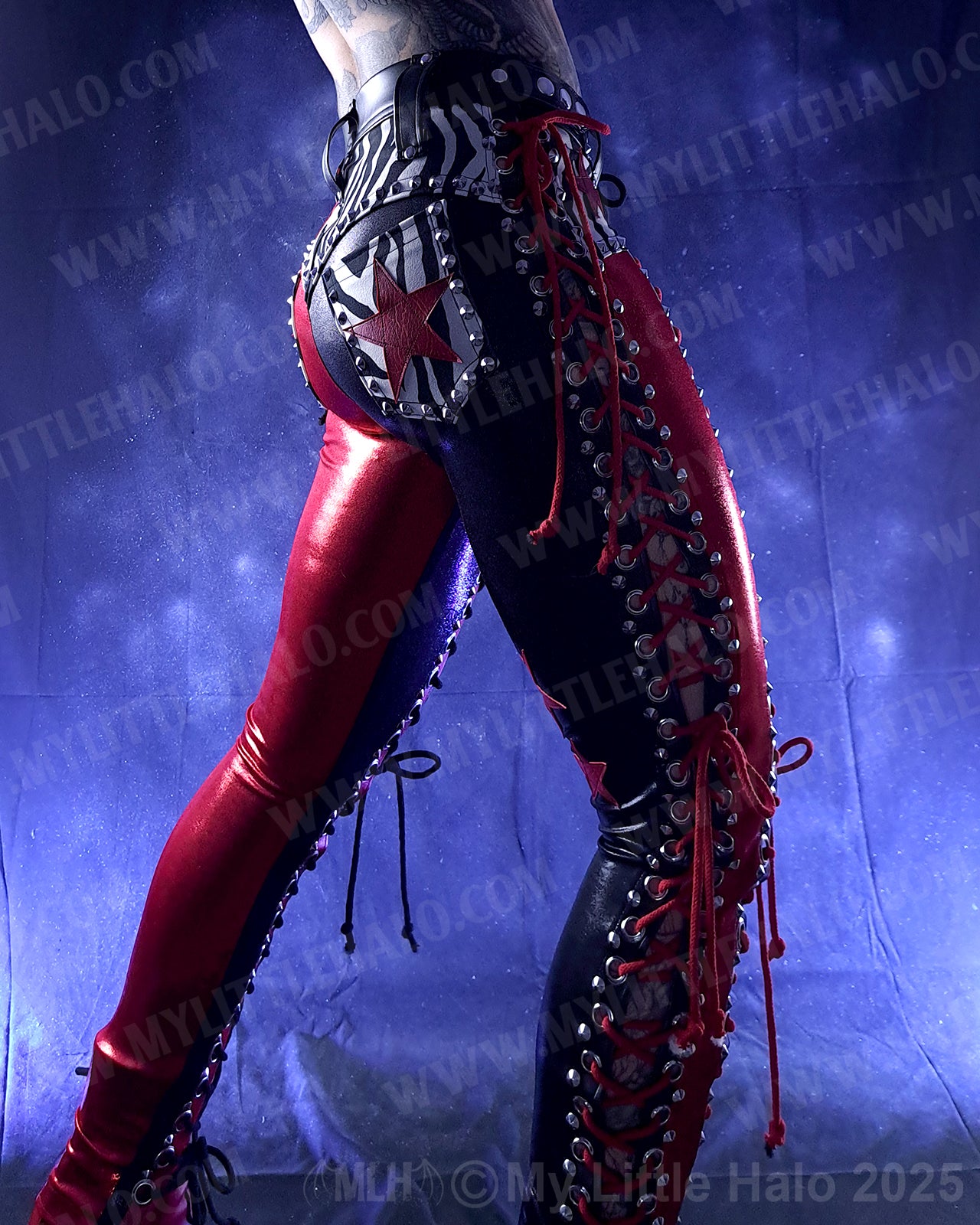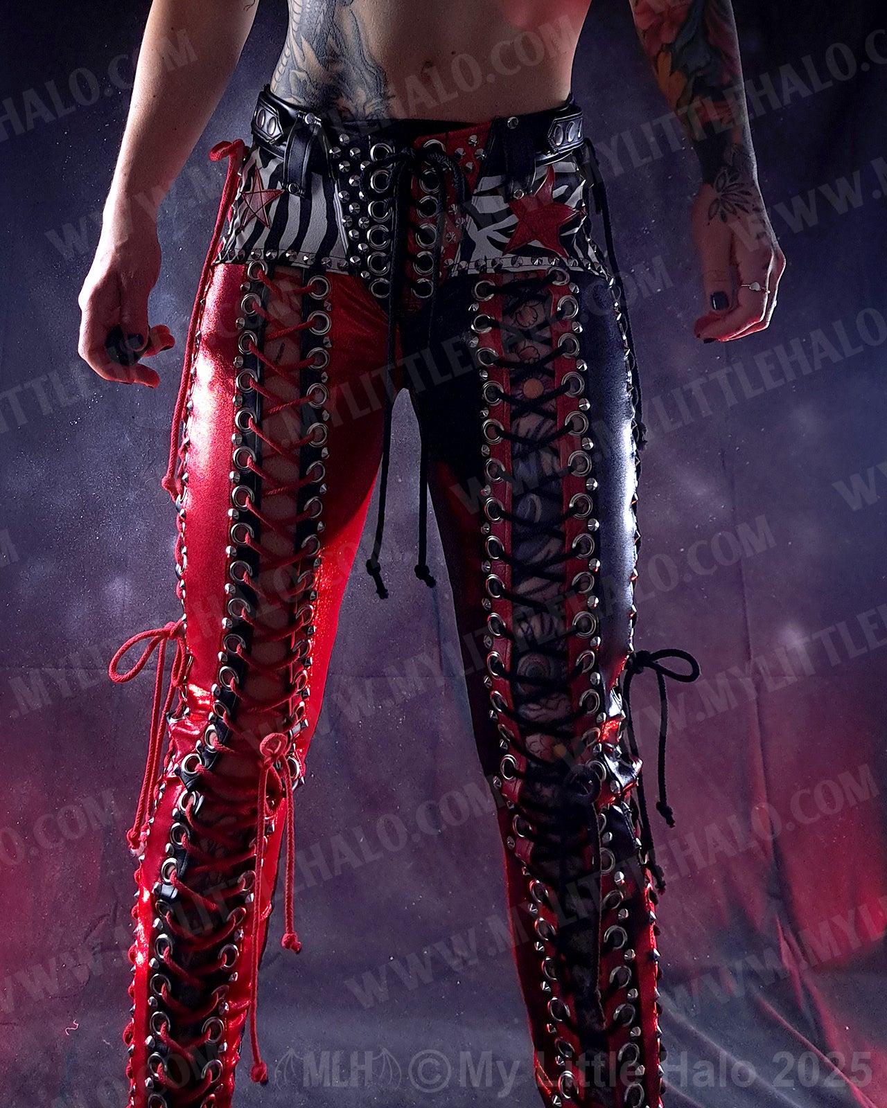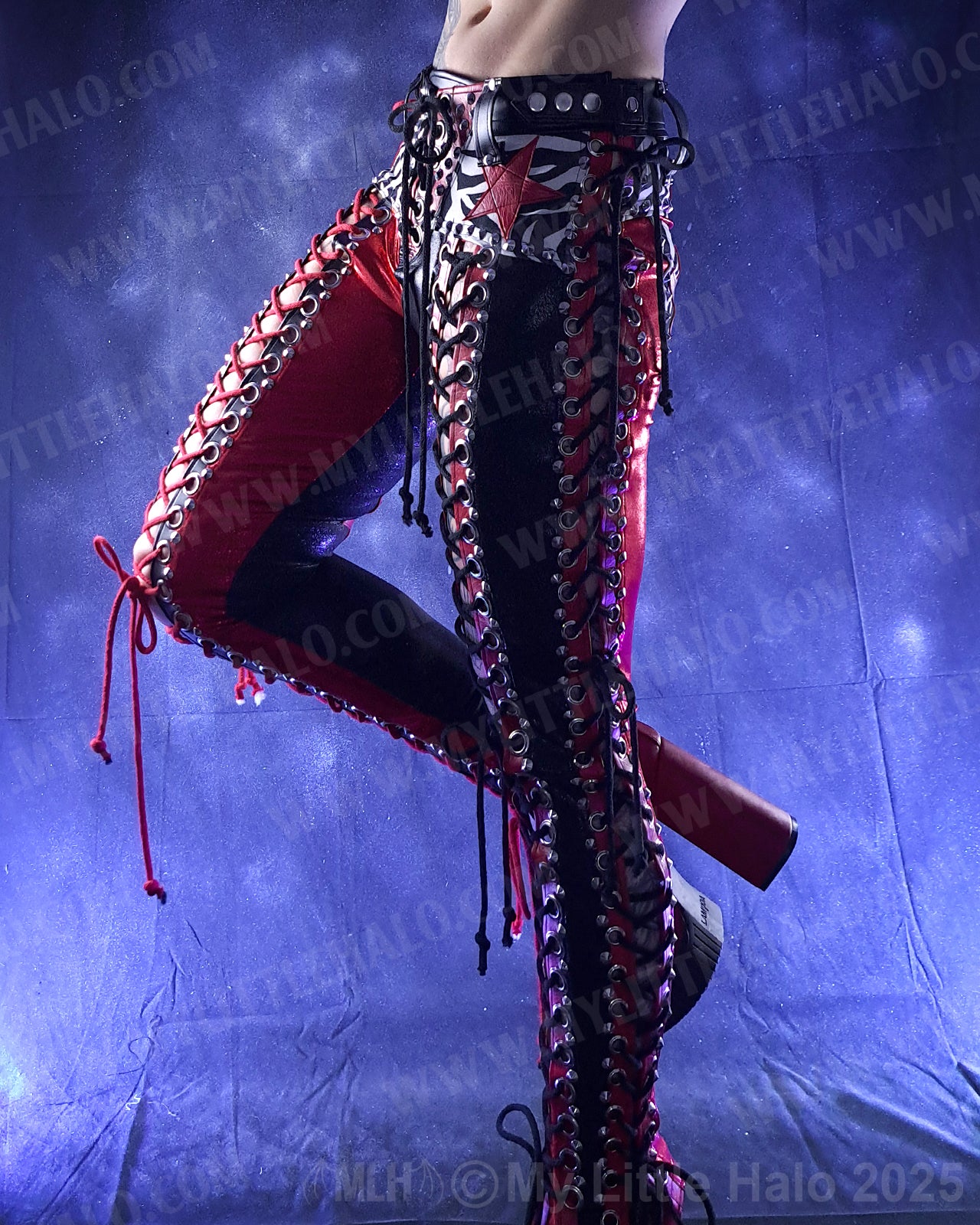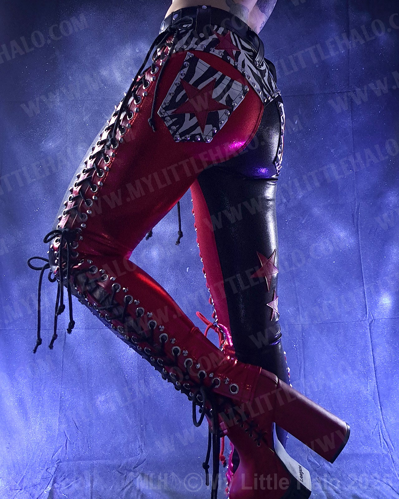 Super fun glam rock themed lace up pants with lace up front and lace up sides. Alternating red and black accents with zebra print overlays, red leather stars, loads of silver eyelets and rivets. The open lace up sides mean they are highly adjustable and there are adjustable popper fastenings on the waistband. Made with red and black metallic spandex, scuba and faux leather. One of a kind item, all leathers are faux.