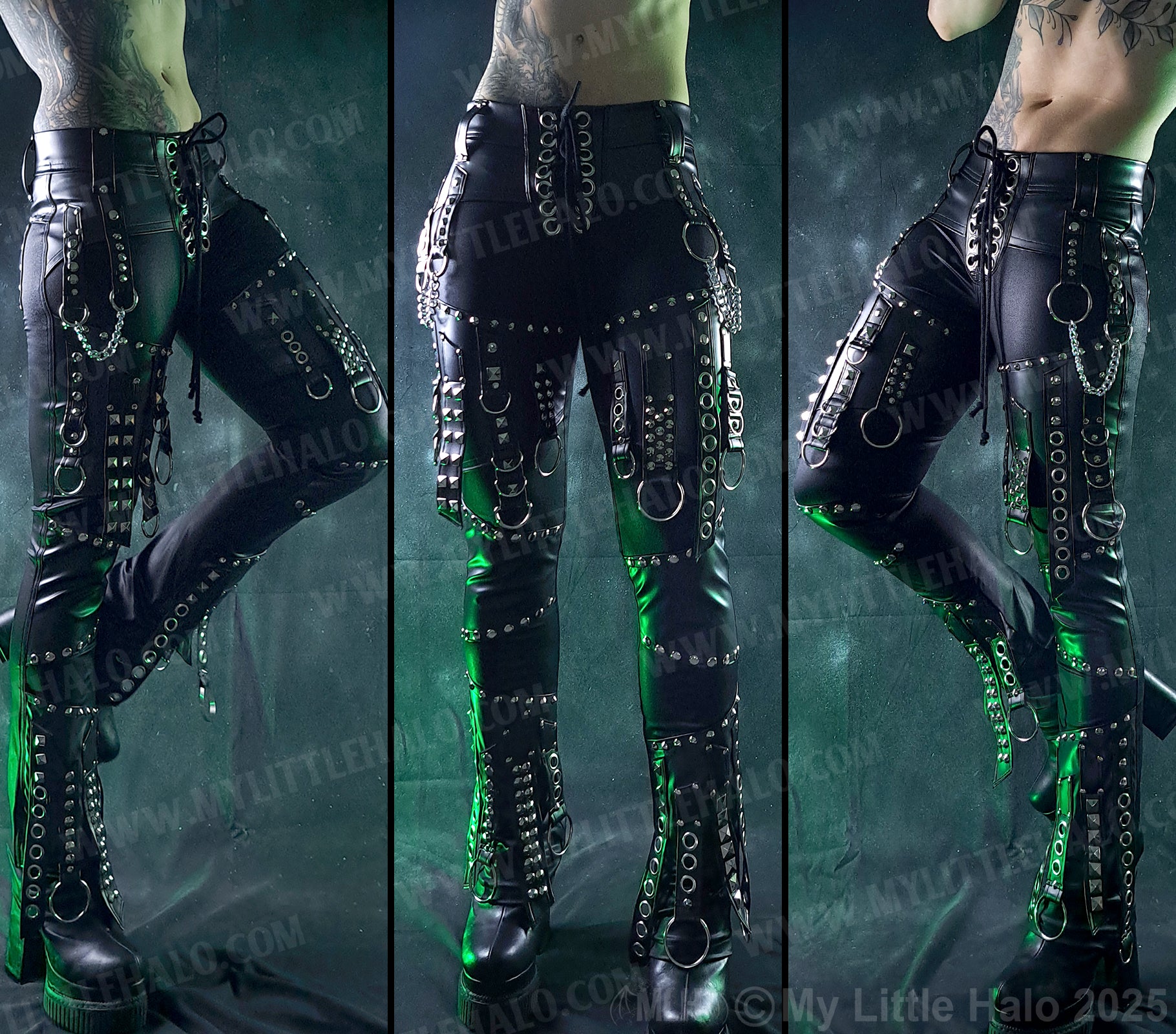 Mid waisted, straight leg gothic pants with stretch faux leather overlays and straps with silver O-rings, D-rings, rivets and eyelets. The pants have riveted faux leather overlays and pockets at the back, stretch leather waist, belt looks and lace up fly. One of a kind pants!