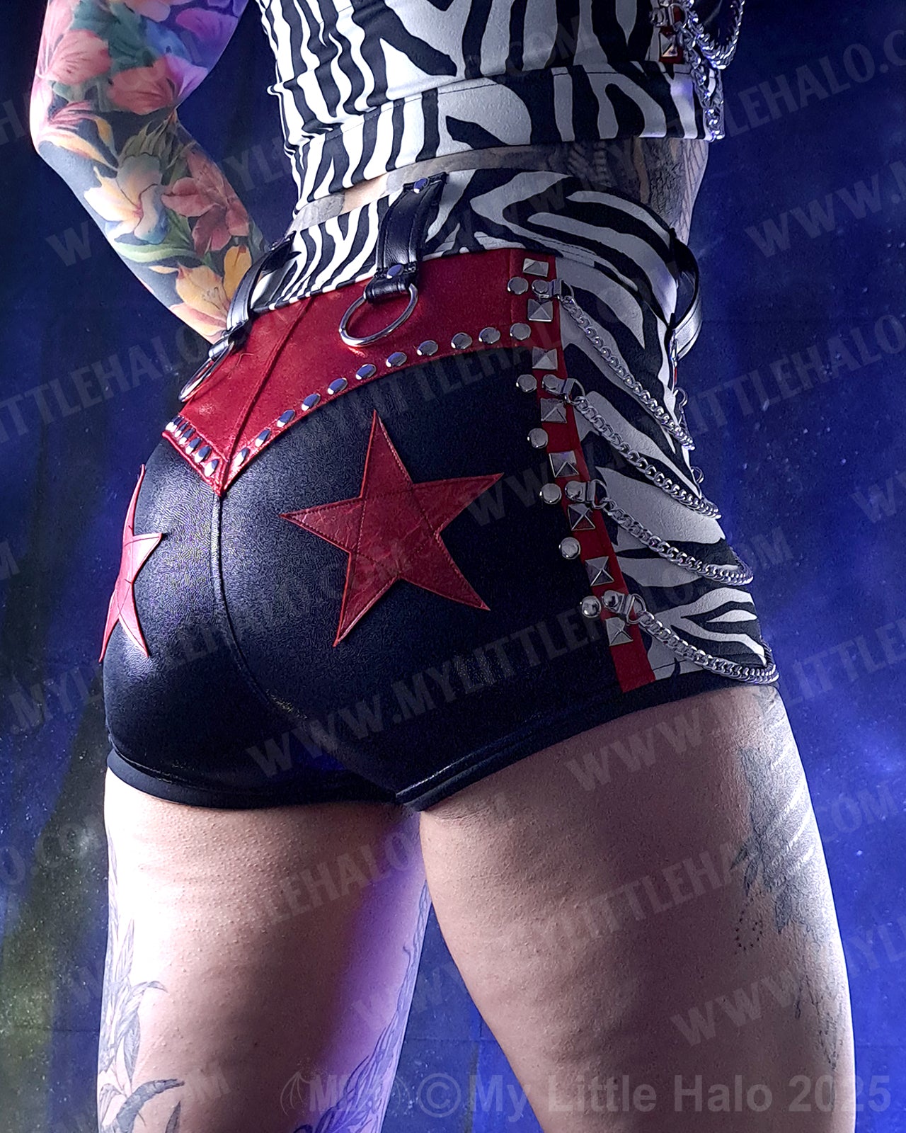 High waisted, lace up, zebra print shorts with silver chains, red leather stars on the butt, lace up fly and zebra print waistband. Made with red and black metallic spandex, zebra print scuba and leatherette. One of a kind item!