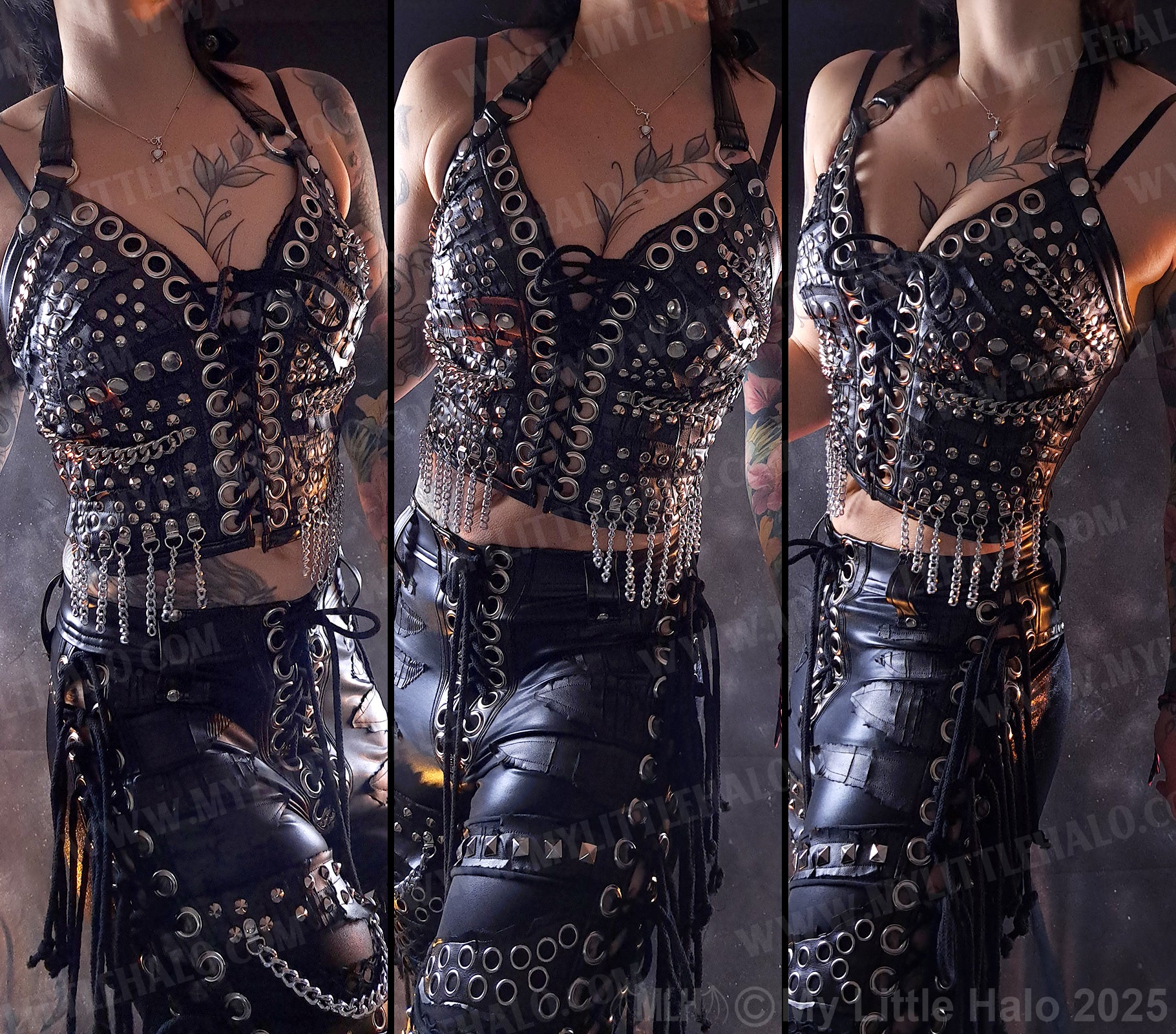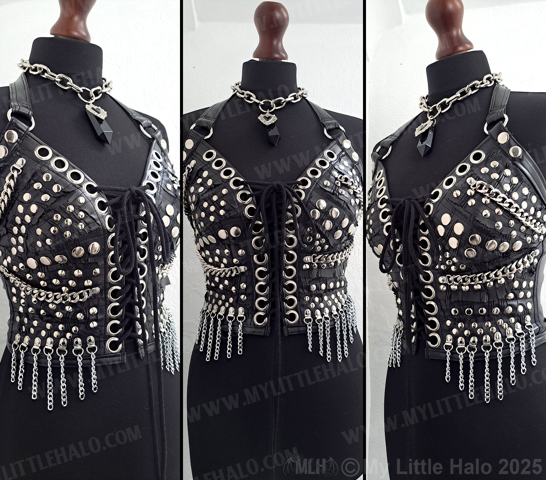 Heavy metal bustier in black leatherette with distressed black faux leather, heavy silver chains and loads of silver rivets, adjustable lace up front and halter strap. Black faux leather front with stretch black wet look back and soft spandex lining. One of a kind.