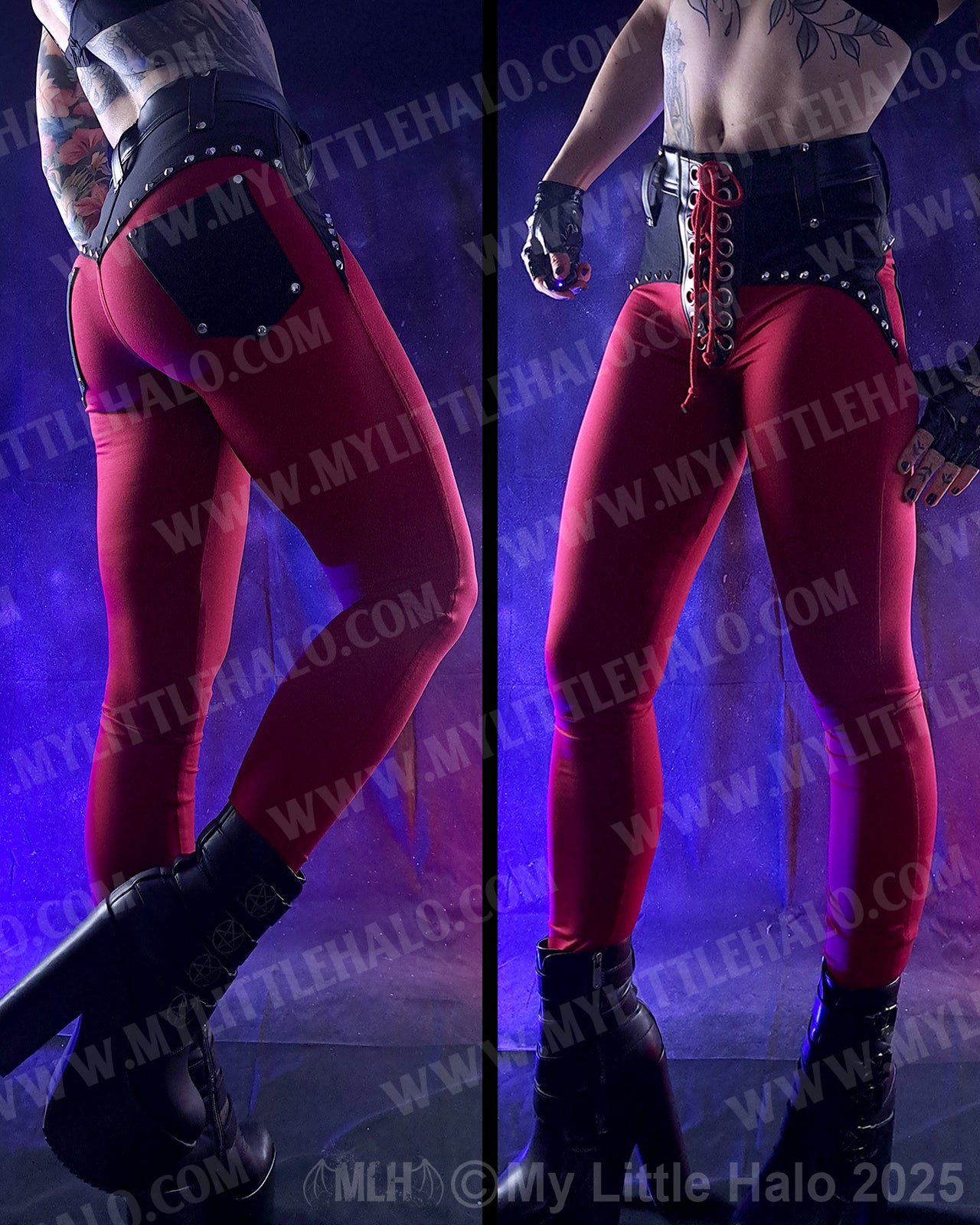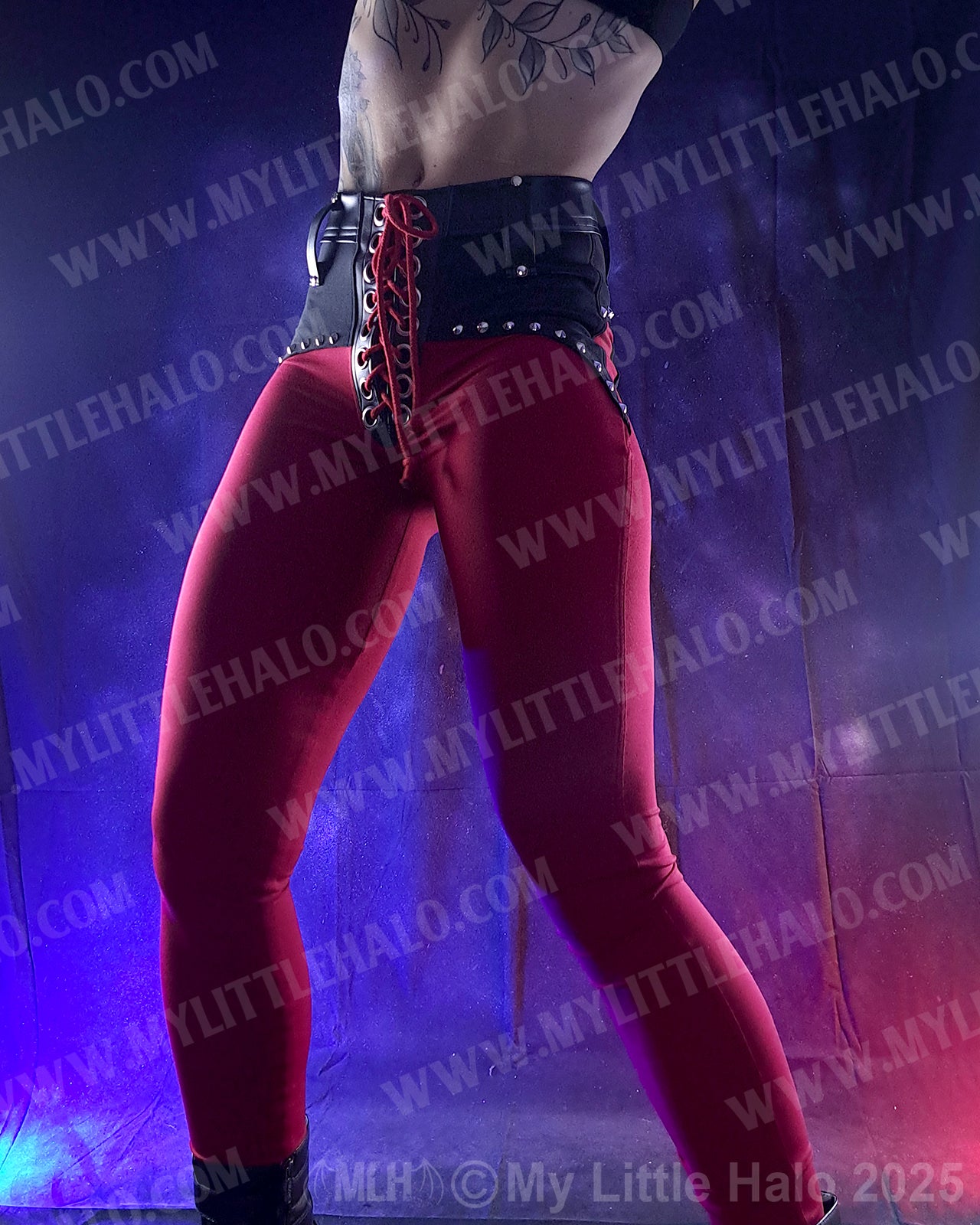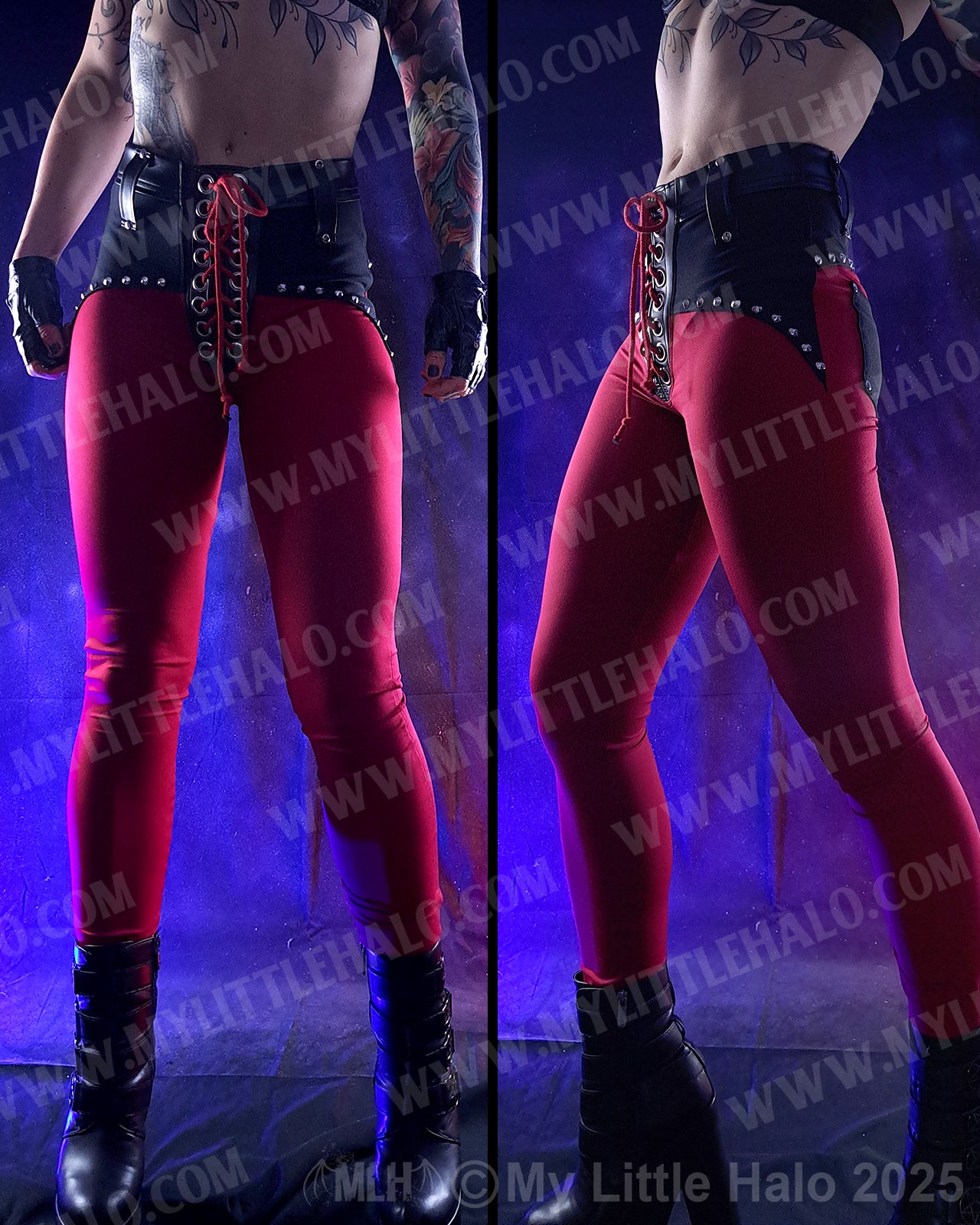 High waisted, red and black skinny pants in deep red sports lycra, with black riveted overlays front and back, back pockets and stretch leather waist, lace up fly with red lacing