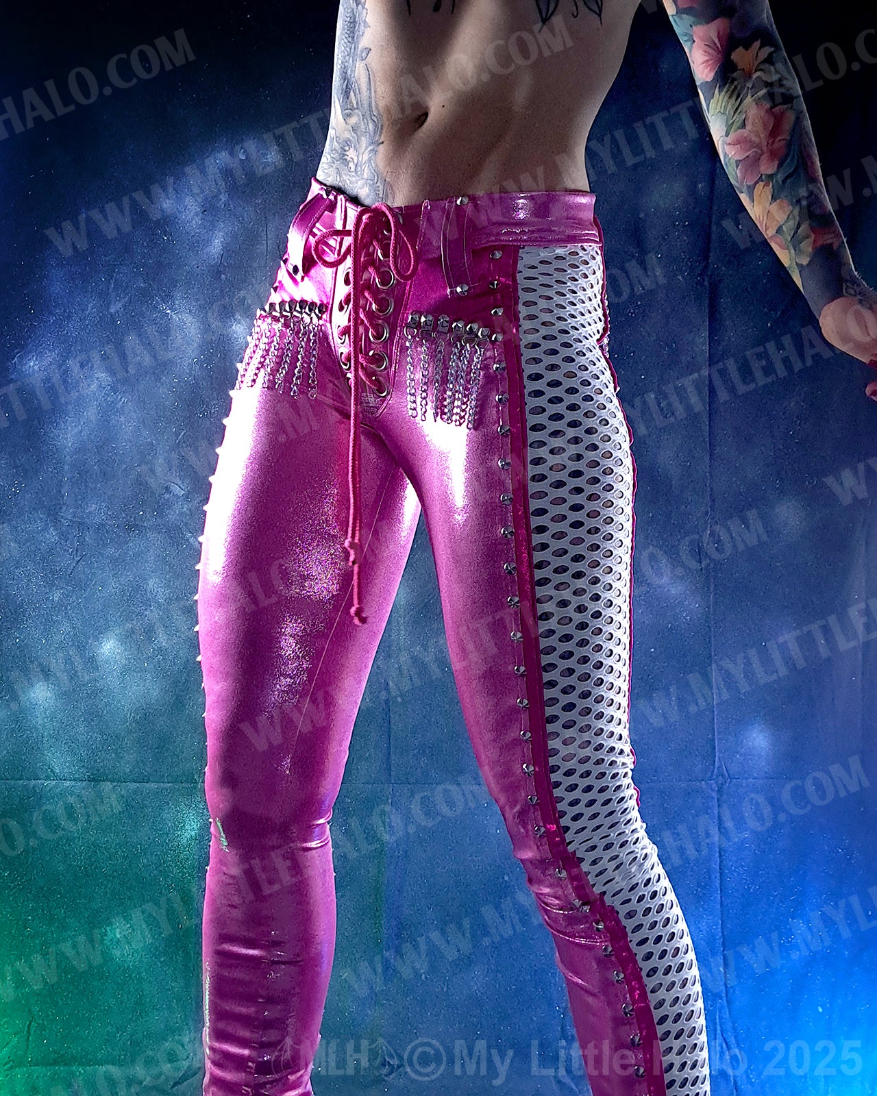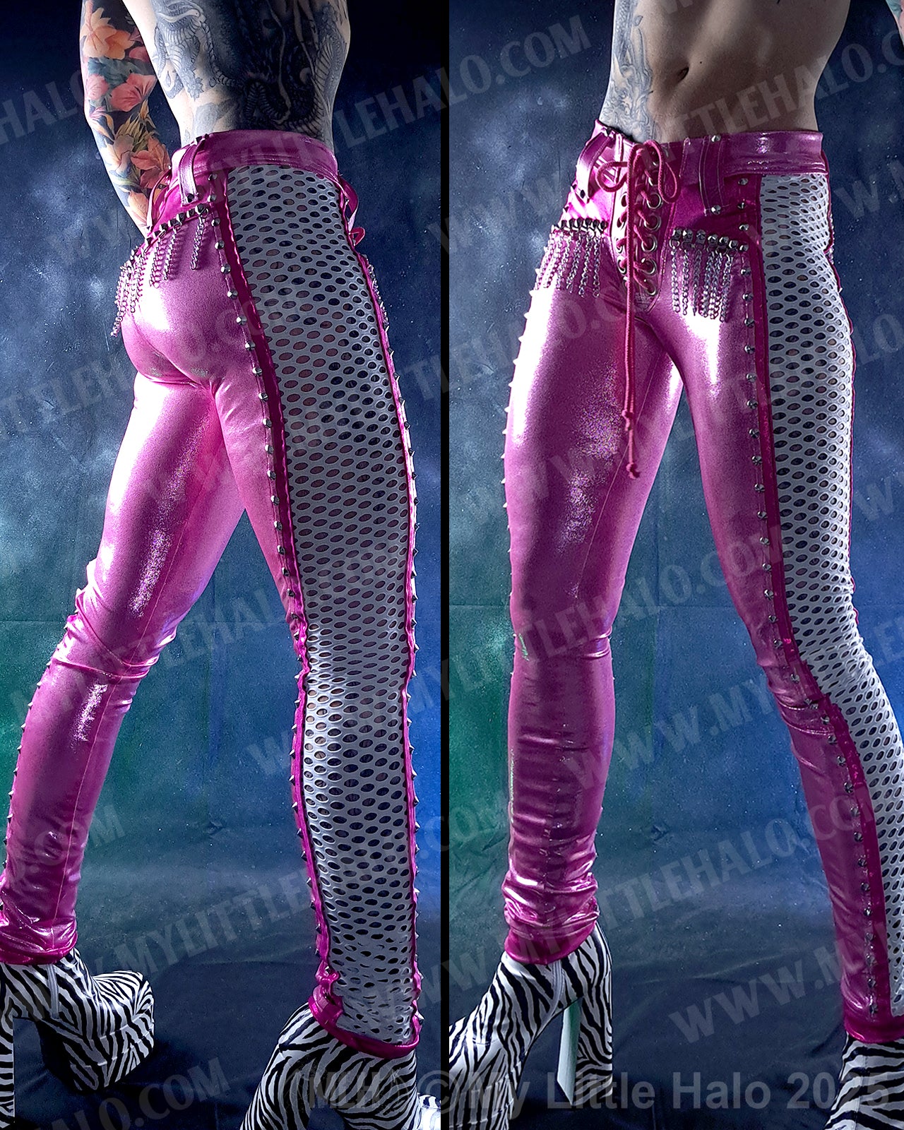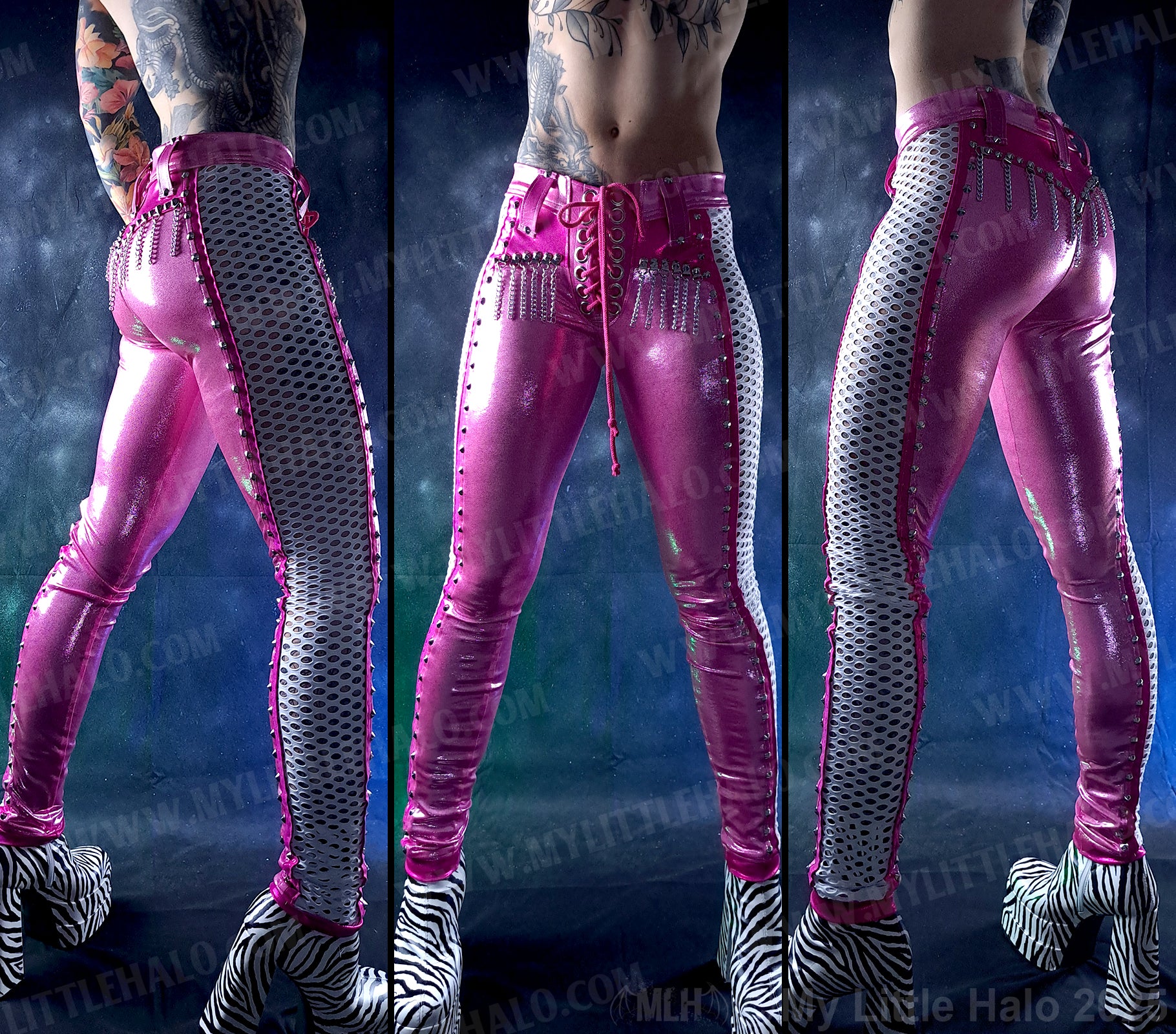 Low rise light pink skinny pants with white pothole fishnet side panels, dark pink overlays with silver chain fringe and cone rivets, lace up fly and belt loops.