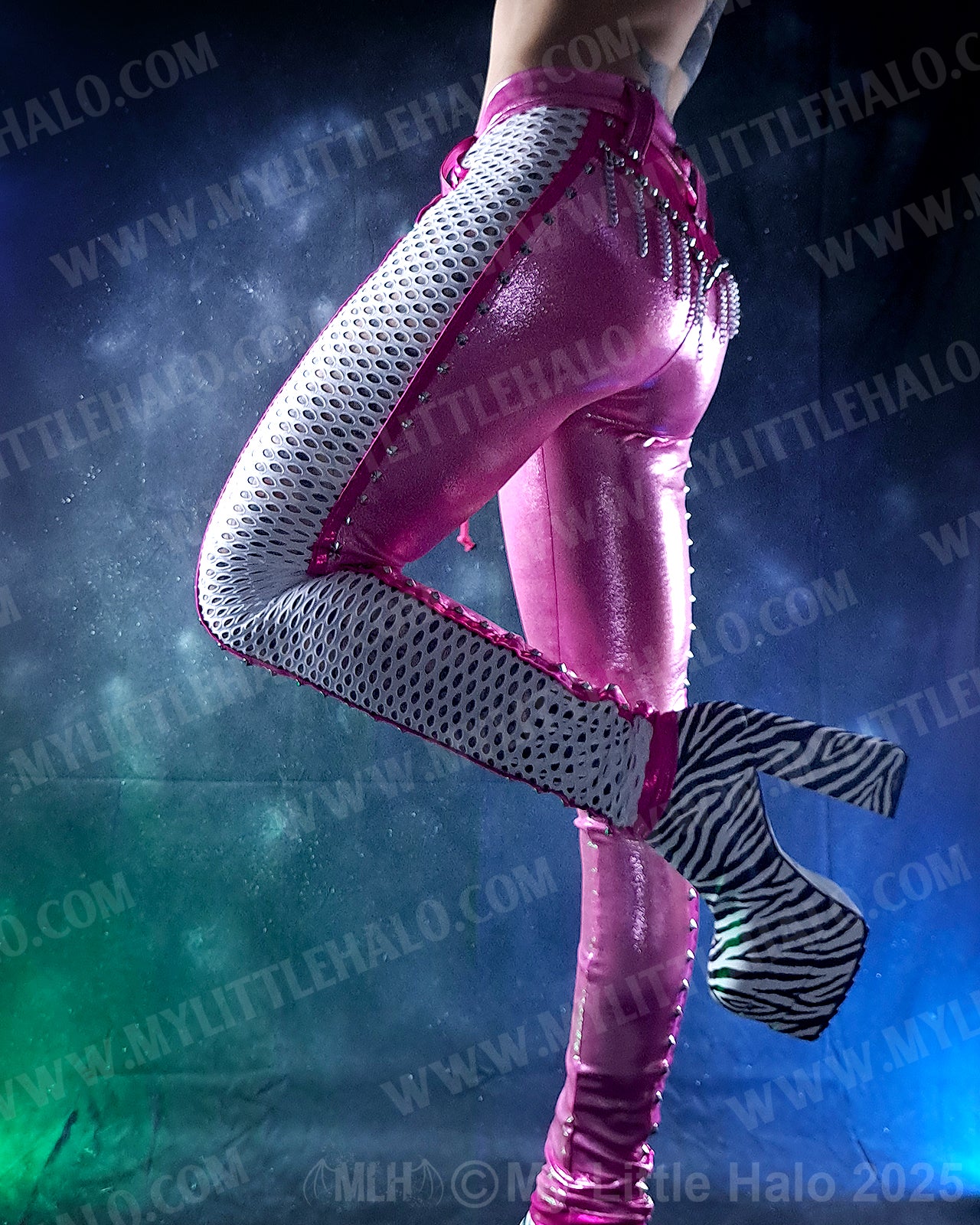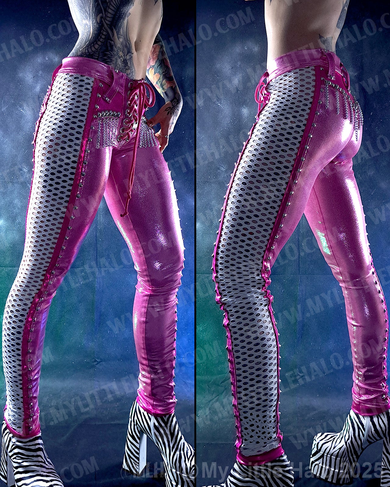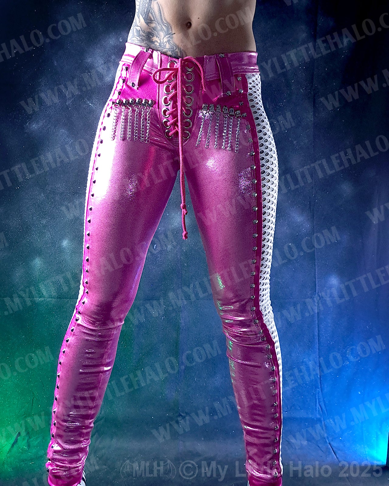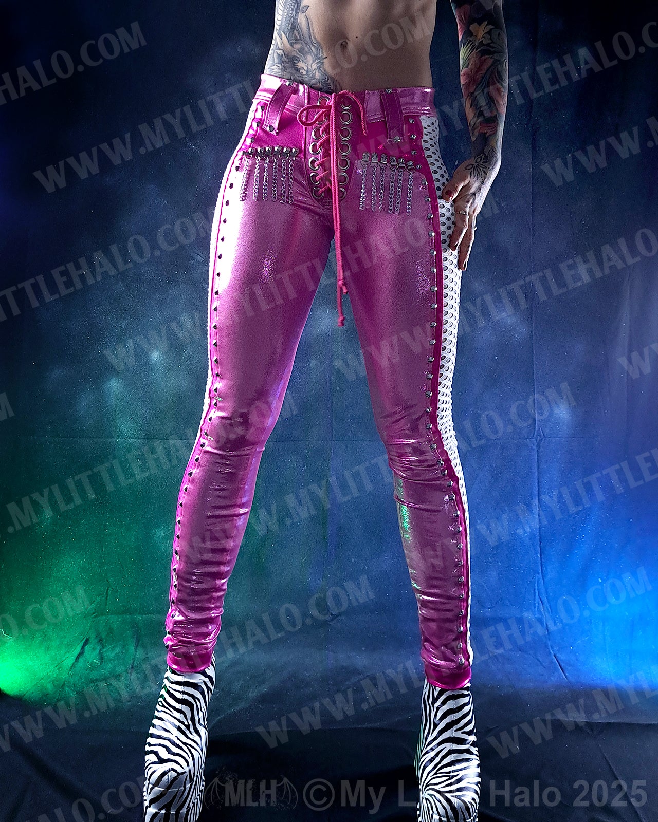 Low rise light pink skinny pants with white pothole fishnet side panels, dark pink overlays with silver chain fringe and cone rivets, lace up fly and belt loops.