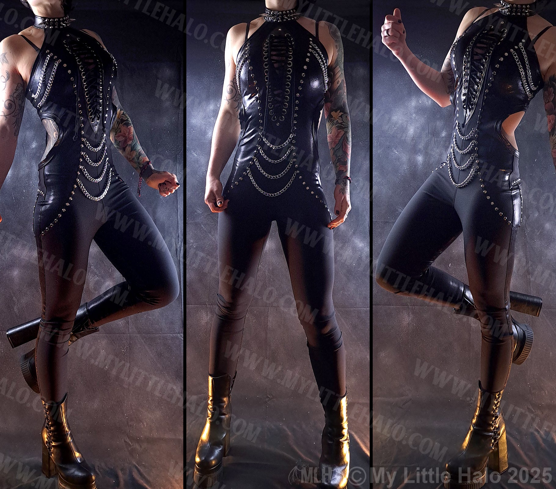 Black spandex catsuit with lace up peephole bust, silver chains, open back and choker style halter neck with spikes