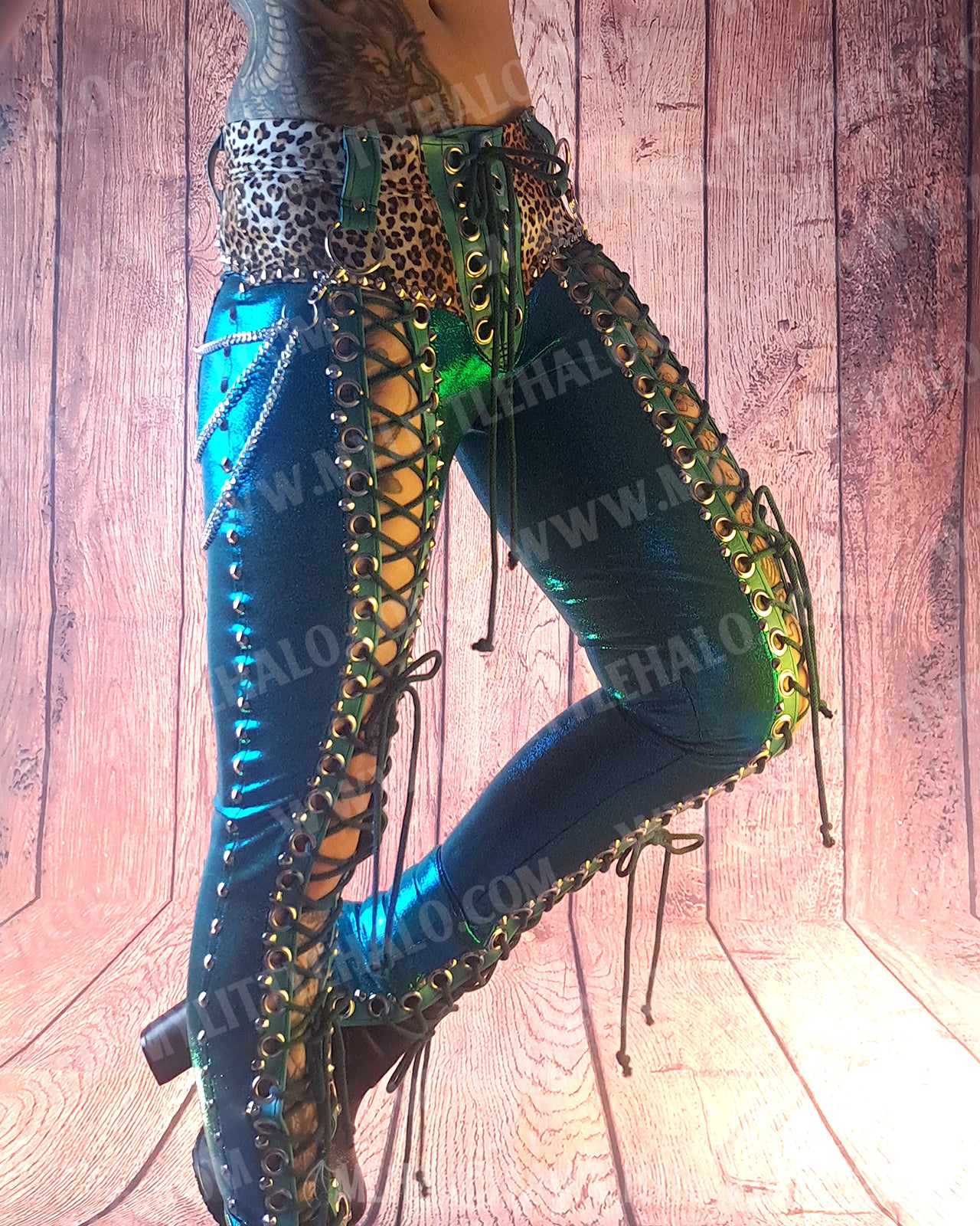 *Stretch cheetah waist with teal lace up fly, belt loops, O-rings & chains