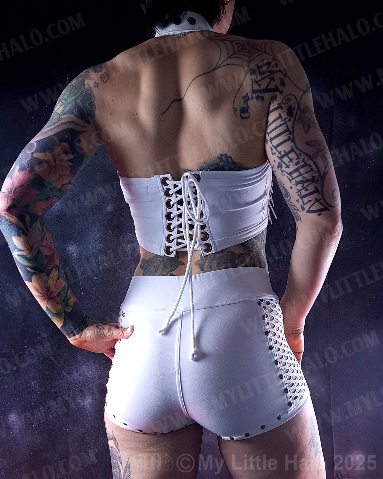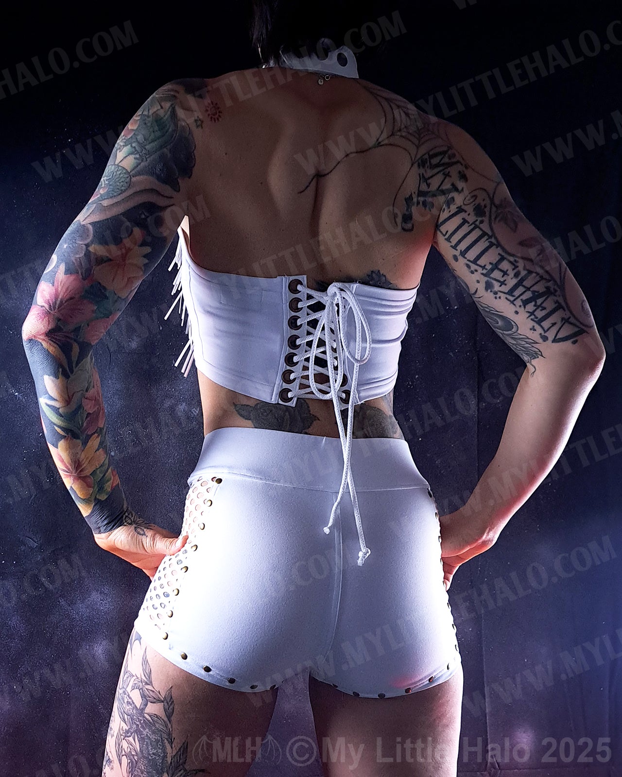 White stretch crop top with lace up front and back, faux leather fringed bust, brass rivets and choker strap