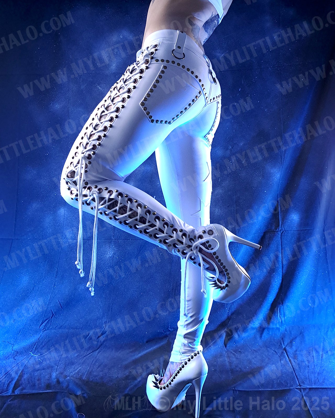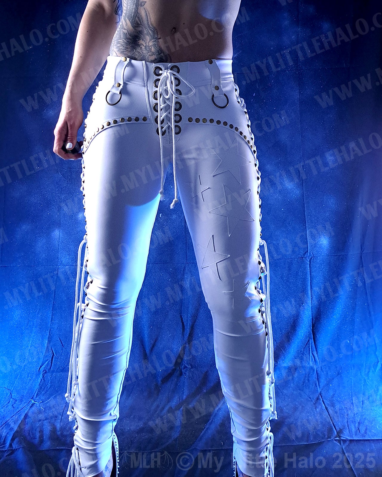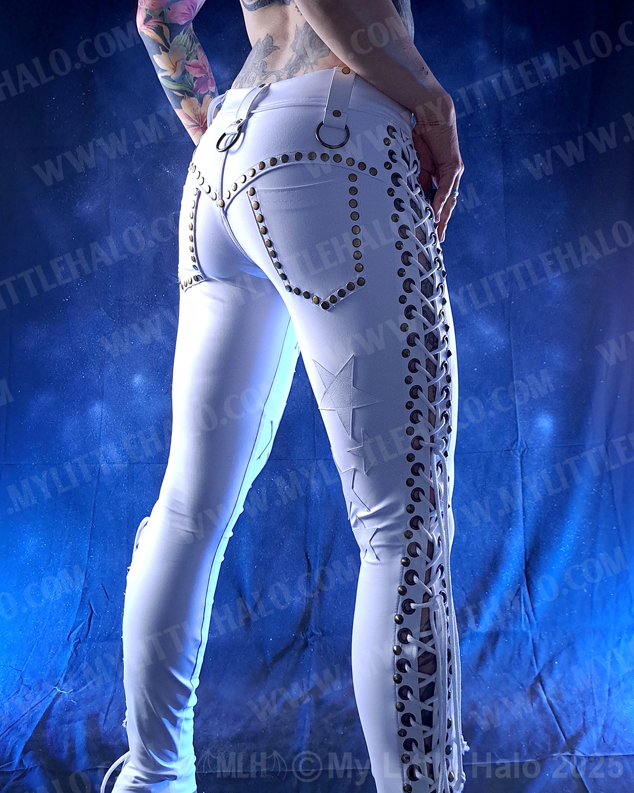 Low waisted, lace up white skinny pants with antique copper eyelets, white lacing, leather stars, belt loops, brass O-rings and lace up fly