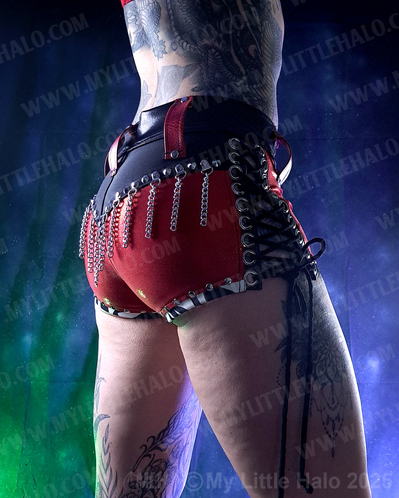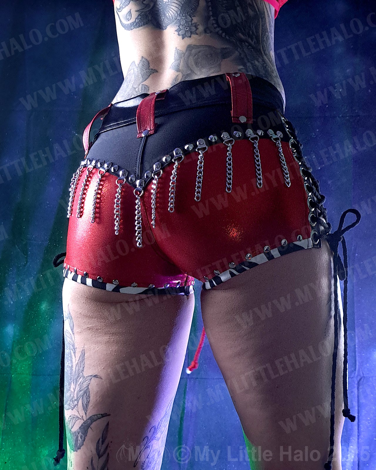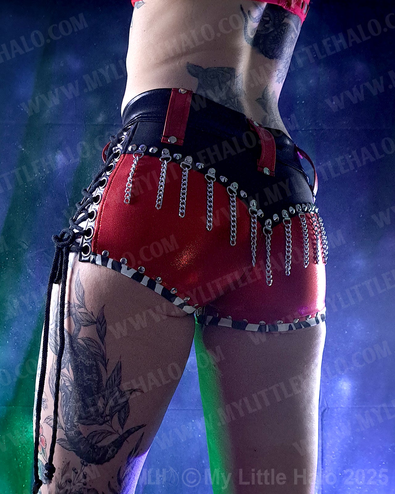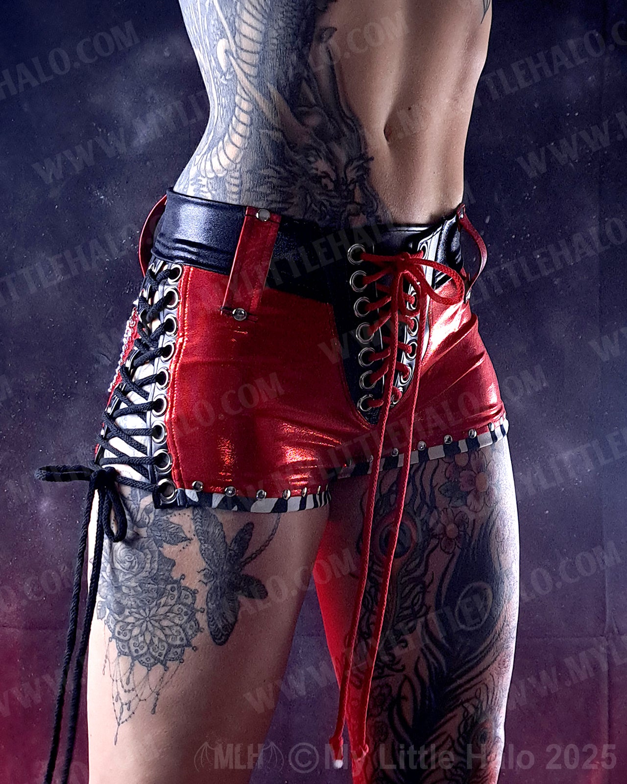 Low rise lace up shorts in red with zebra print trim, silver rivets, black faux leather lace up sides, lace up fly, red belt loops and silver chain fringe at the back. One of a kind.
