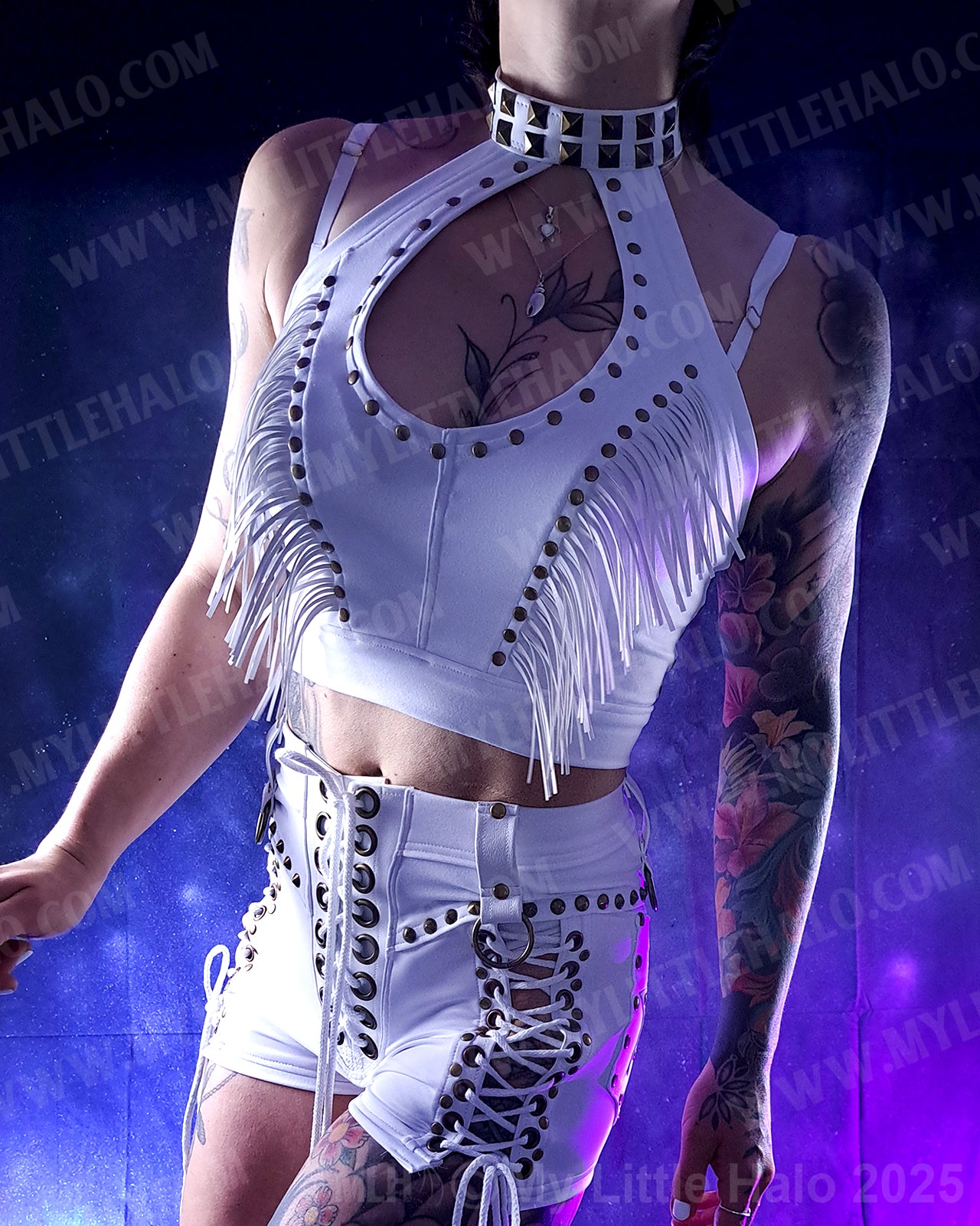 White stretch crop top with faux leather fringed bust, brass rivets, pyramid rivet choker strap and lace up and back