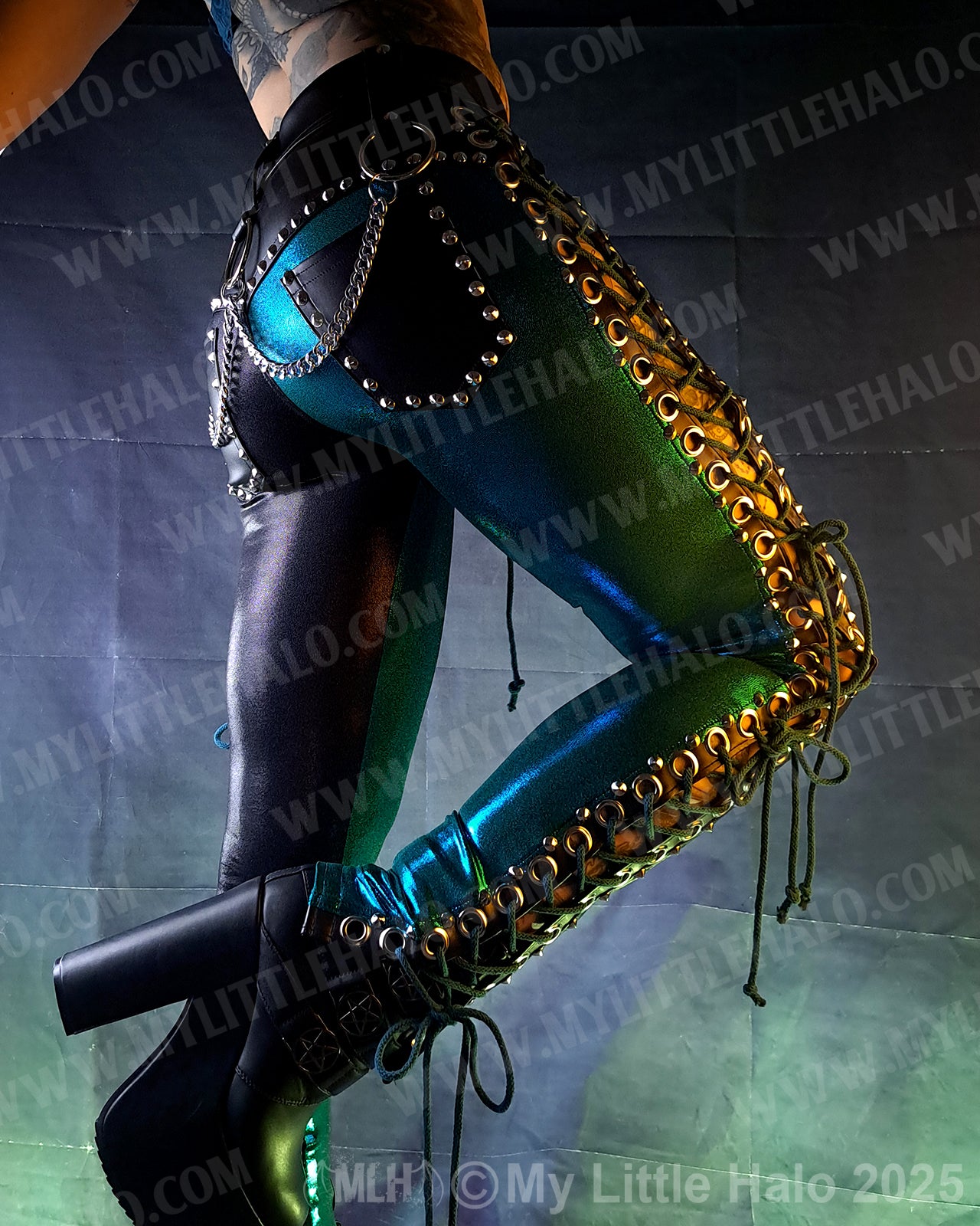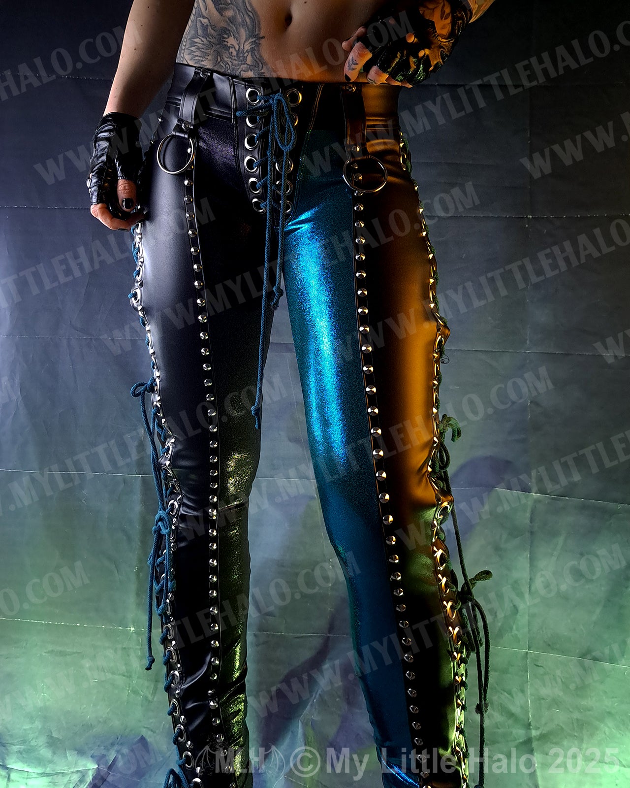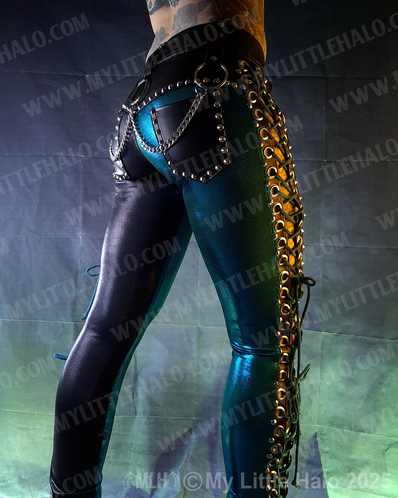 Lace up side pants, in black & teal metallic spandex with open lace up sides, silver eyelets, rivets & lacing. Lace up fly, O-rings & silver chains