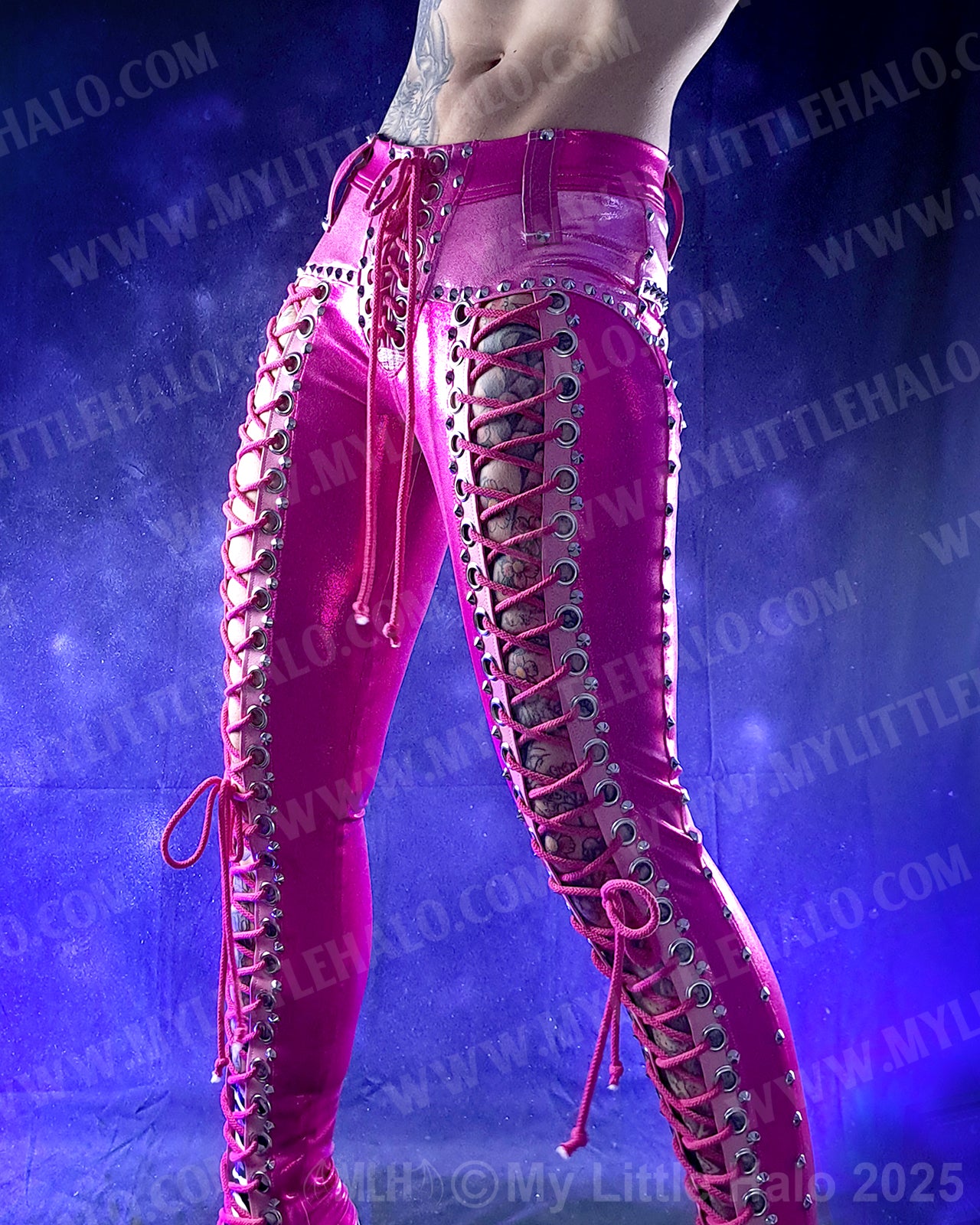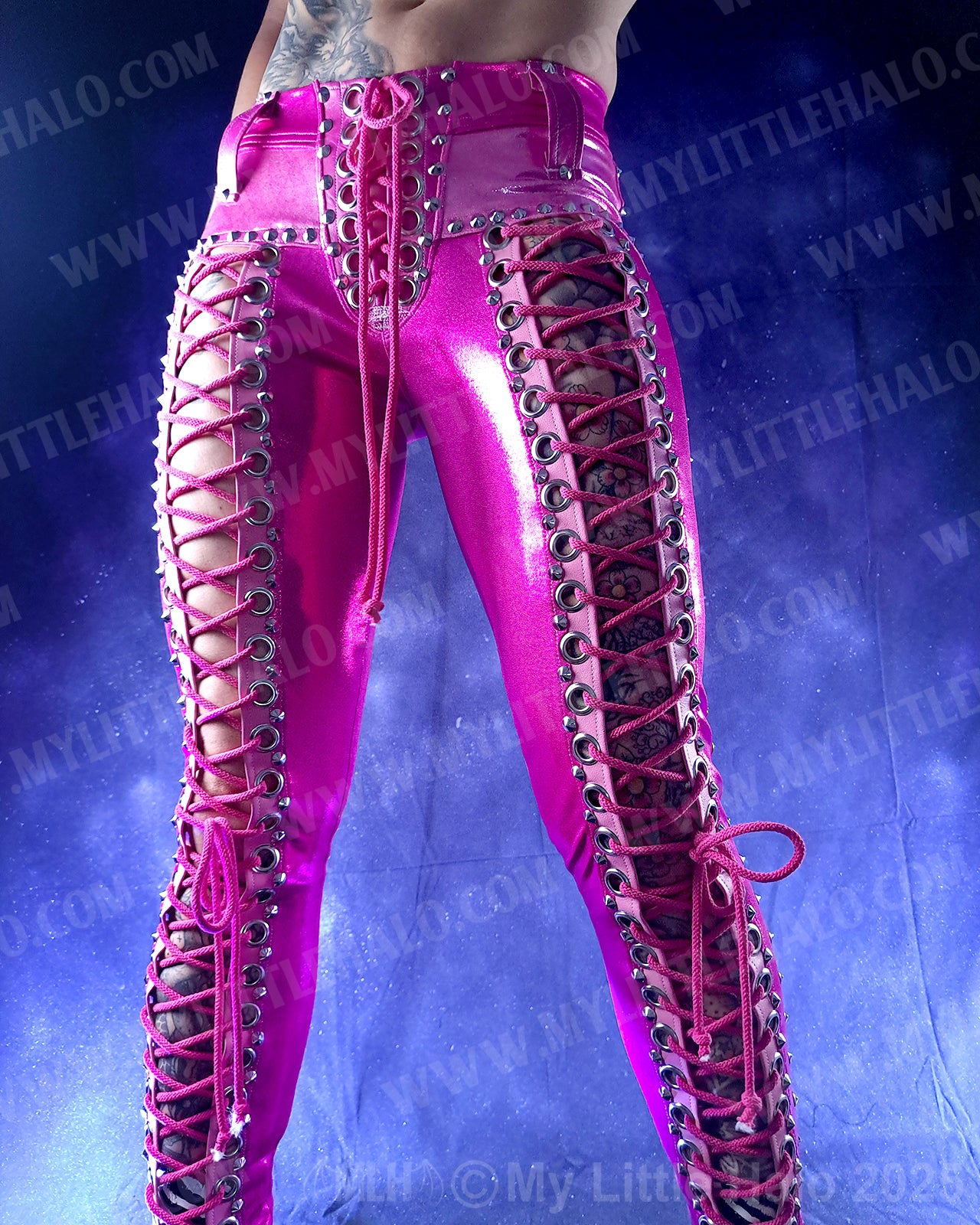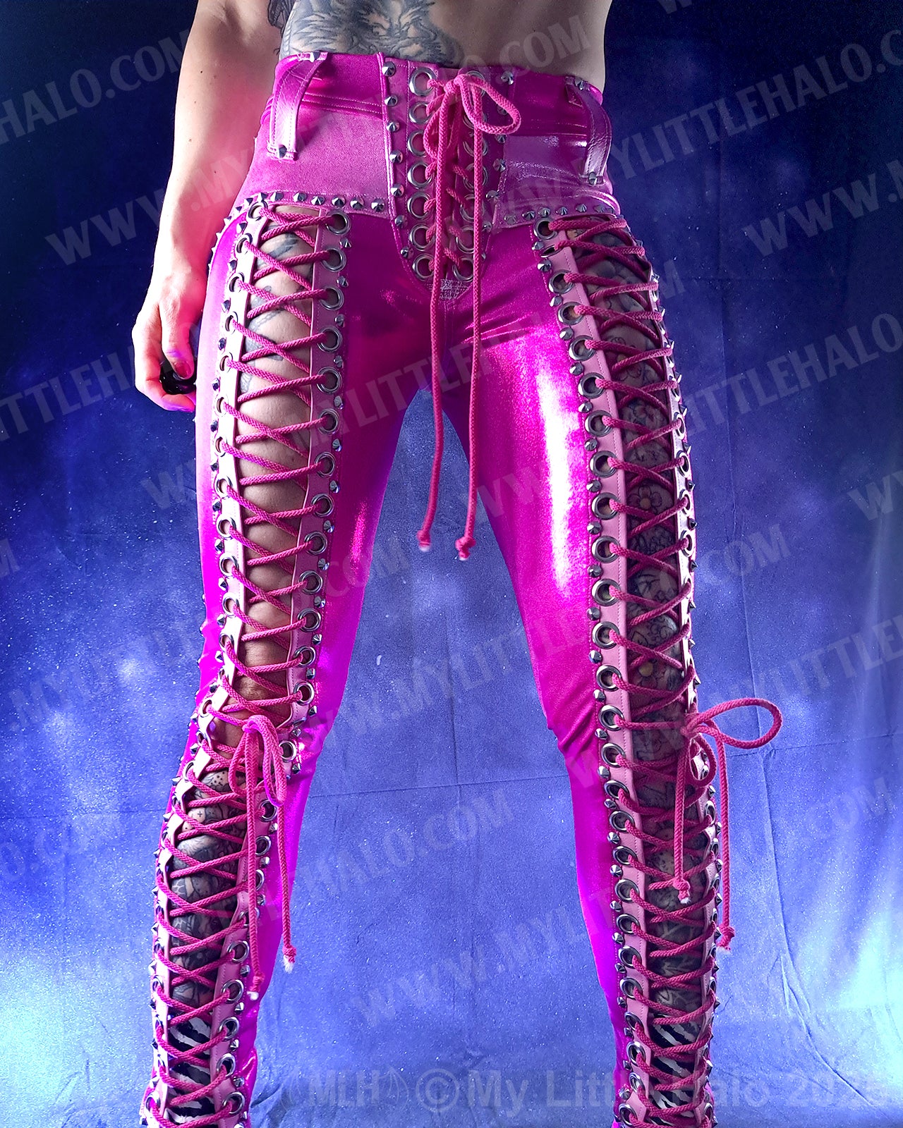 Low waisted, lace up pants in dark pink spandex with open lace up fronts featuring silver eyelets, cone rivets and pink lacing, light pink riveted overlays, back pockets with stars and riveted side seams. The pants have a high stretch spandex waist with faux leather belt loops and lace up fly. One of a kind!