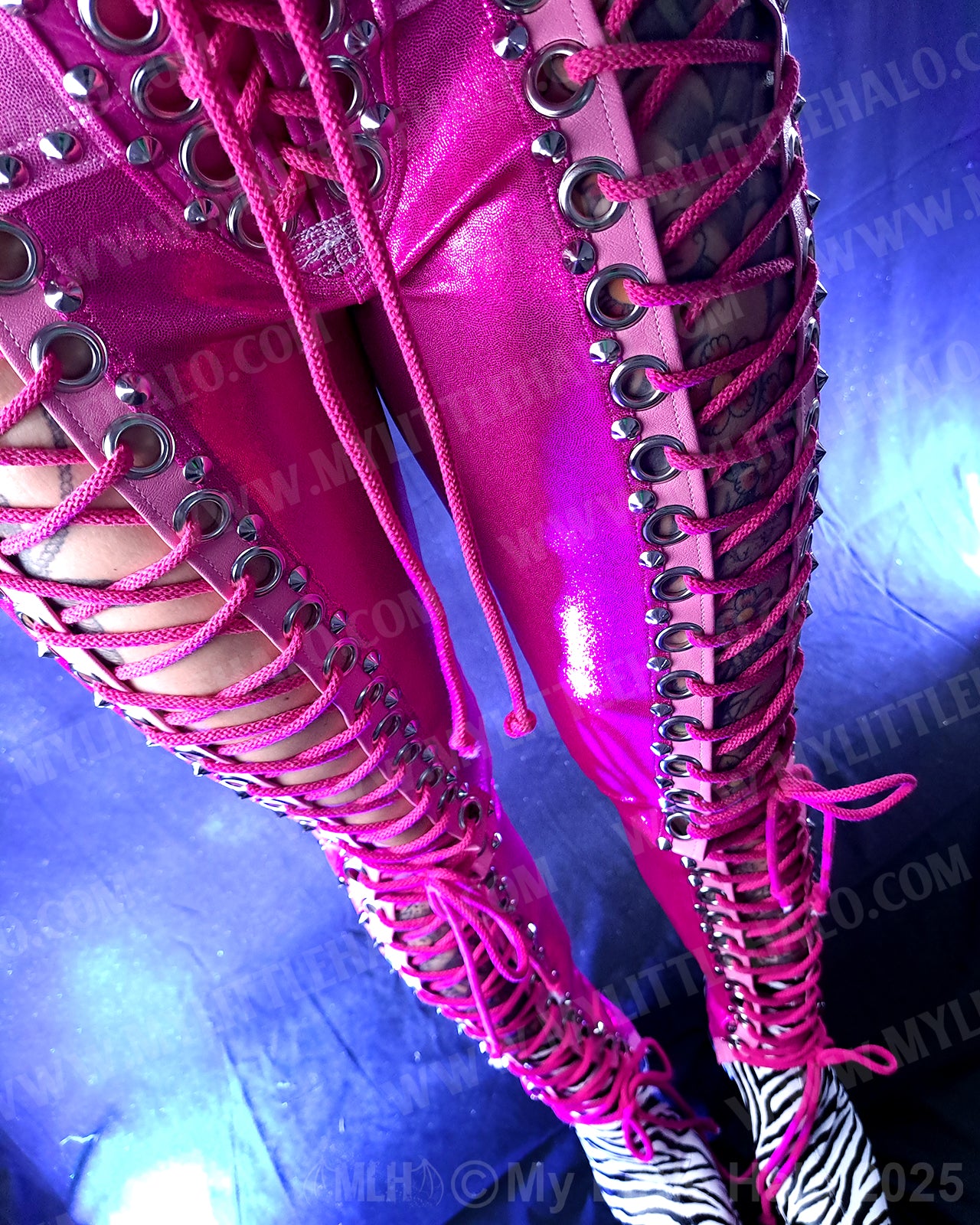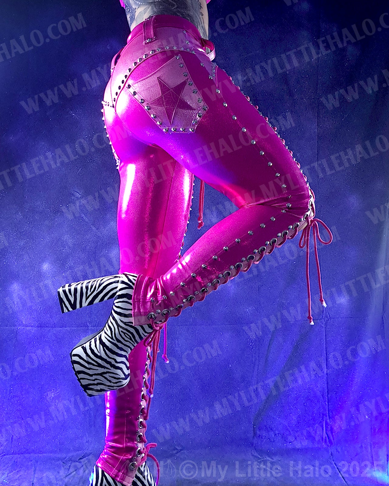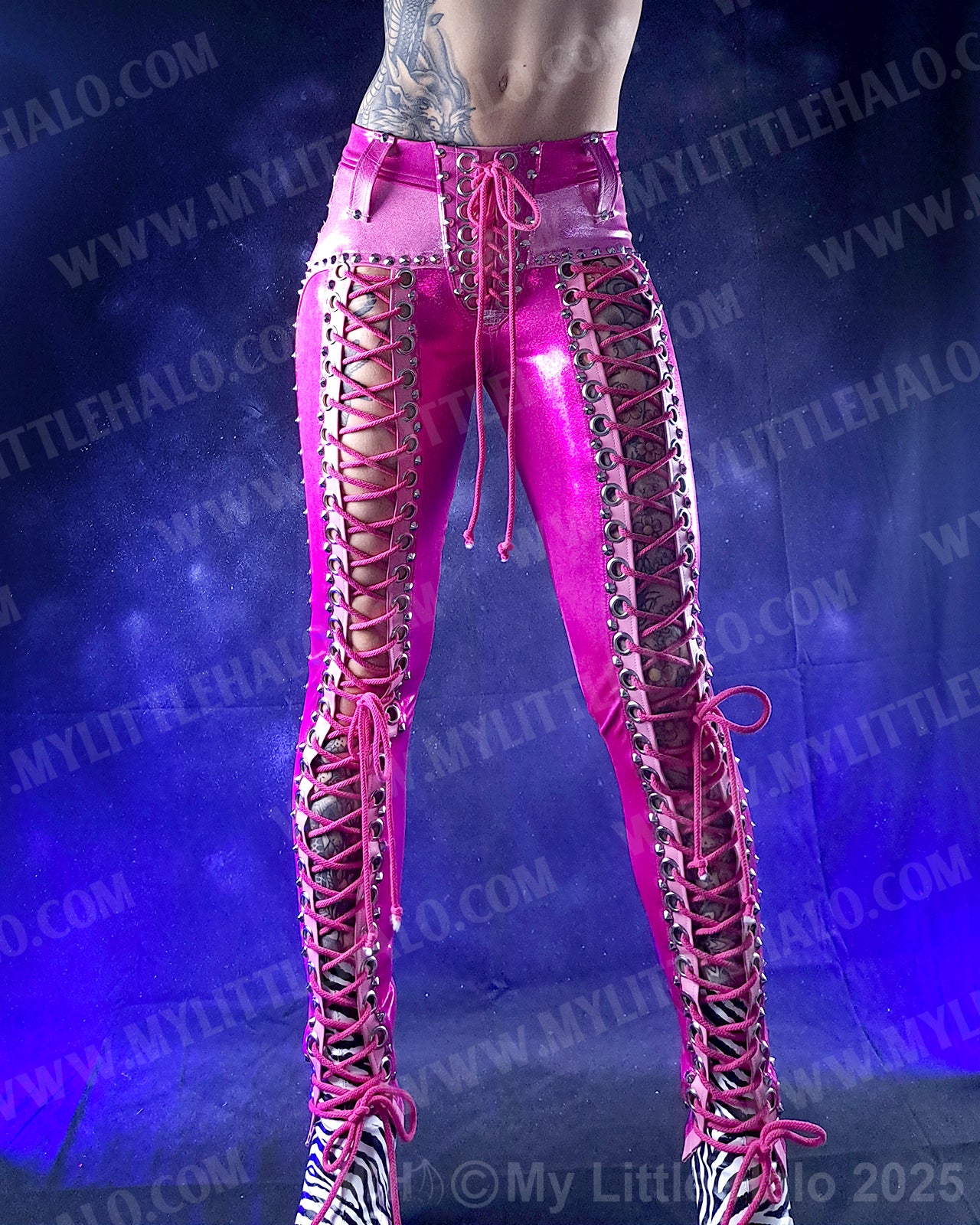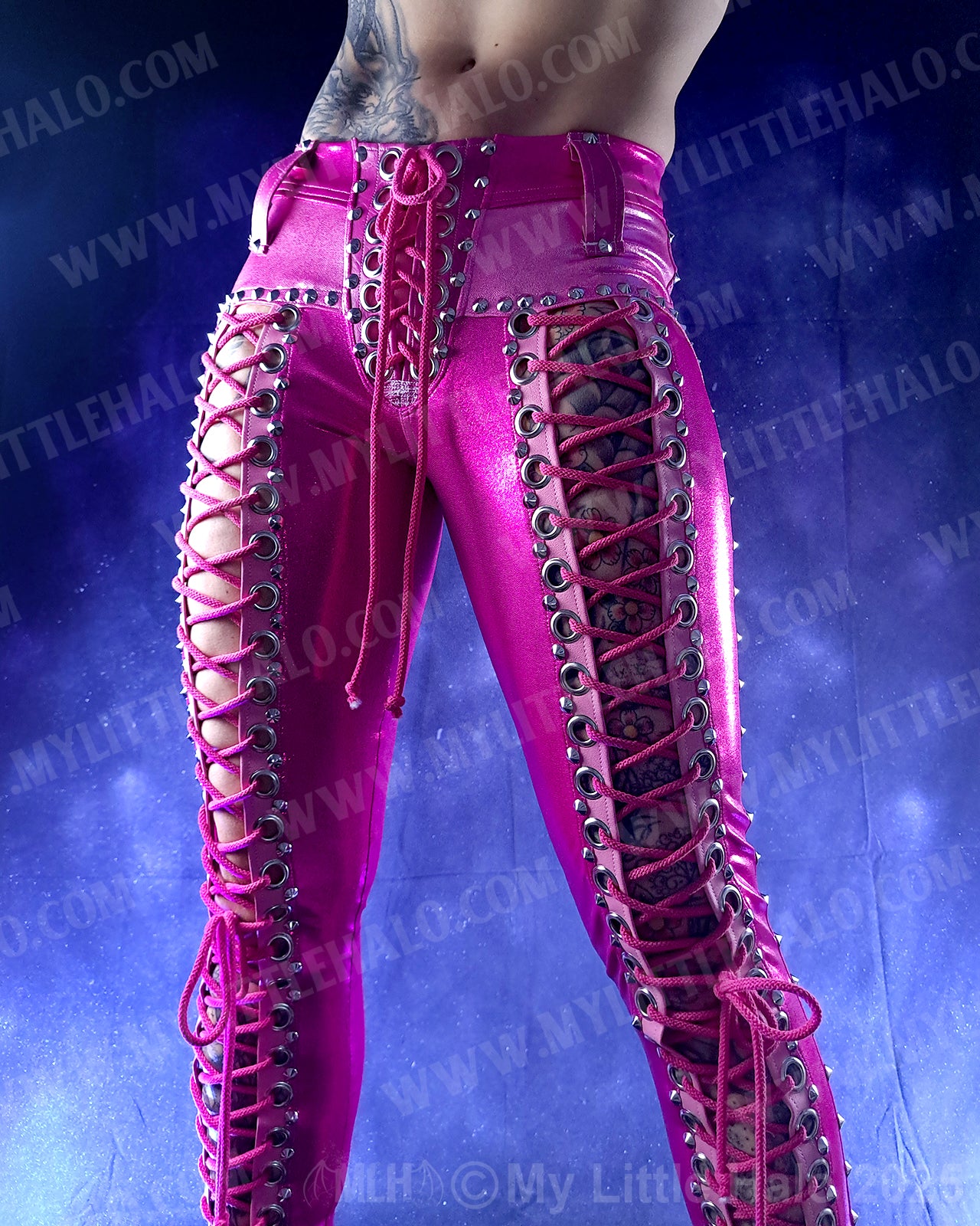 Low waisted, lace up pants in dark pink spandex with open lace up fronts featuring silver eyelets, cone rivets and pink lacing, light pink riveted overlays, back pockets with stars and riveted side seams. The pants have a high stretch spandex waist with faux leather belt loops and lace up fly. One of a kind!