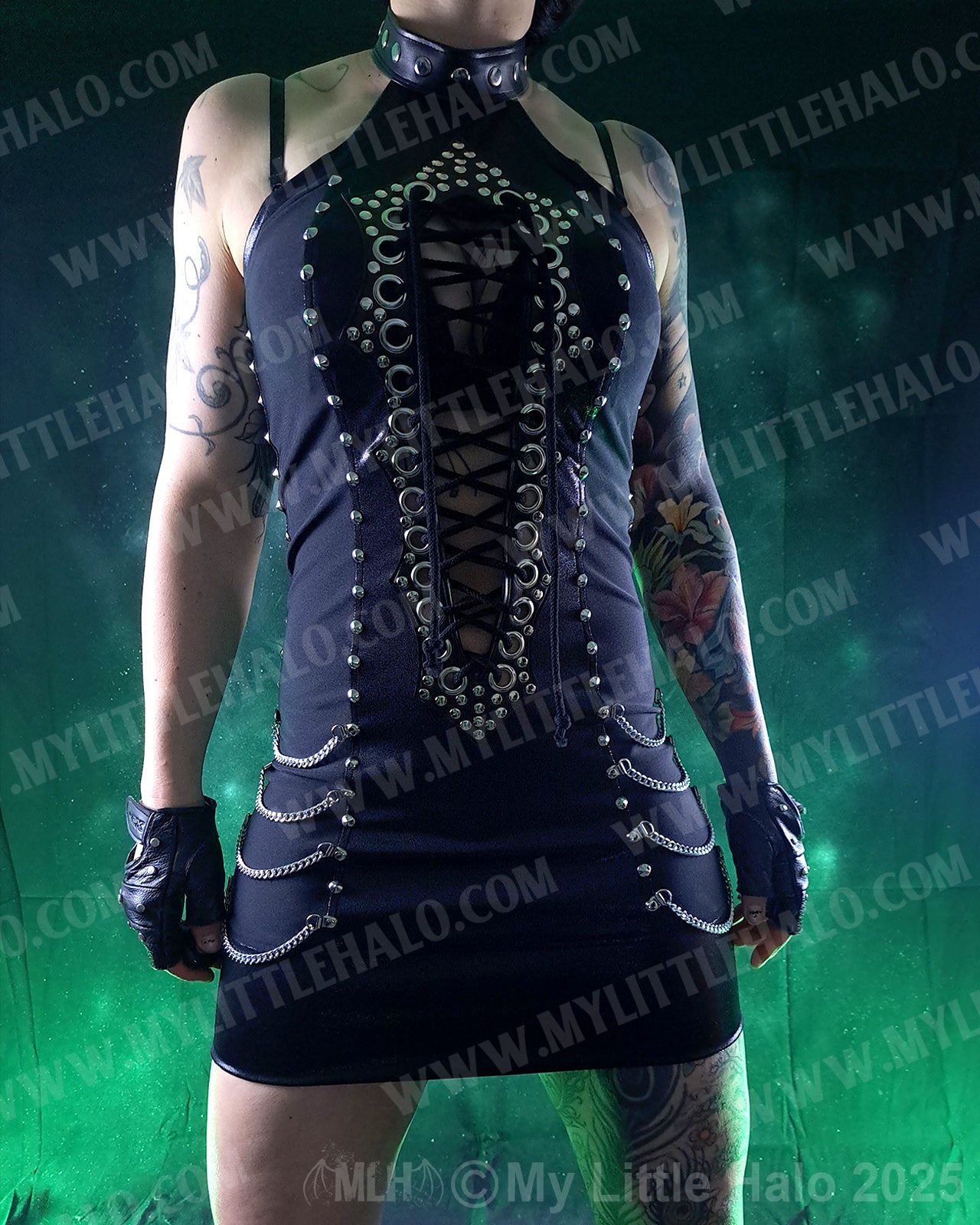 Gothic, black, mini dress with lace up, peephole bustline, silver chains on the hips & choker style halter-neck strap