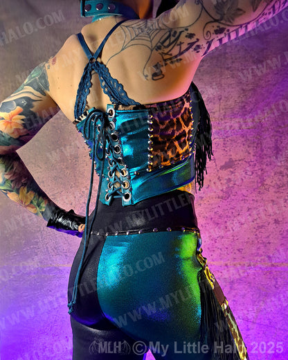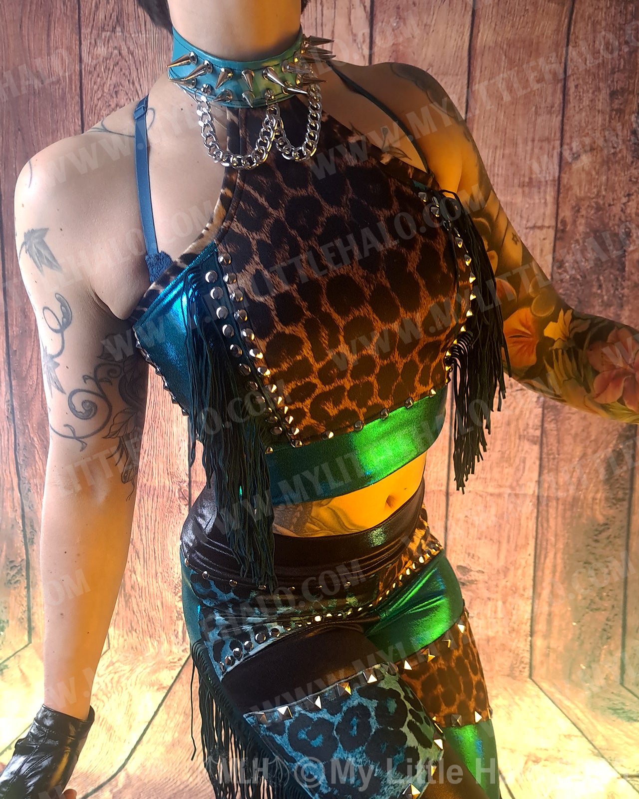 Teal and leopard print stretch, halter neck top with cropped length, spiked choker strap, silver rivets & teal fringe