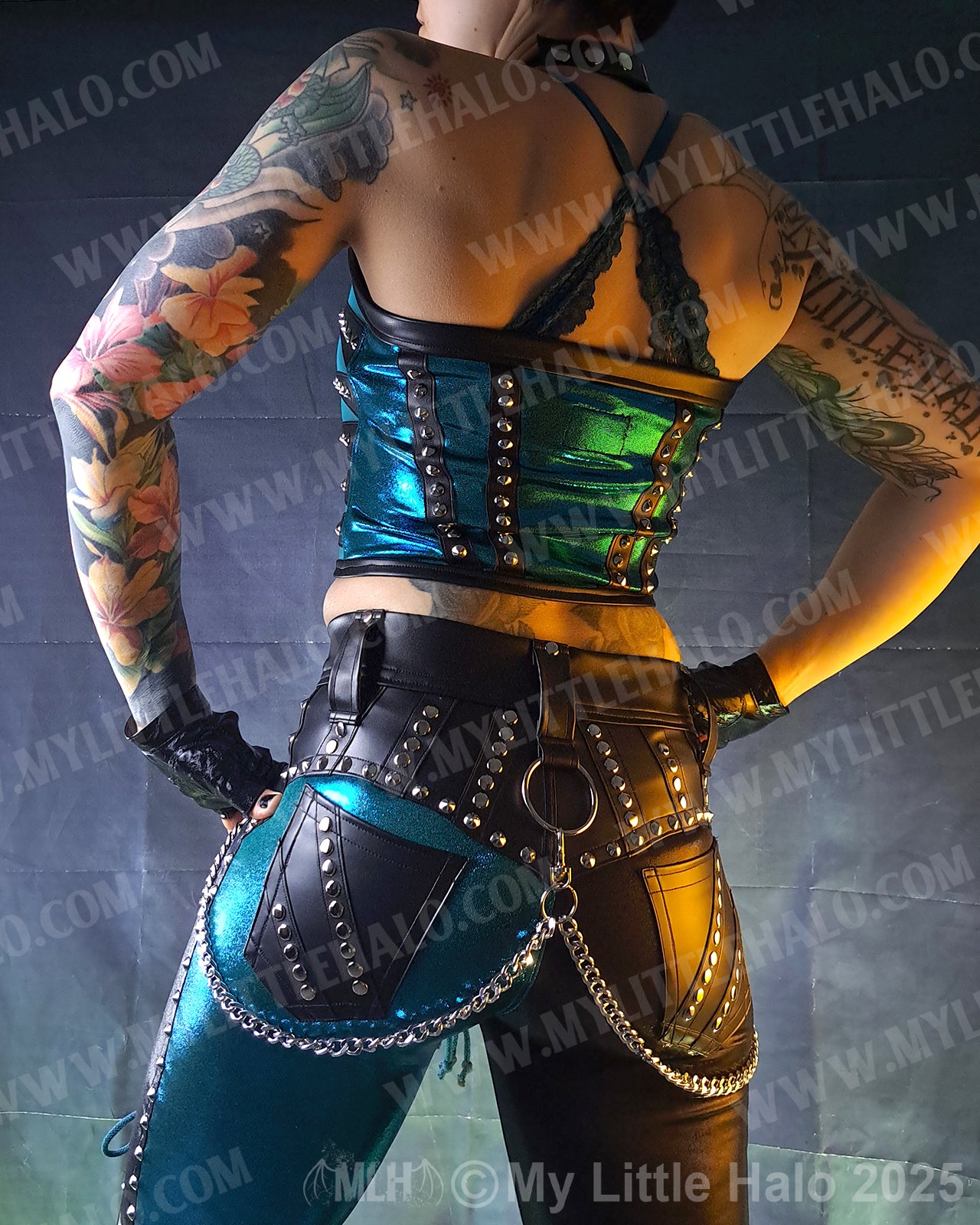Spiked & studded, lace up bustier in teal faux leather & spandex, with lace up front, halter neck strap, claw spiked bust & silver rivets