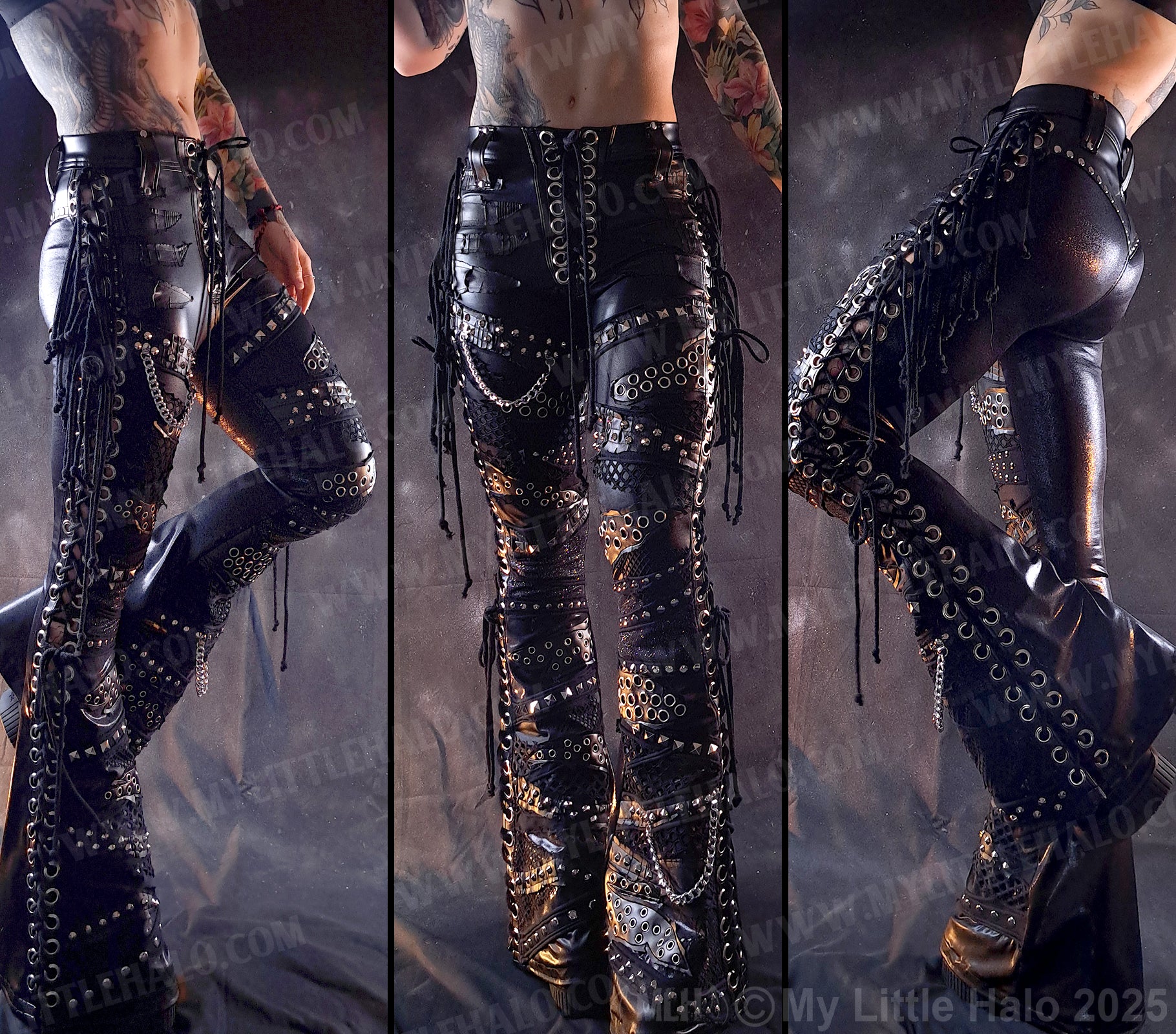 High waisted gothic flares with lace up sides and collage style front, consisting of fishnet, mesh and faux leather with loads of rivets, eyelets and chains. The sides are adjustable from the waist down and the back has riveted faux leather overlays. Wet look front and metallic black spandex back, with stretch leather waist, belt loops and lace up fly. One of a kind pants!