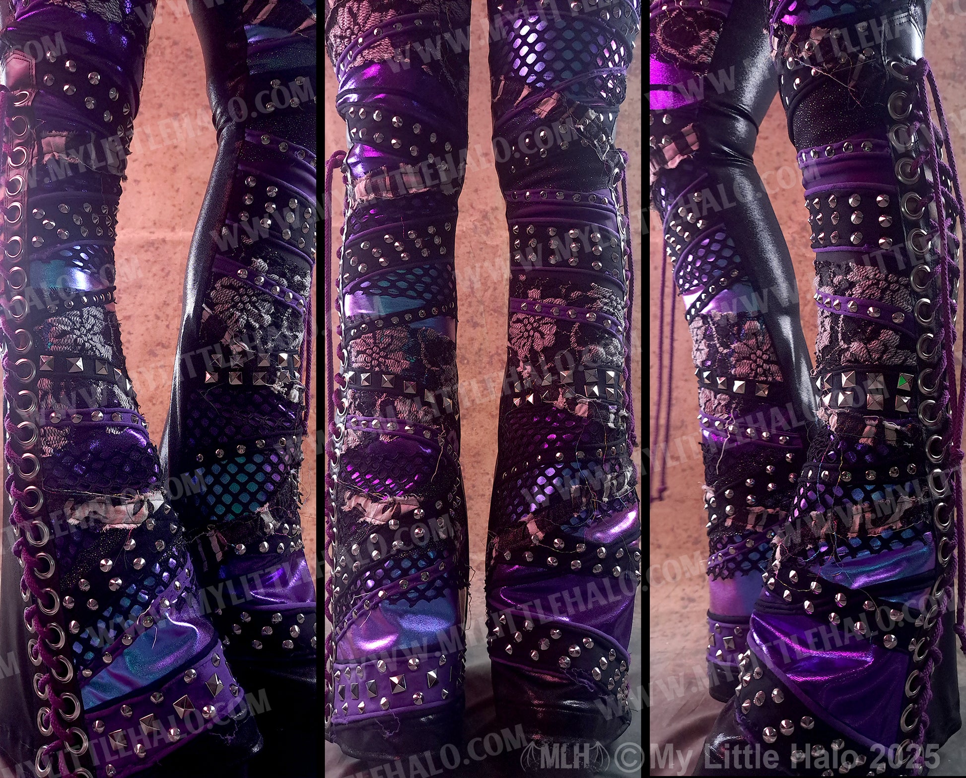 *Black metallic spandex with overlay collage of mermaid holographic fabric, purple lycra, fishnet, glitter mesh & lace