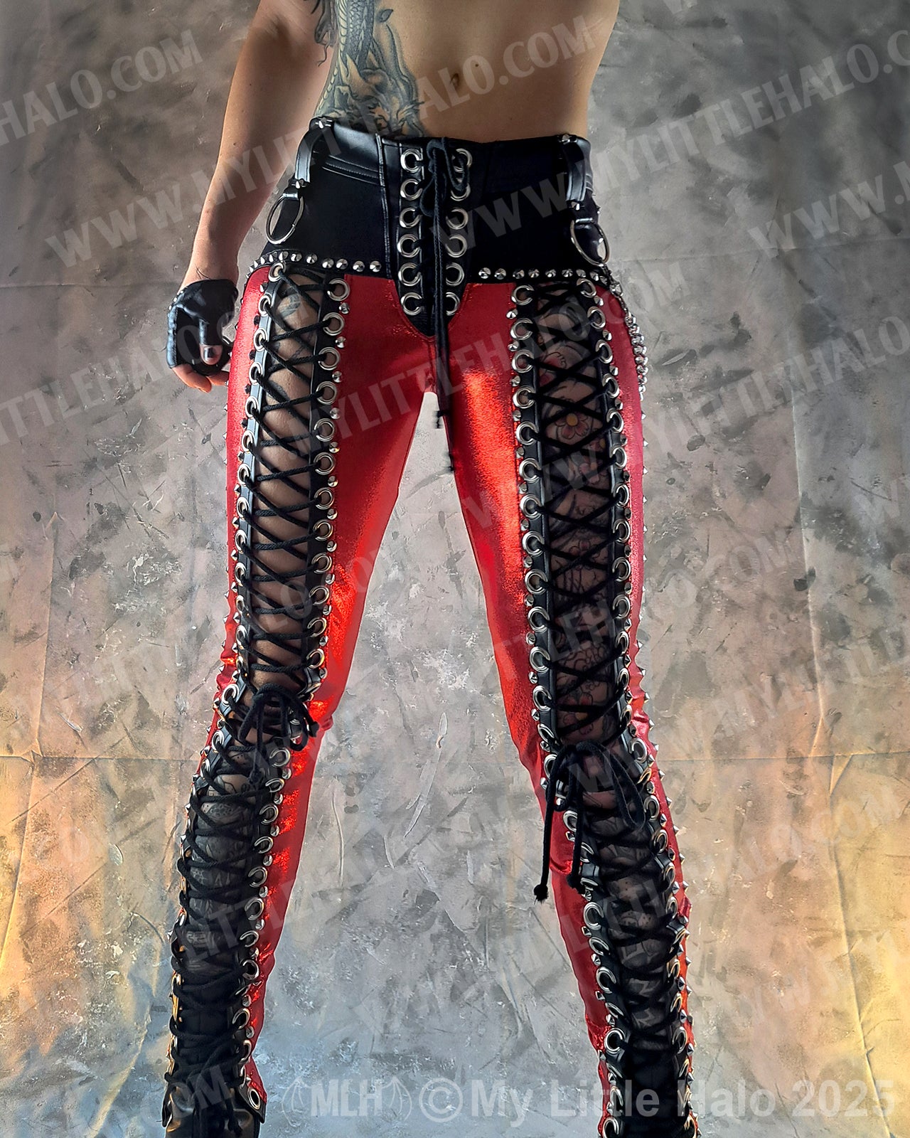 Low rise, skinny leg, lace up pants in red and black, with open lace up front, lace up fly, belt loops, O-rings and chains