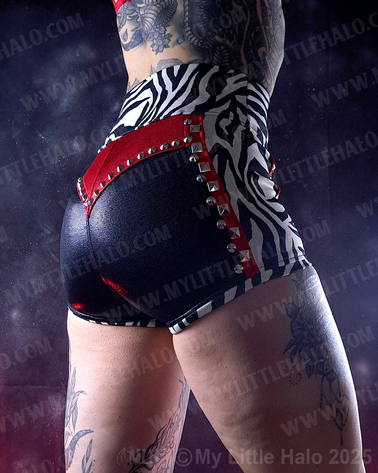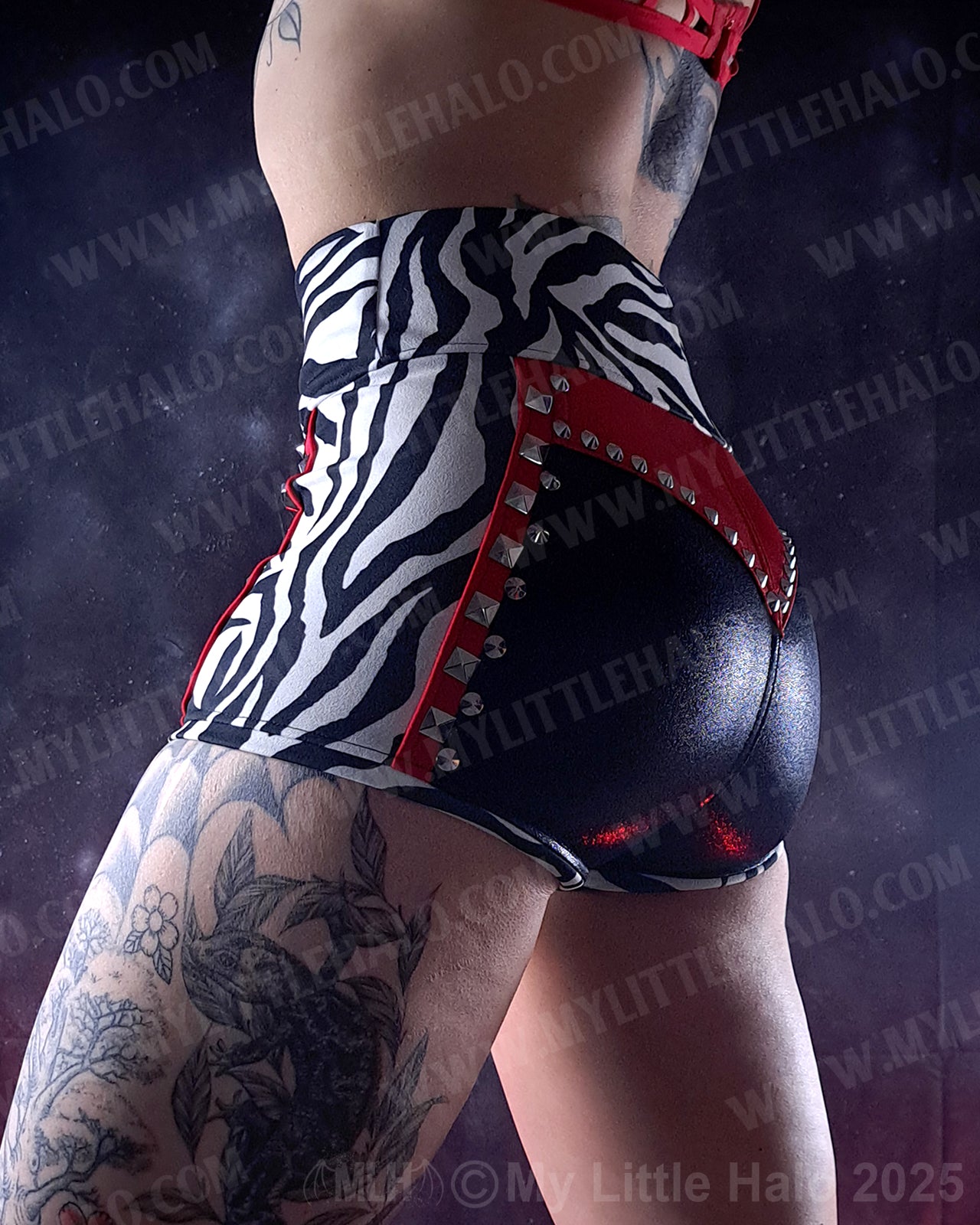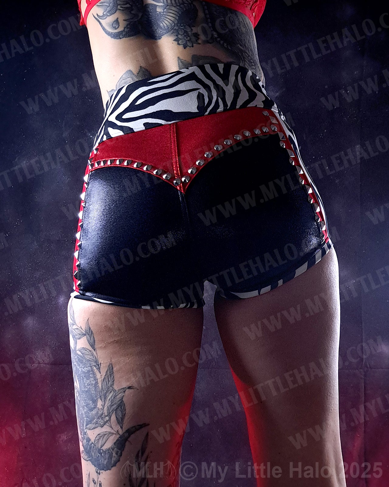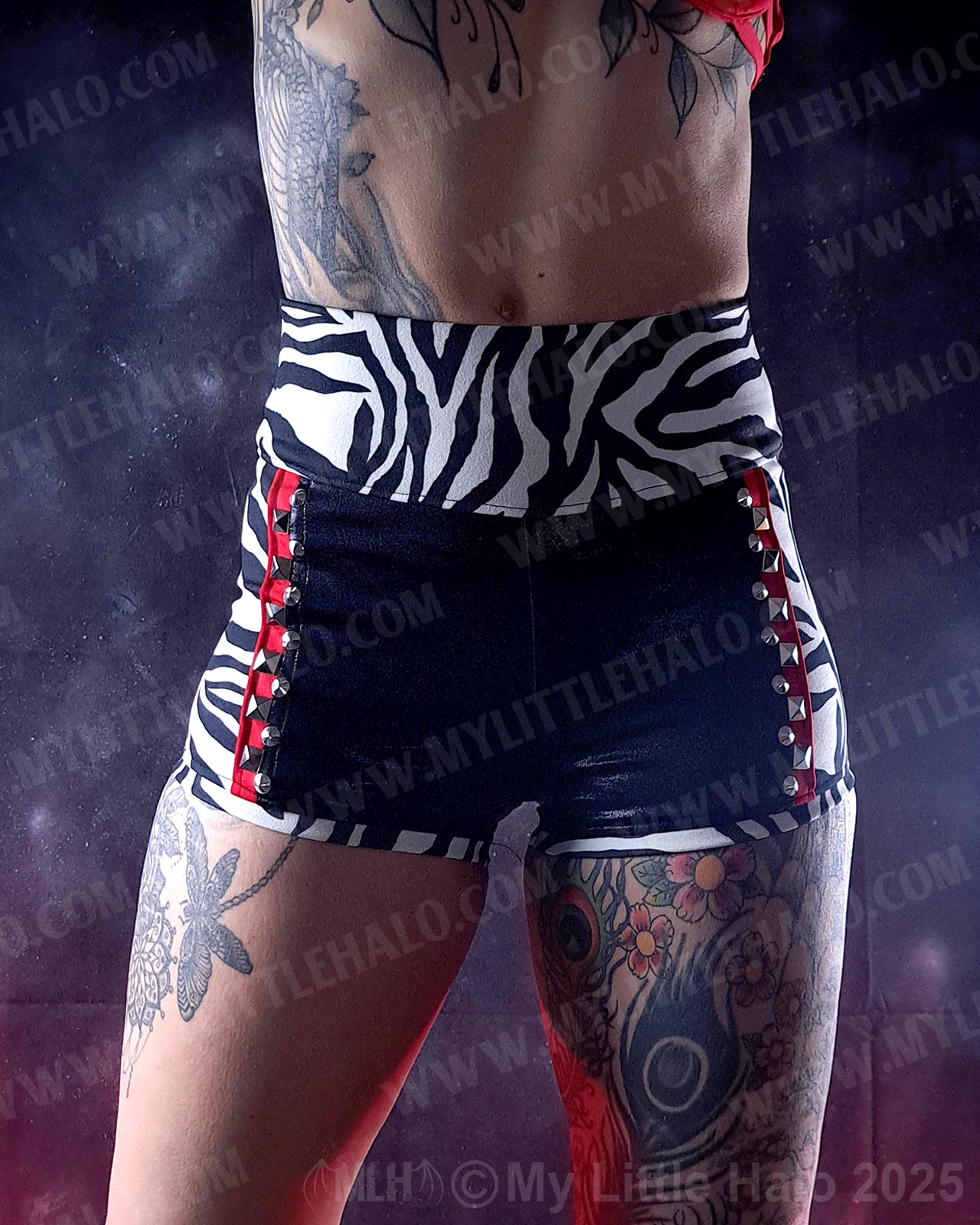 High waisted zebra print hotpants with accents of red and black and silver rivets and wide, stretch high waistband. Made with metallic spandex and scuba fabrics. One of a kind item.