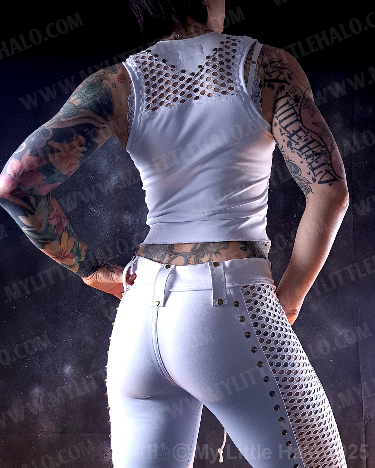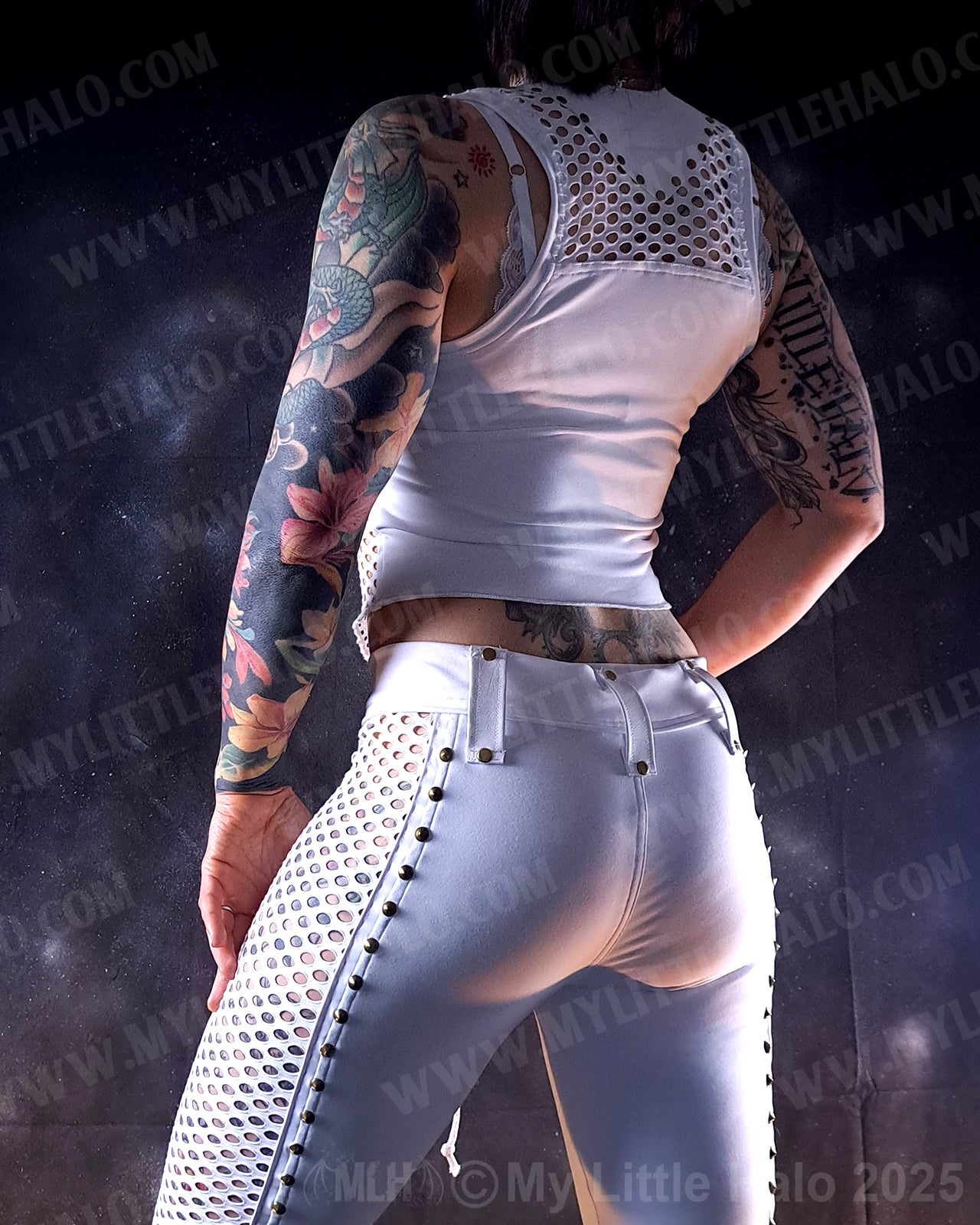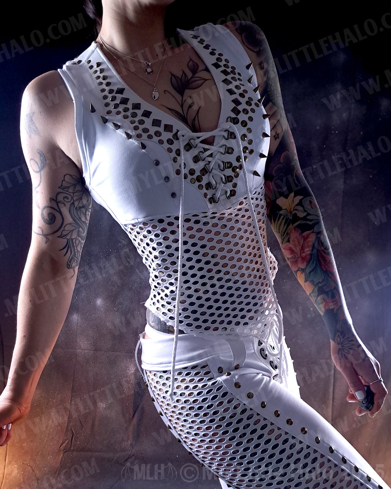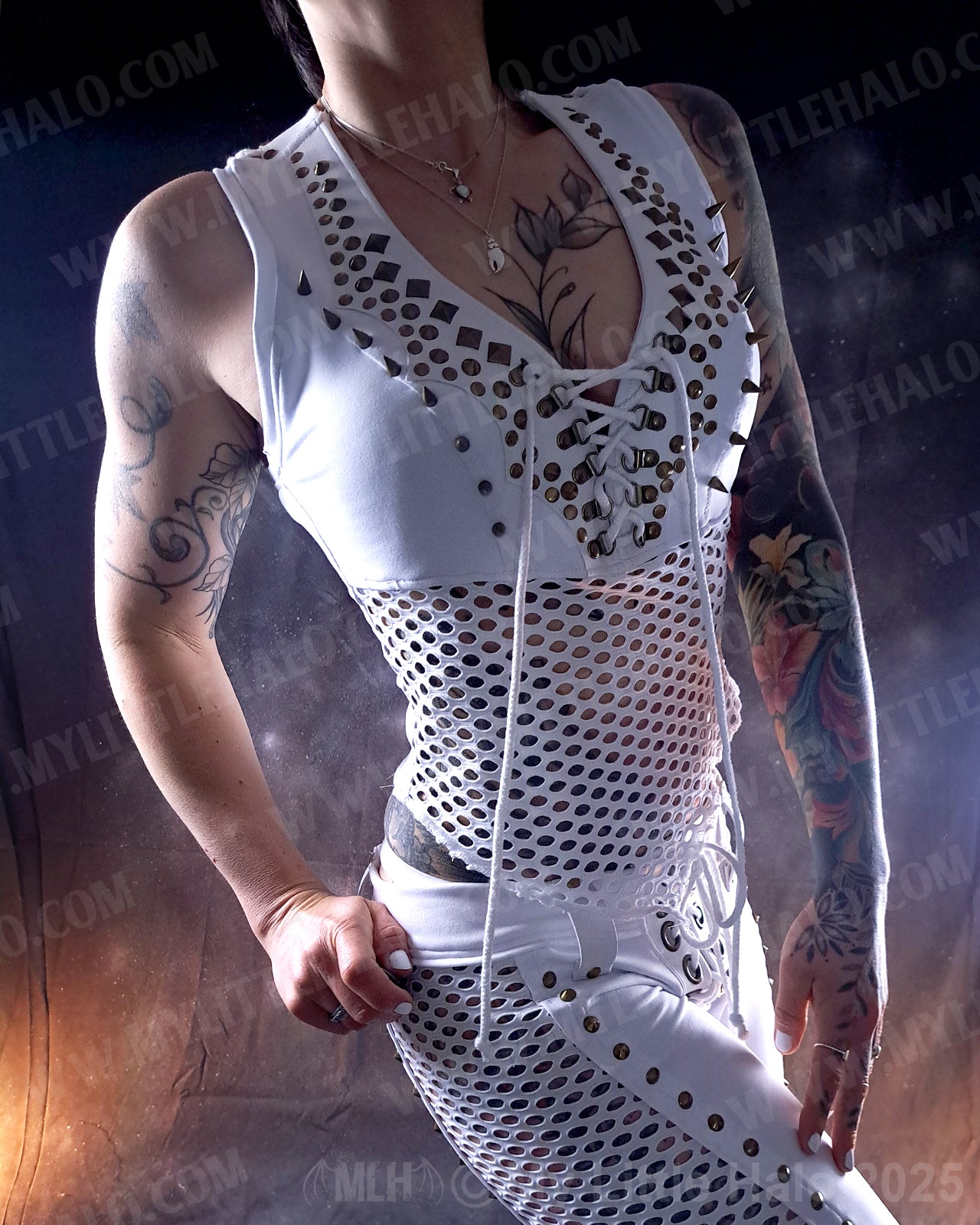 White, glam rock chick vest with lace up bust, antique brass spikes and rivets, with white pothole fishnet panels front and back