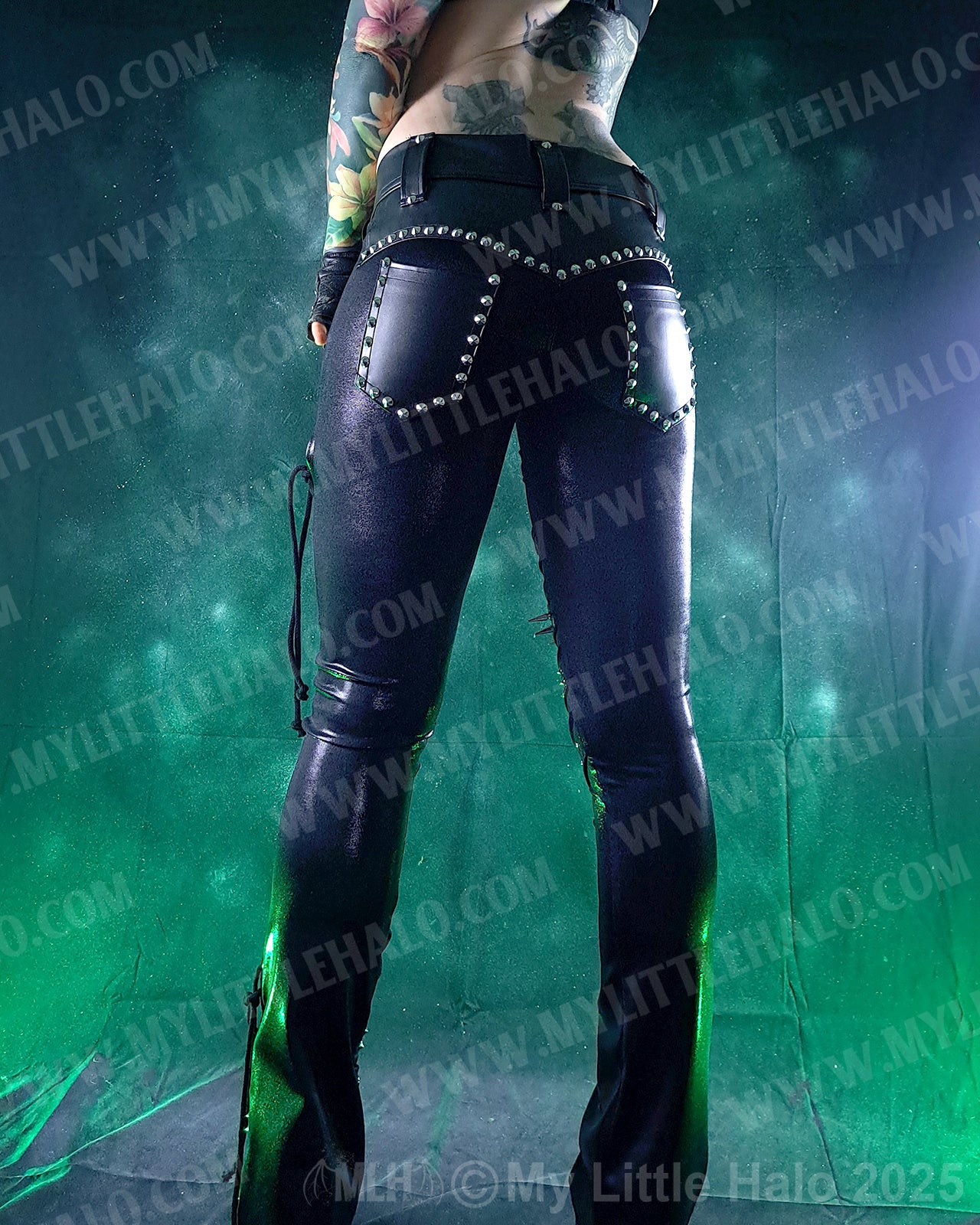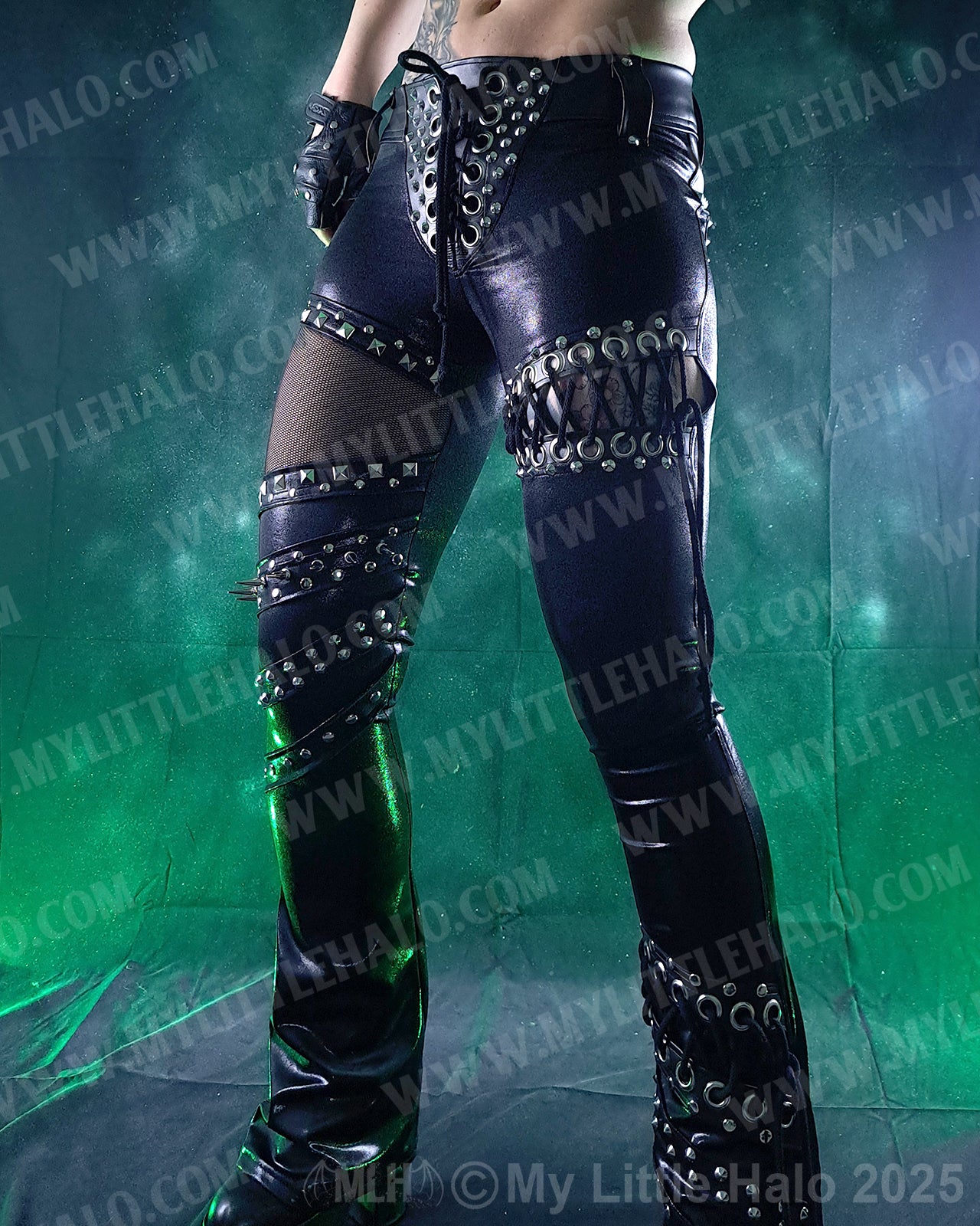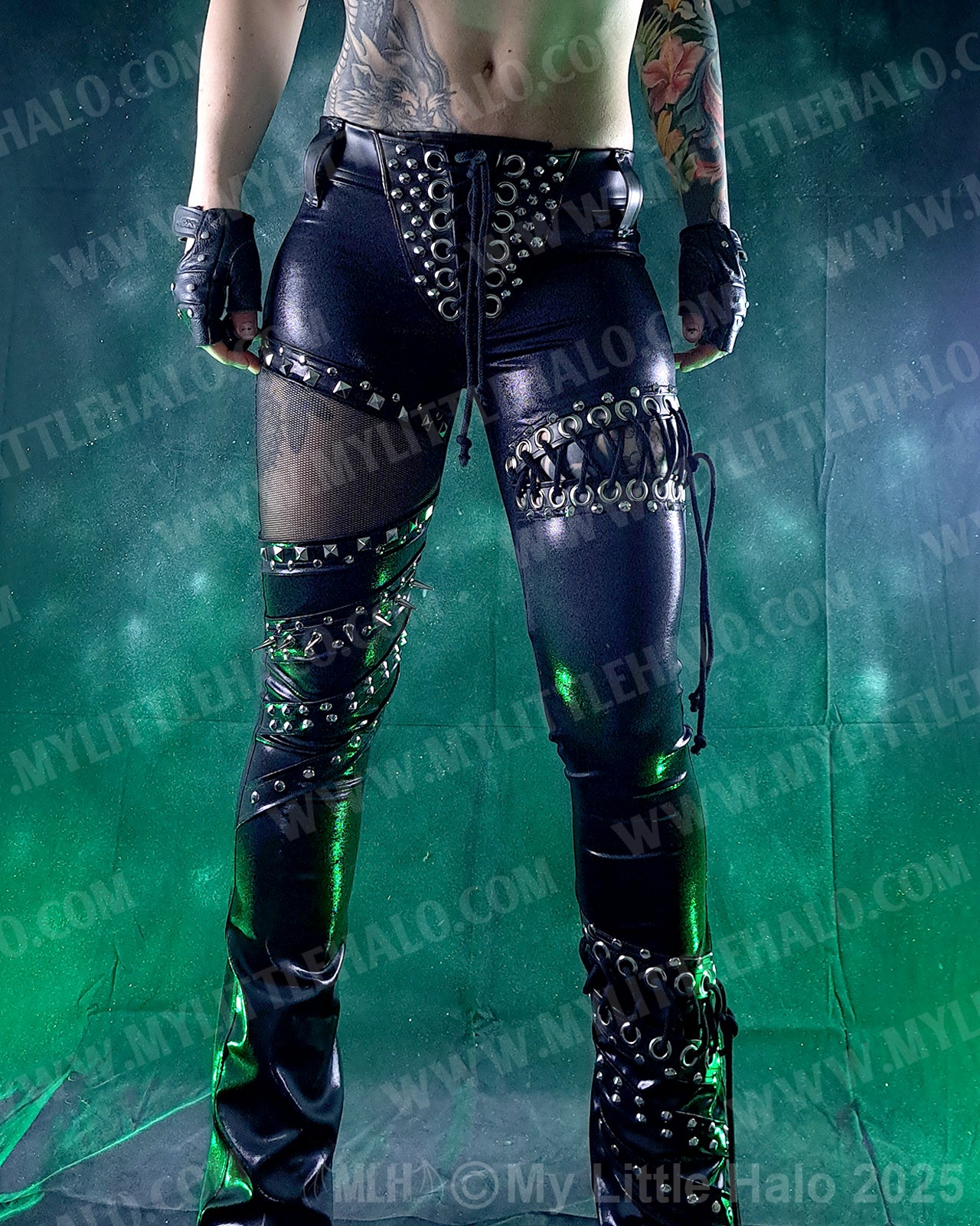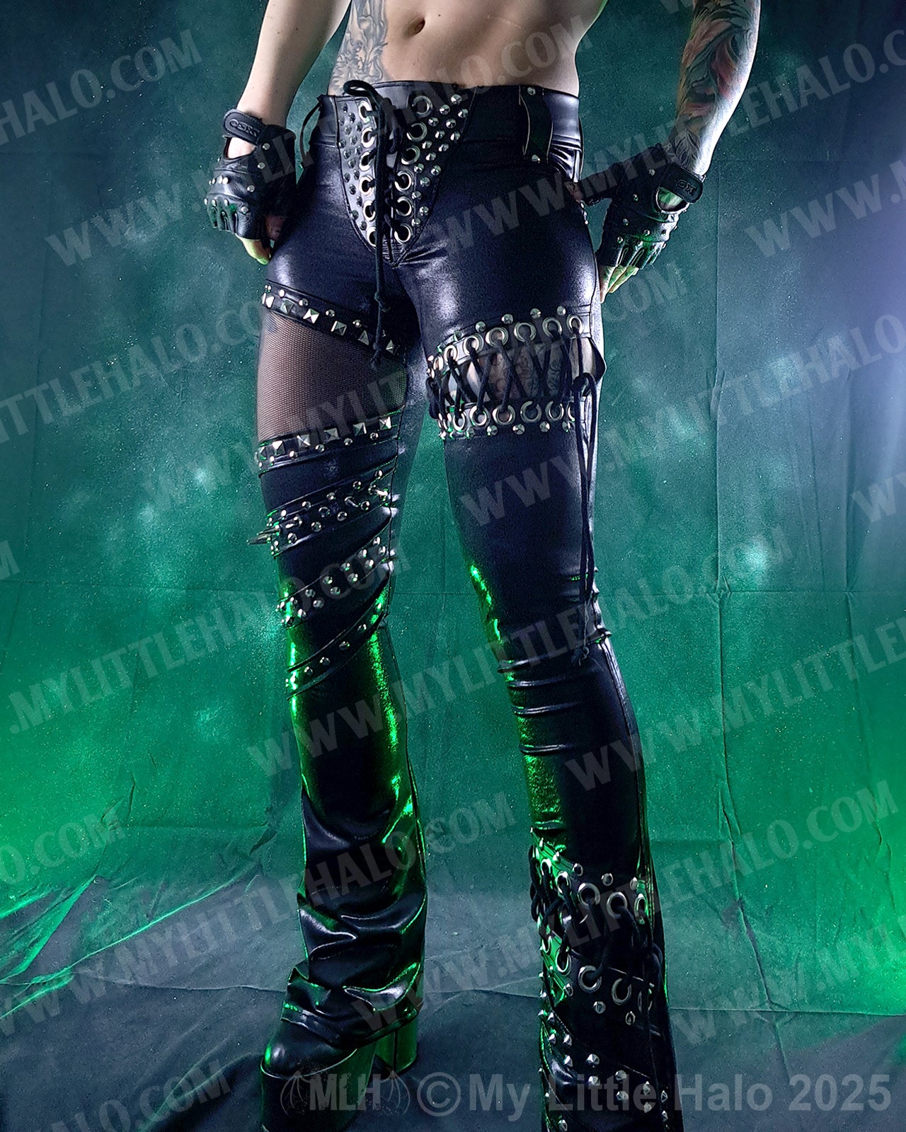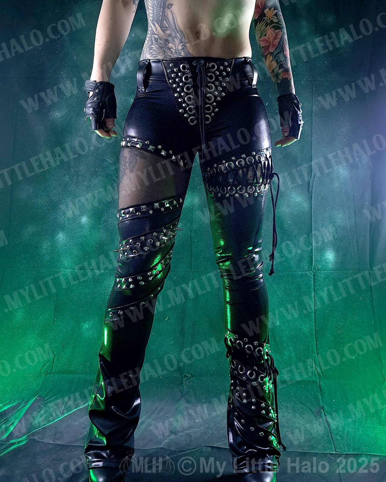 Spiked, gothic boot cut, flare pants with lace up panels, silver spikes, rivets, mesh panel and lace up fly