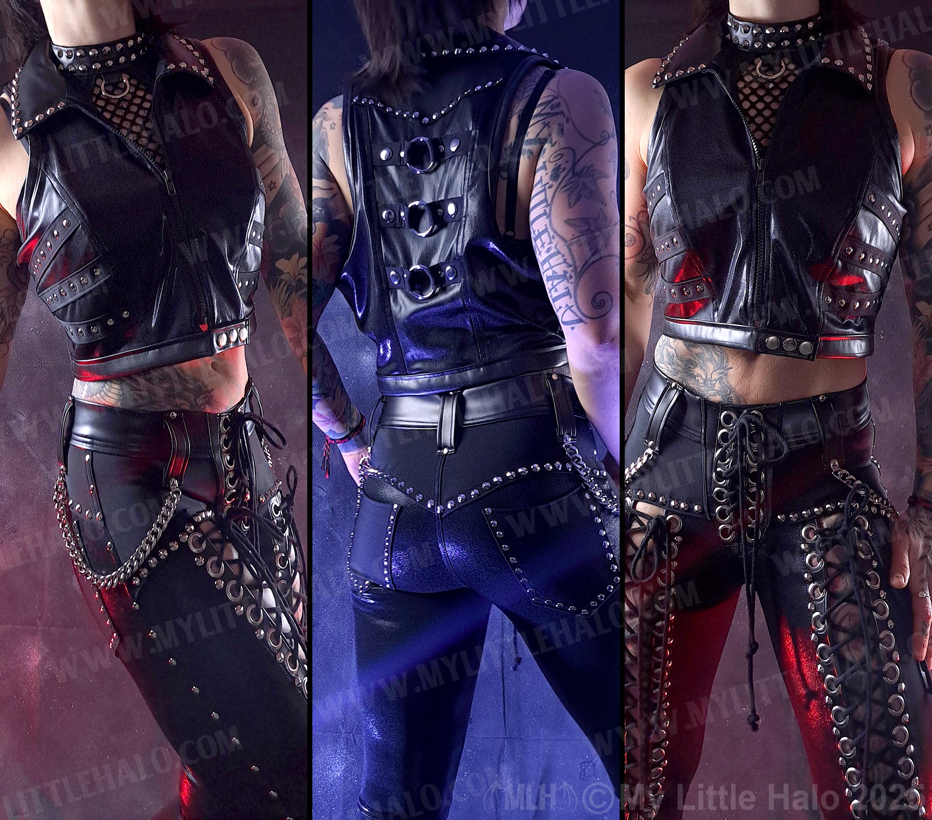 Loose fit cropped vest/jacket made with black spandex, wet look and faux leather. Silver riveted side panels and O-ring centre panel at the back. Zip front with popper fastening and faux leather collar with silver rivets. Lined with soft black spandex.