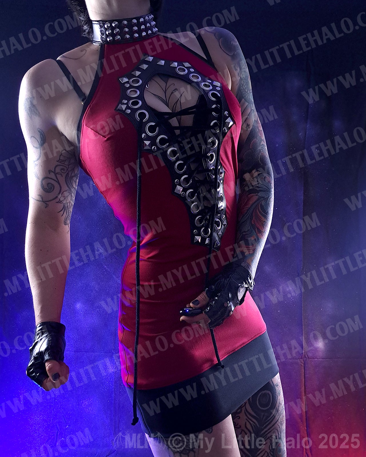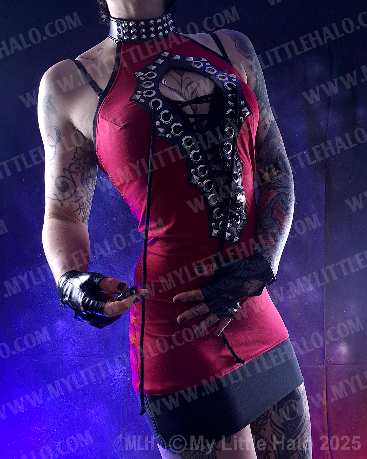 Deep red, lace up mini dress with studded, choker style halter strap, black faux leather peephole and lace up bust