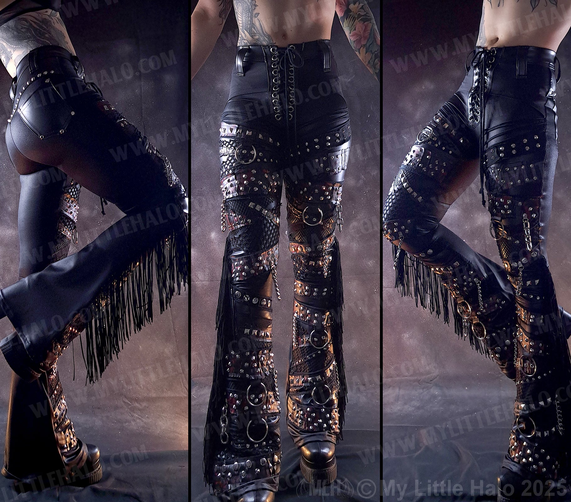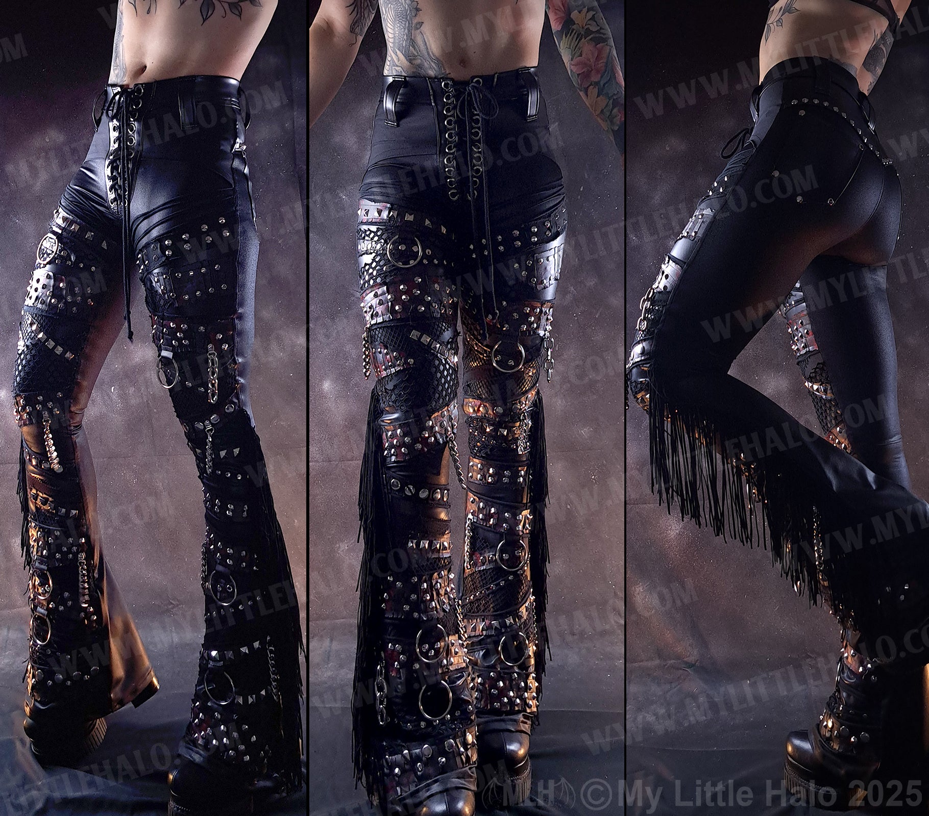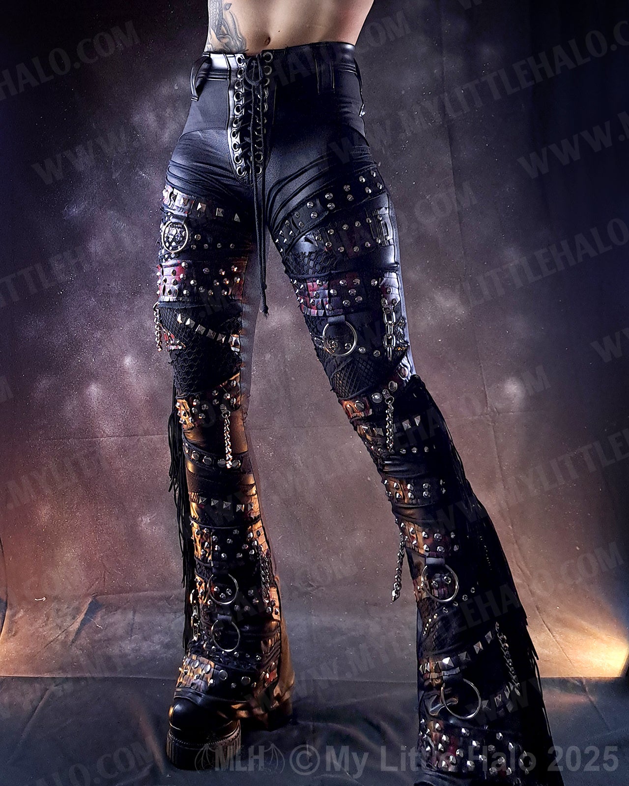 One of a kind gothic flares made with blood splatter studded leather detail, faux suede fringe, silver rings and chains. With a matte spandex base fabric and collage of faux leather, fishnet & hand-painted blood splatter faux leather. Super high waisted with lace up fly, belt loops, riveted overlays and pockets at the back.