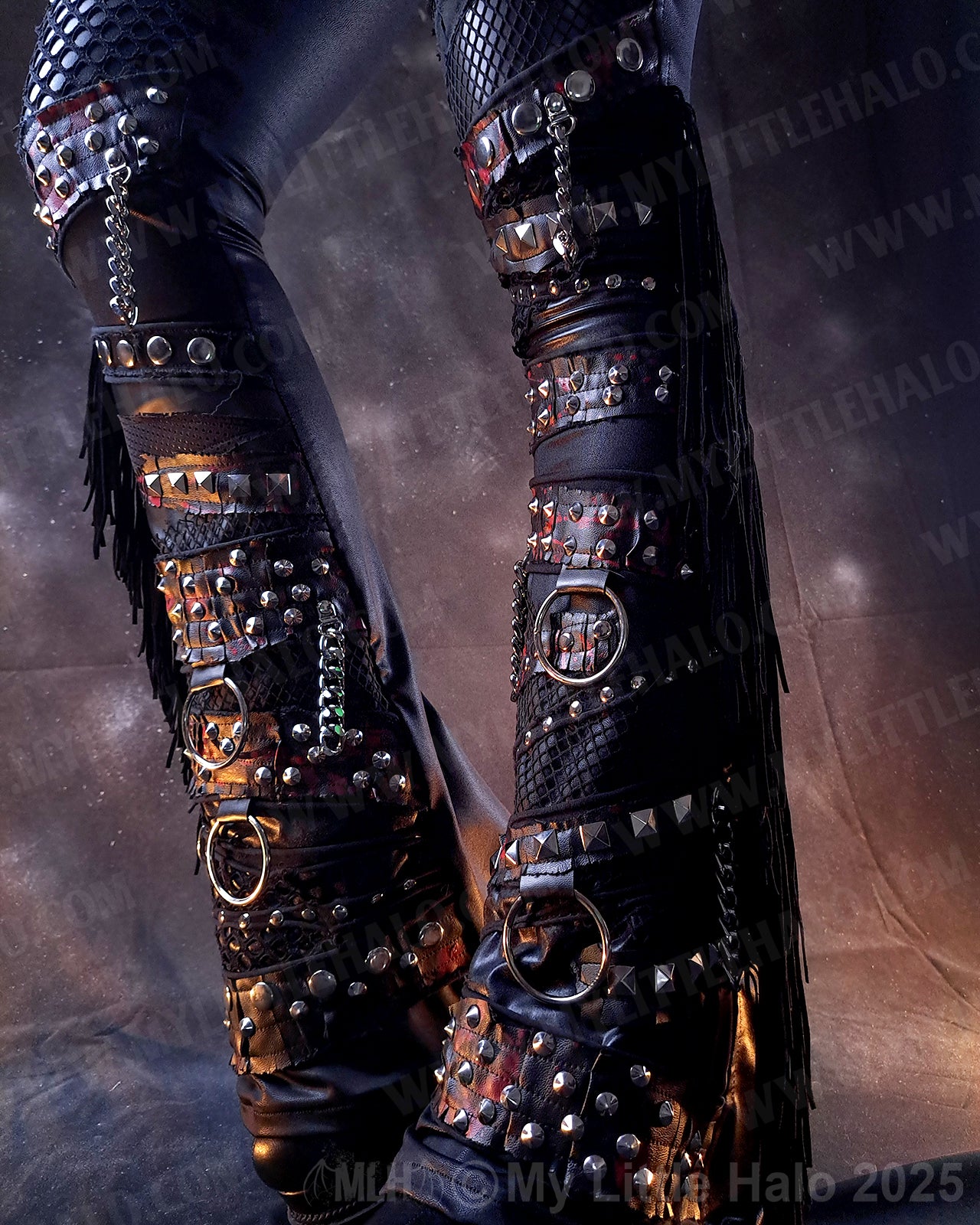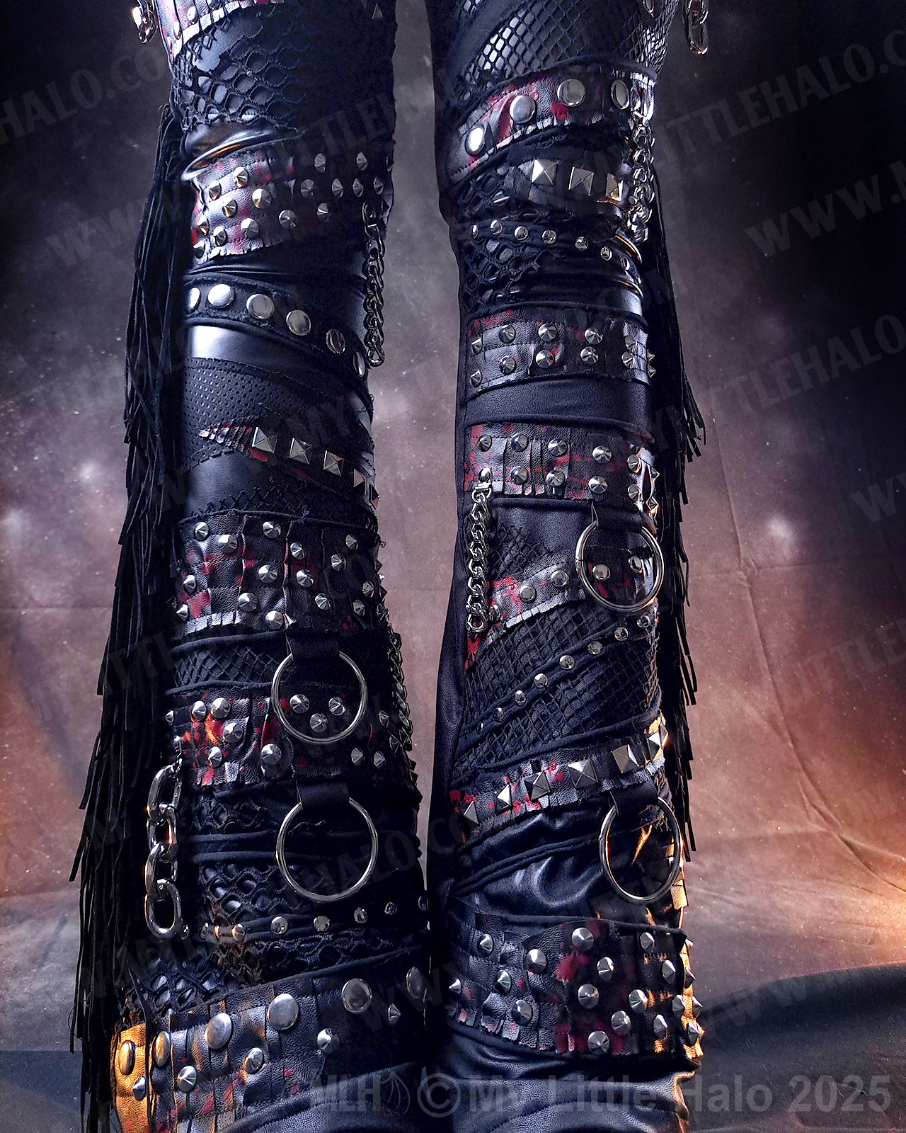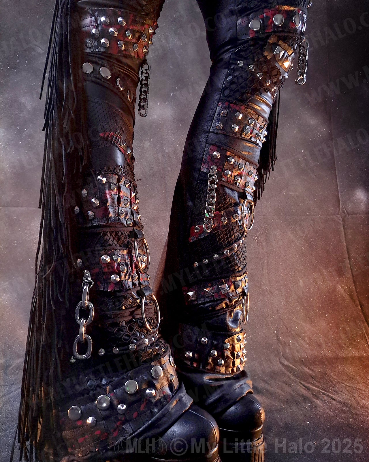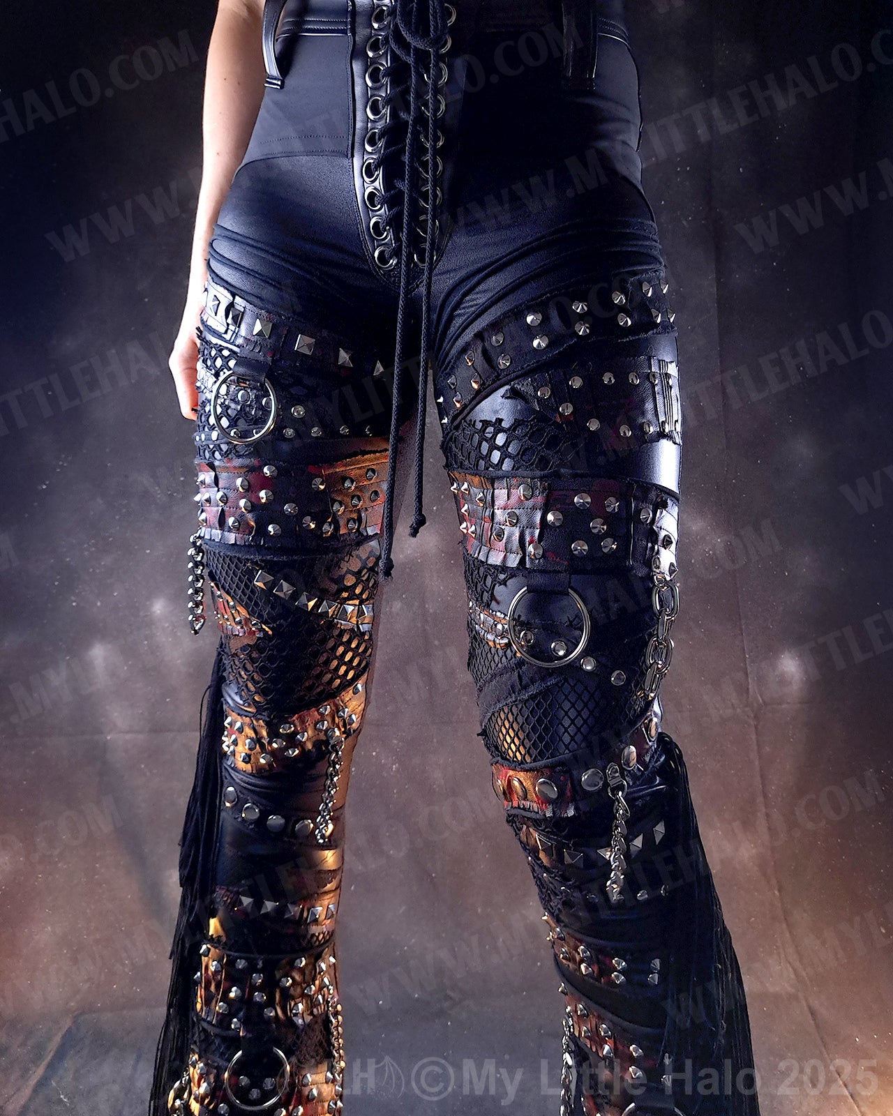 One of a kind gothic flares made with blood splatter studded leather detail, faux suede fringe, silver rings and chains. With a matte spandex base fabric and collage of faux leather, fishnet & hand-painted blood splatter faux leather. Super high waisted with lace up fly, belt loops, riveted overlays and pockets at the back.