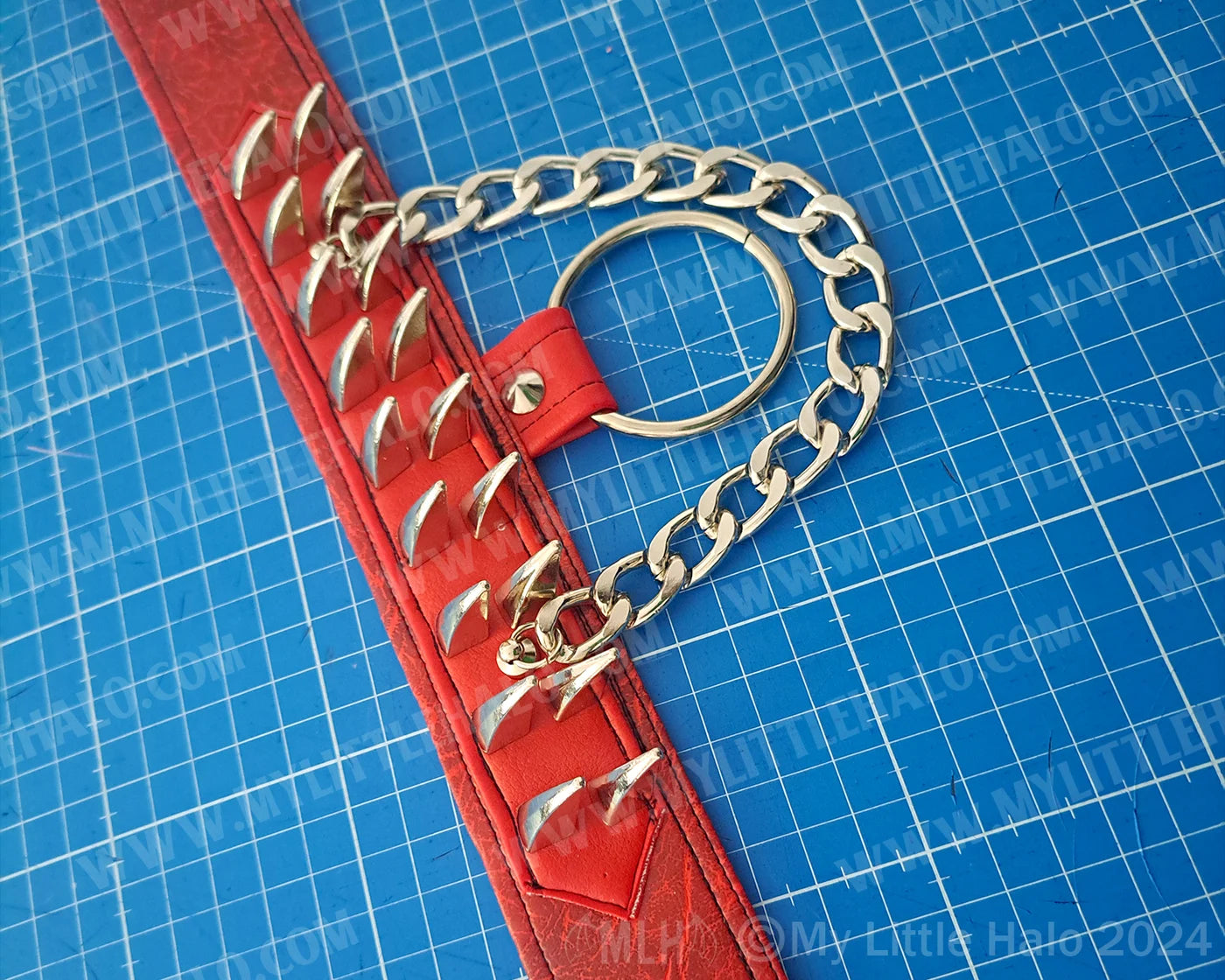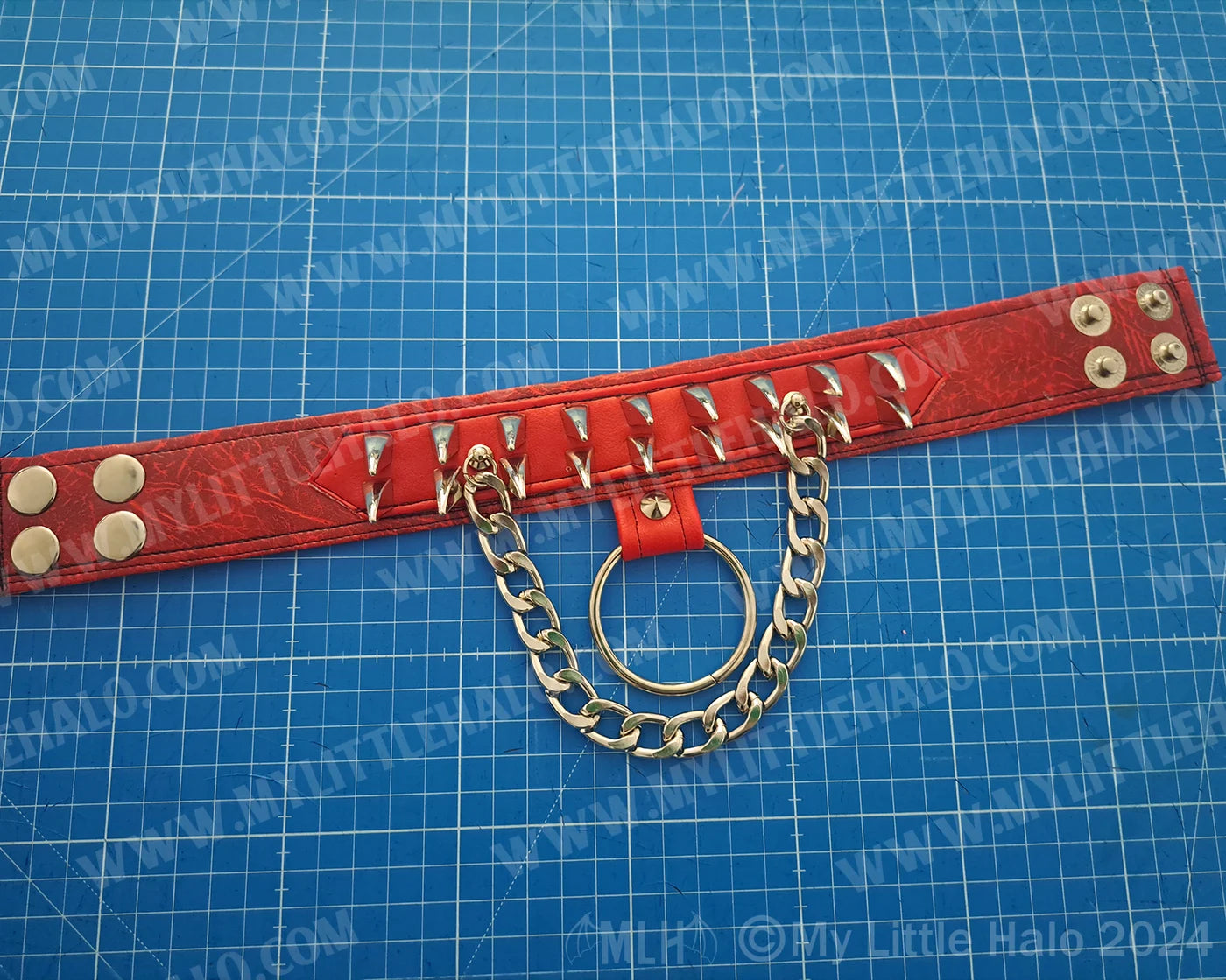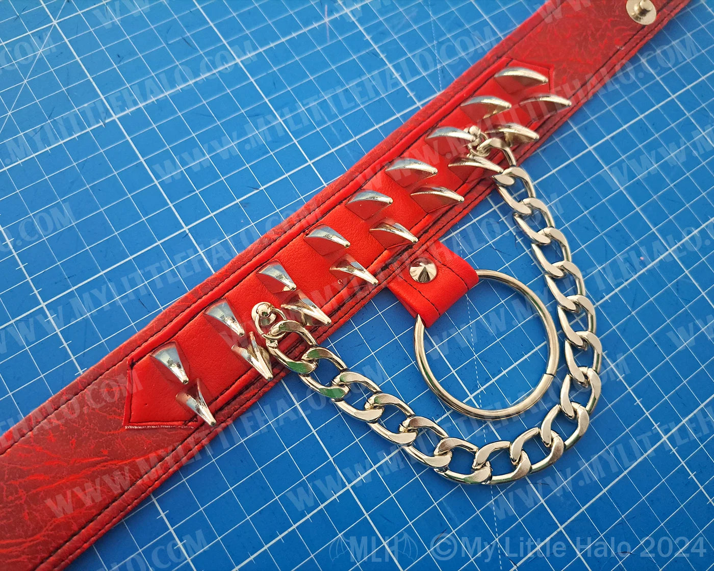 *Handmade gothic choker in red leatherette with silver spikes, O-ring & chain