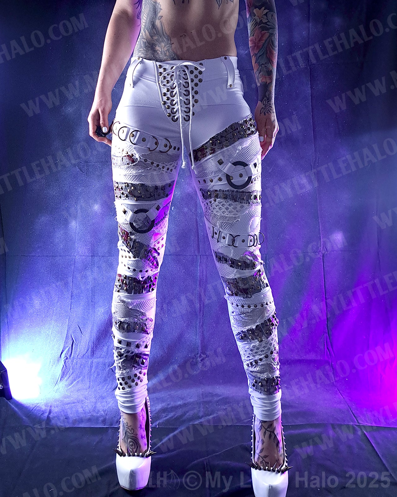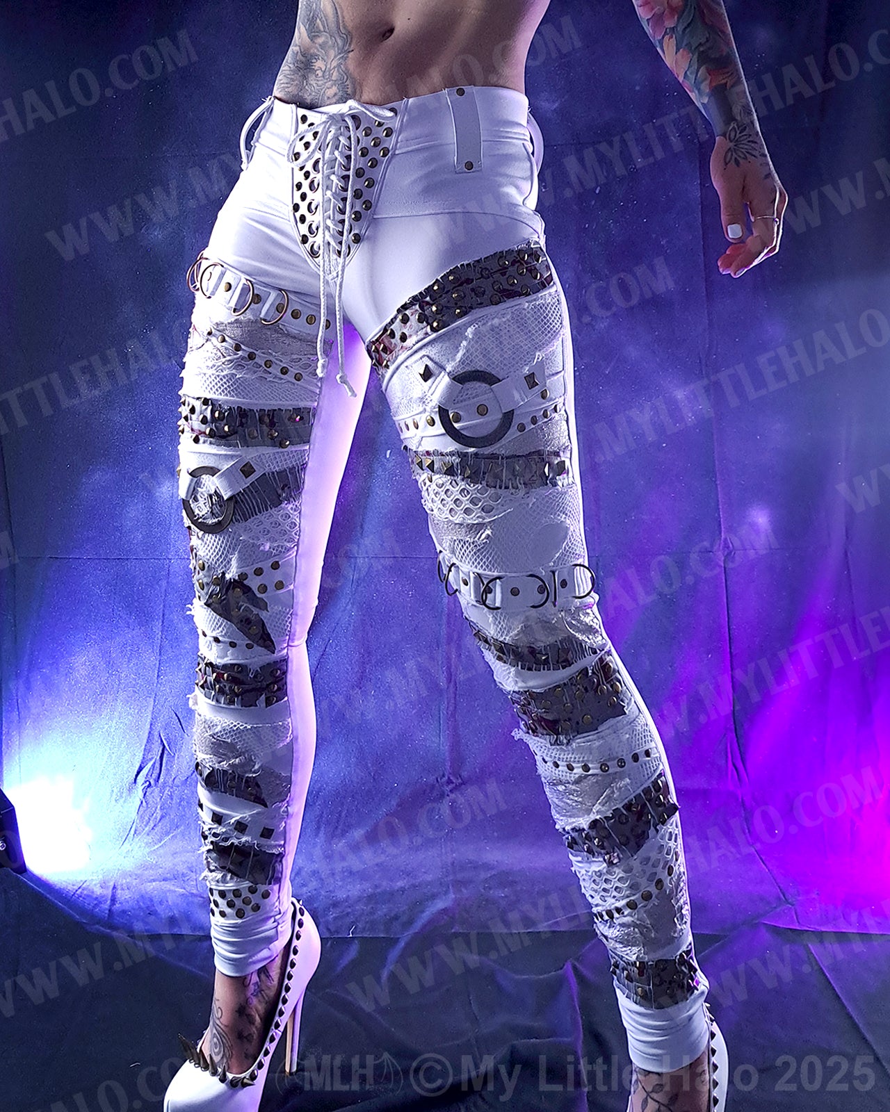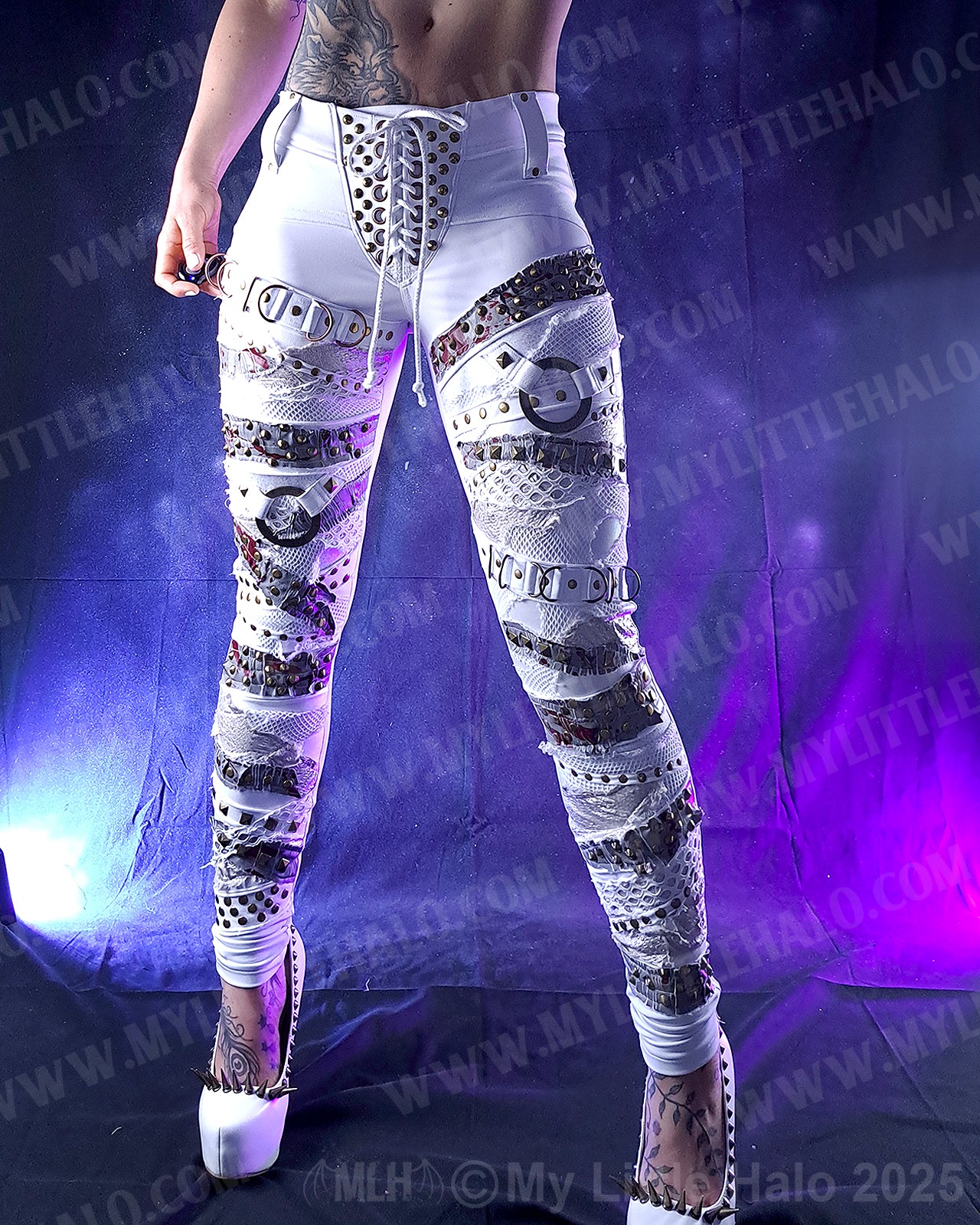 Low waisted white skinny pants with fishnet collage style front, blood splatter painted grey leather, loads of antique brass rivets and studded lace up fly