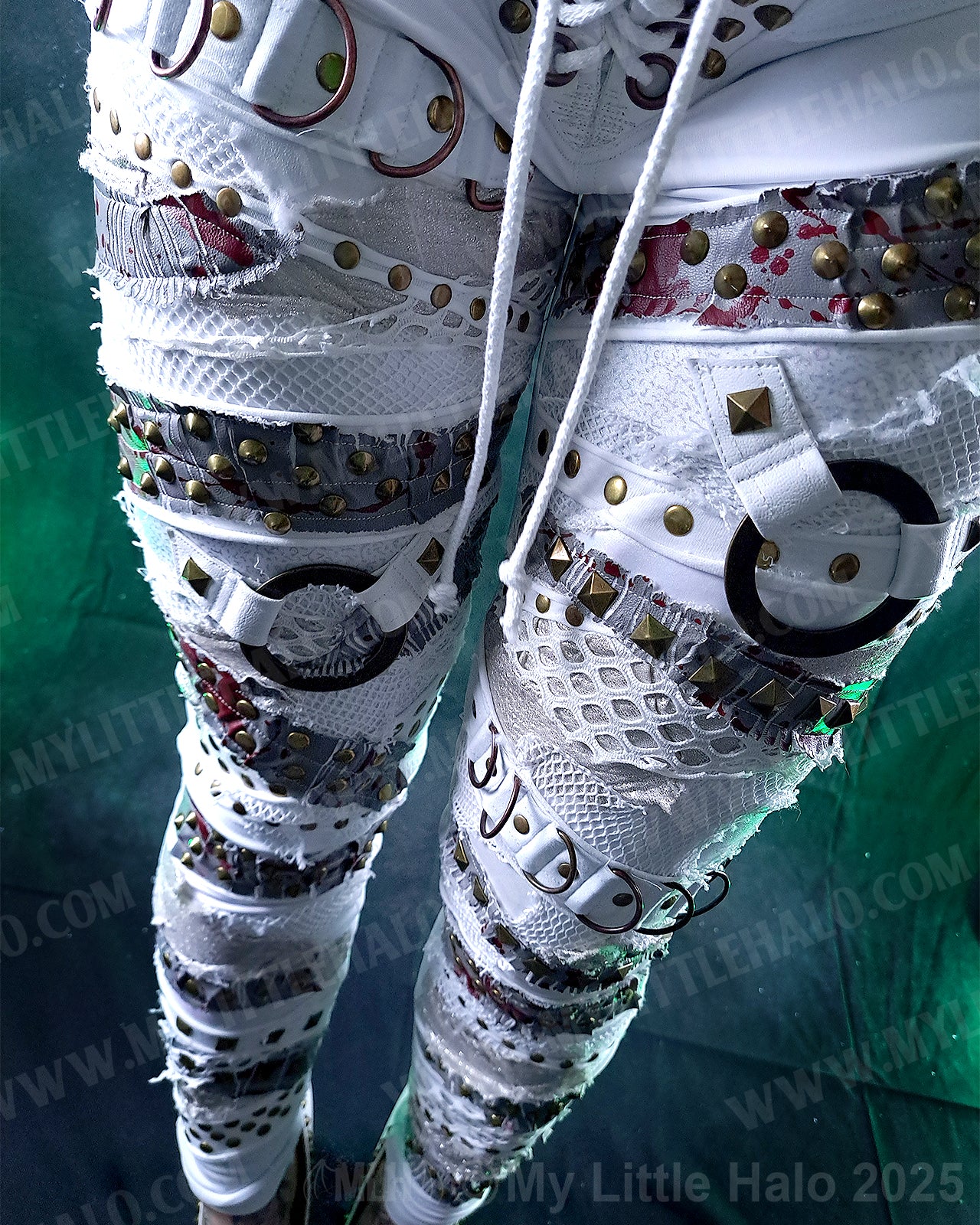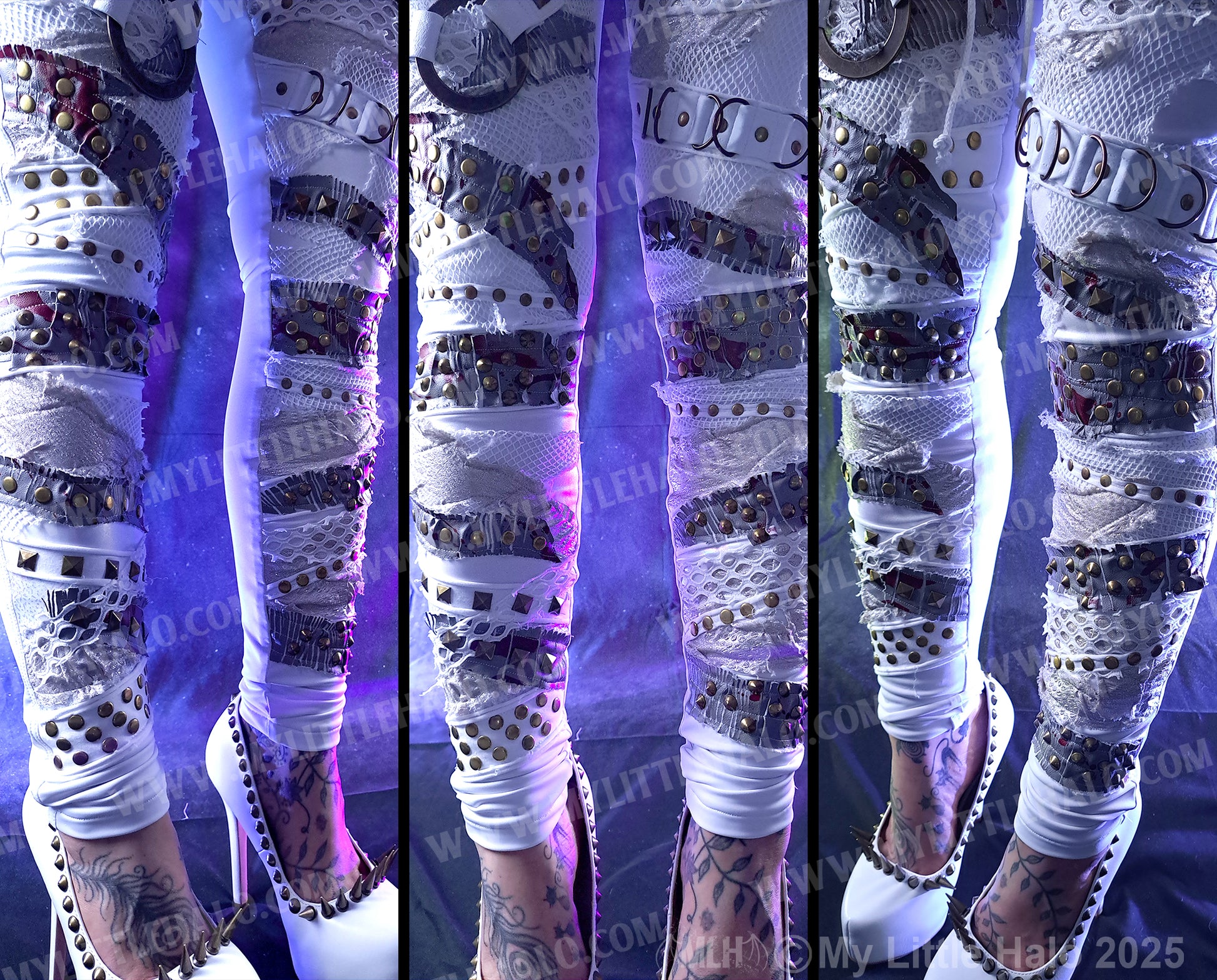 *Matte white spandex base with collage of white fishnets, hand painted bloody splatter grey leather, silver crinkle fabric and 2 different holographic white spandex fabrics