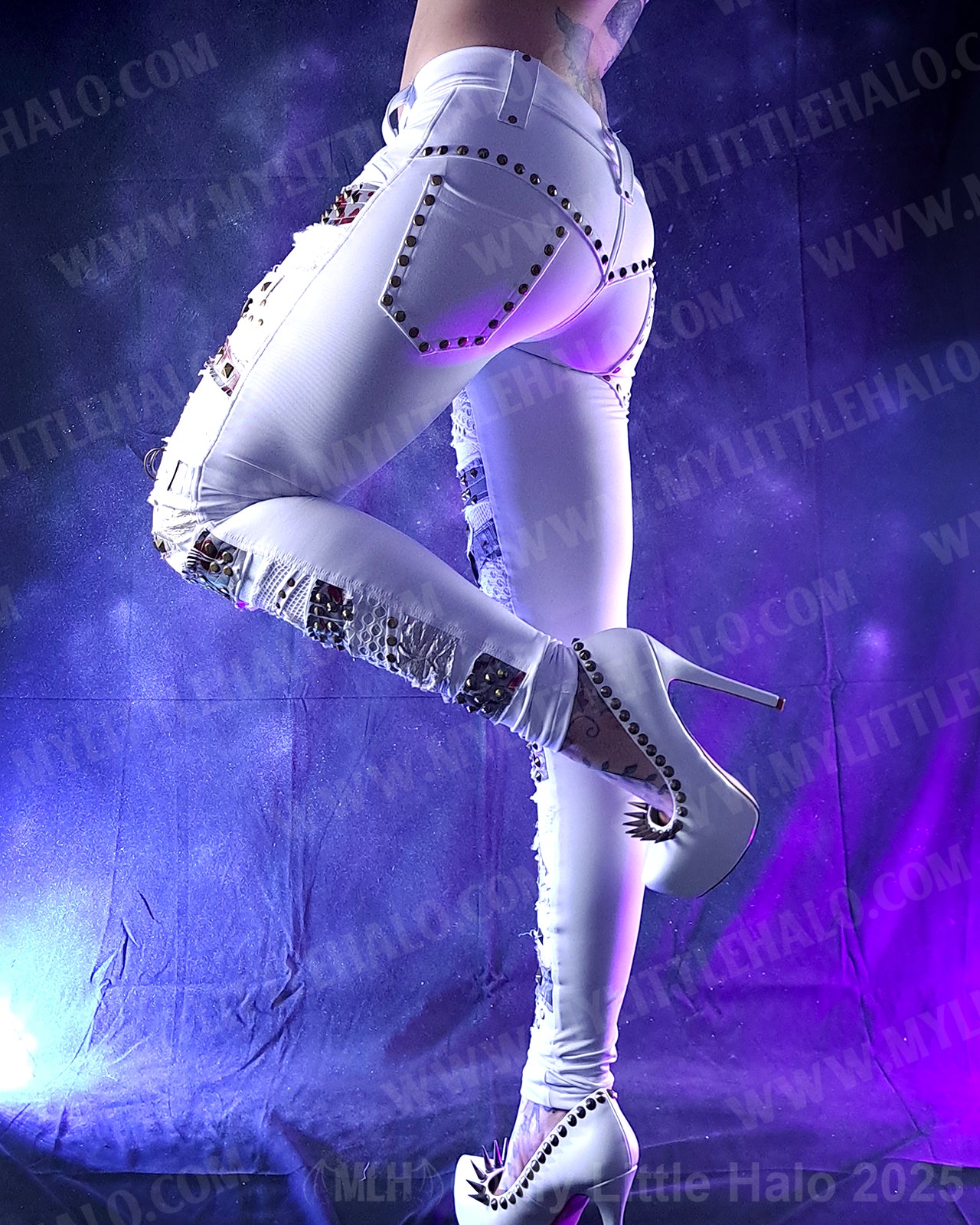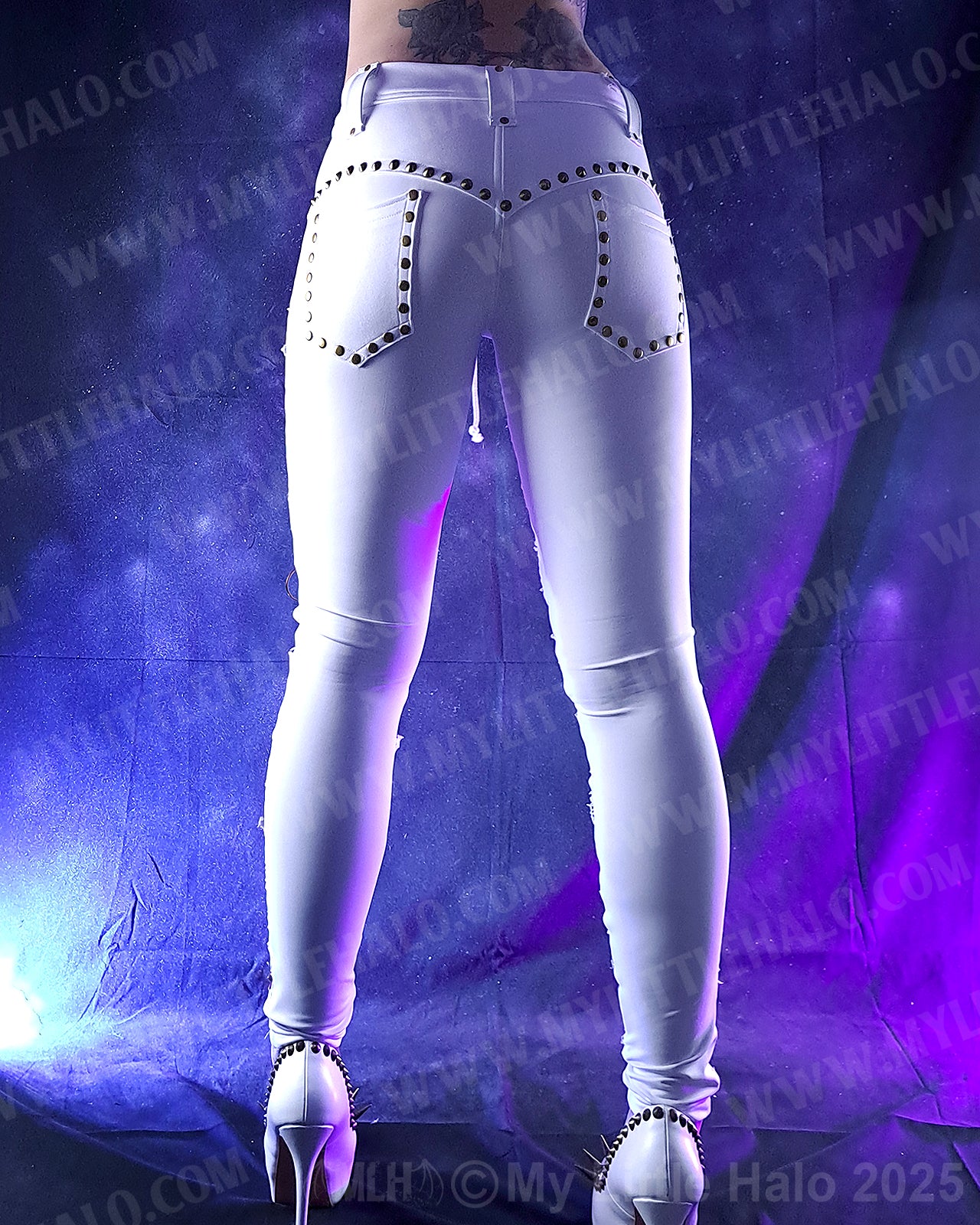 *Stretch white scuba waistband with belt loops and studded lace up fly