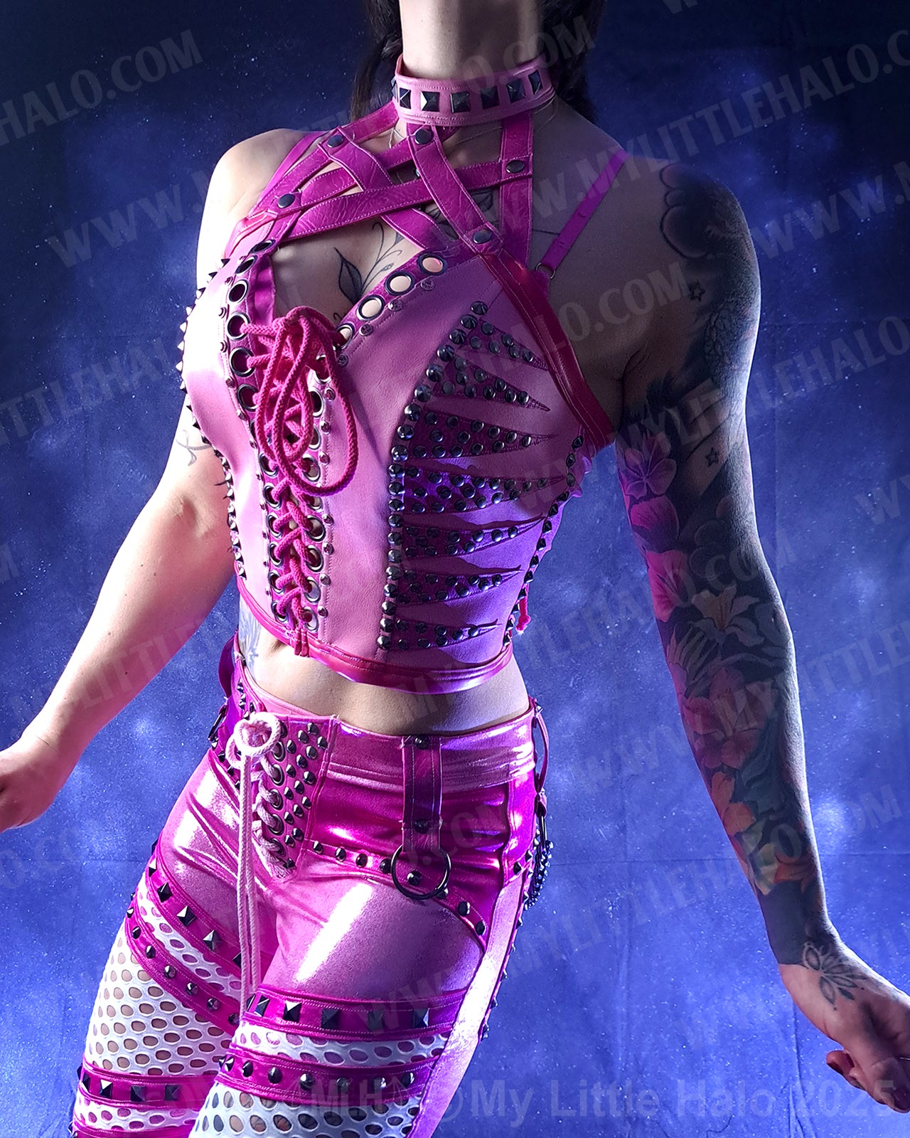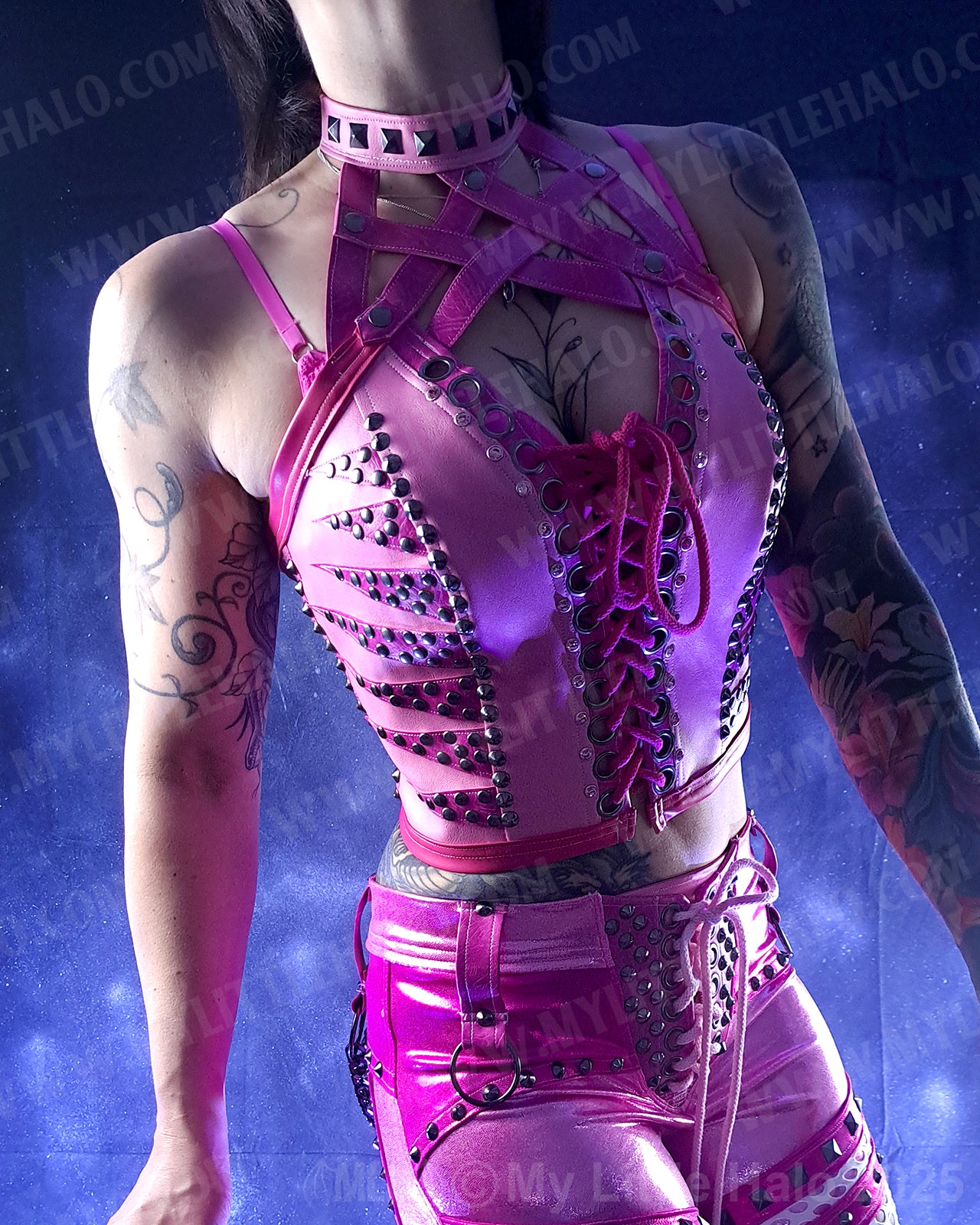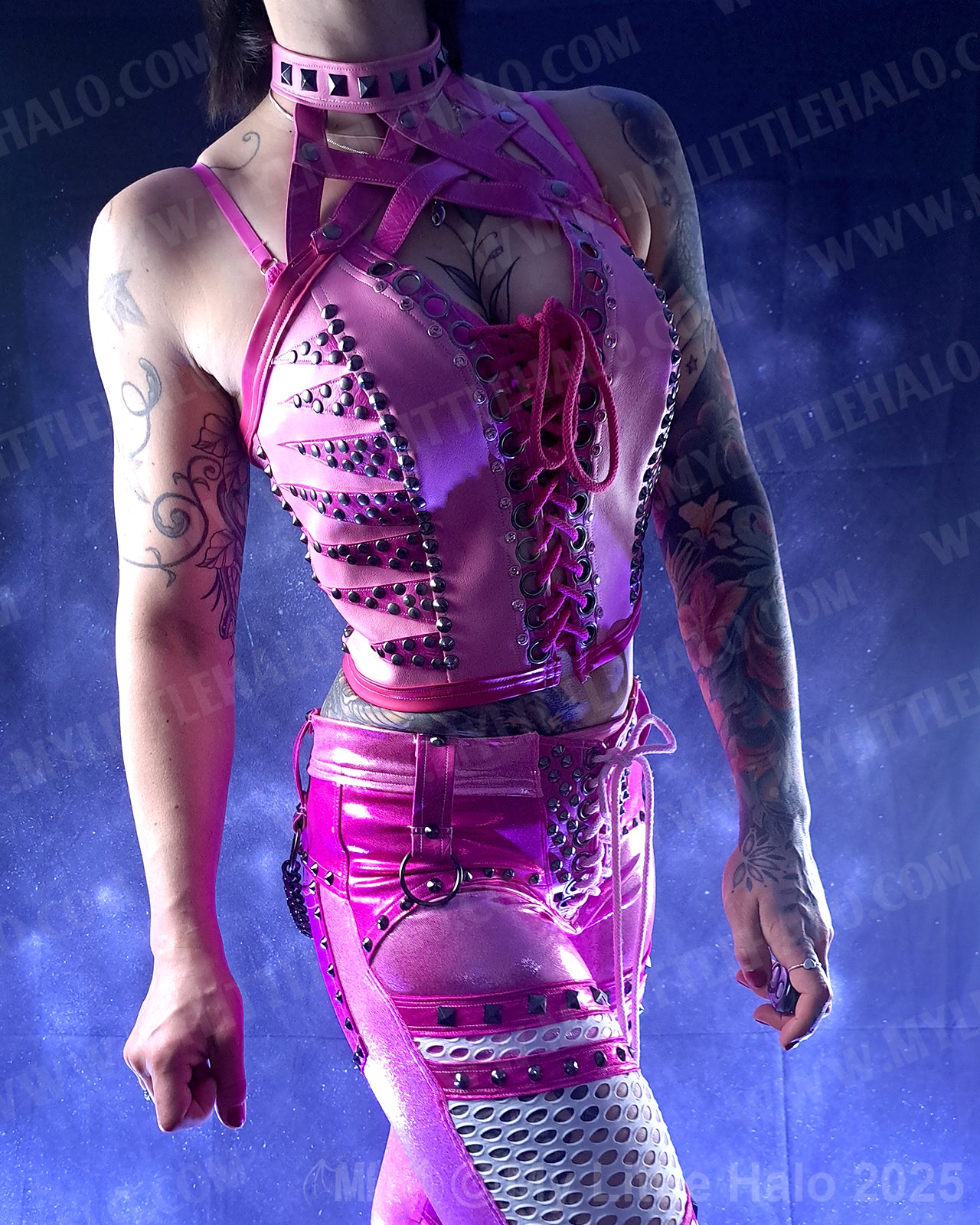 Lace up bustier in light pink faux leather with dark pink spike strips covered in gunmetal rivets, lace up front with gunmetal eyelets and pink gemstones, criss-cross straps and adjustable choker strap. The bustier has a stretch, spandex back with decorative lace up panel and gunmetal rivets. One of a kind!