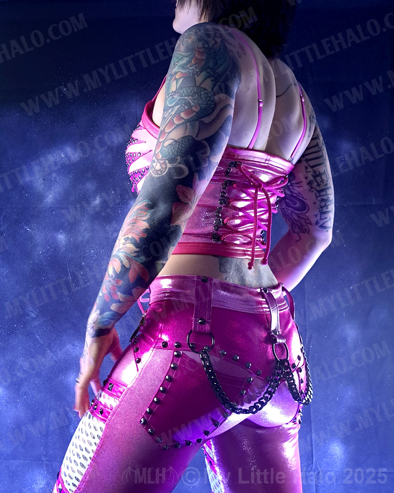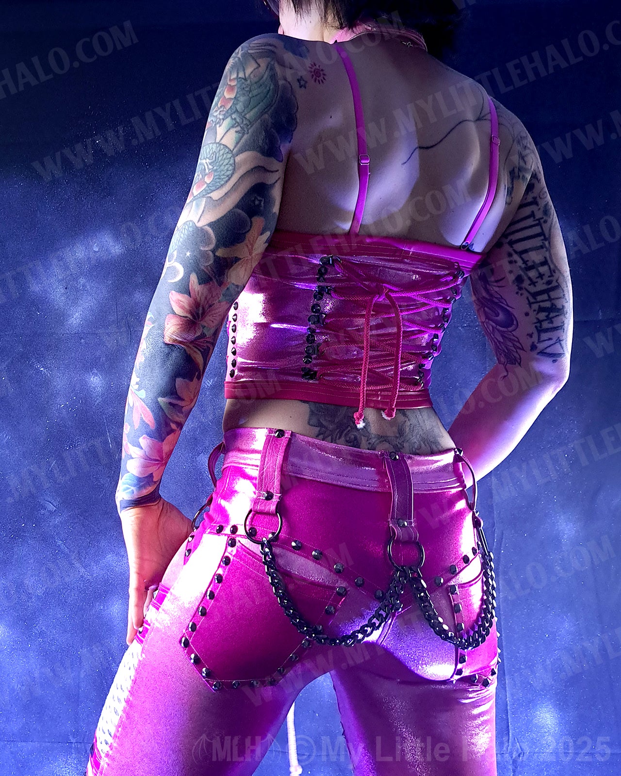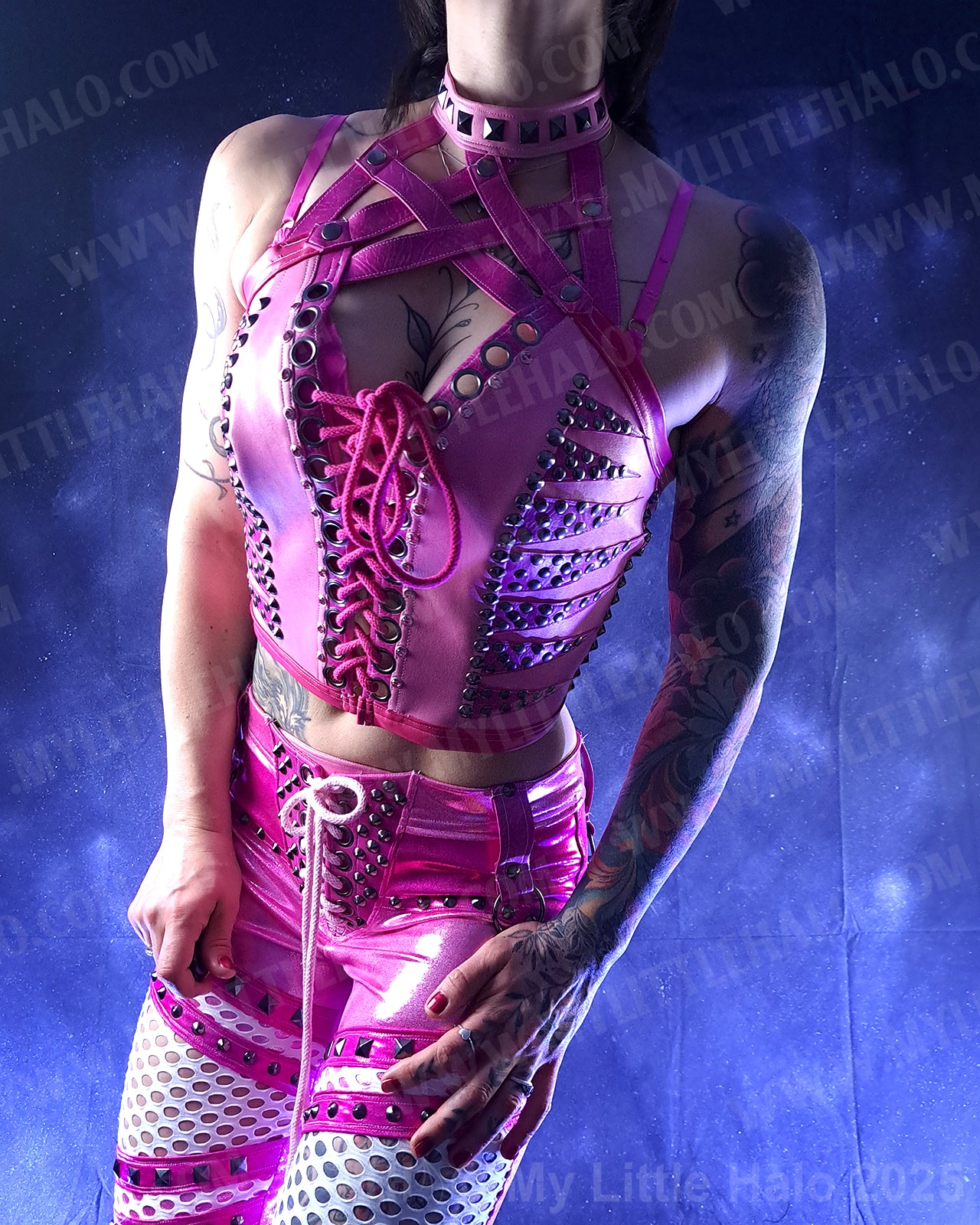 Lace up bustier in light pink faux leather with dark pink spike strips covered in gunmetal rivets, lace up front with gunmetal eyelets and pink gemstones, criss-cross straps and adjustable choker strap. The bustier has a stretch, spandex back with decorative lace up panel and gunmetal rivets. One of a kind!