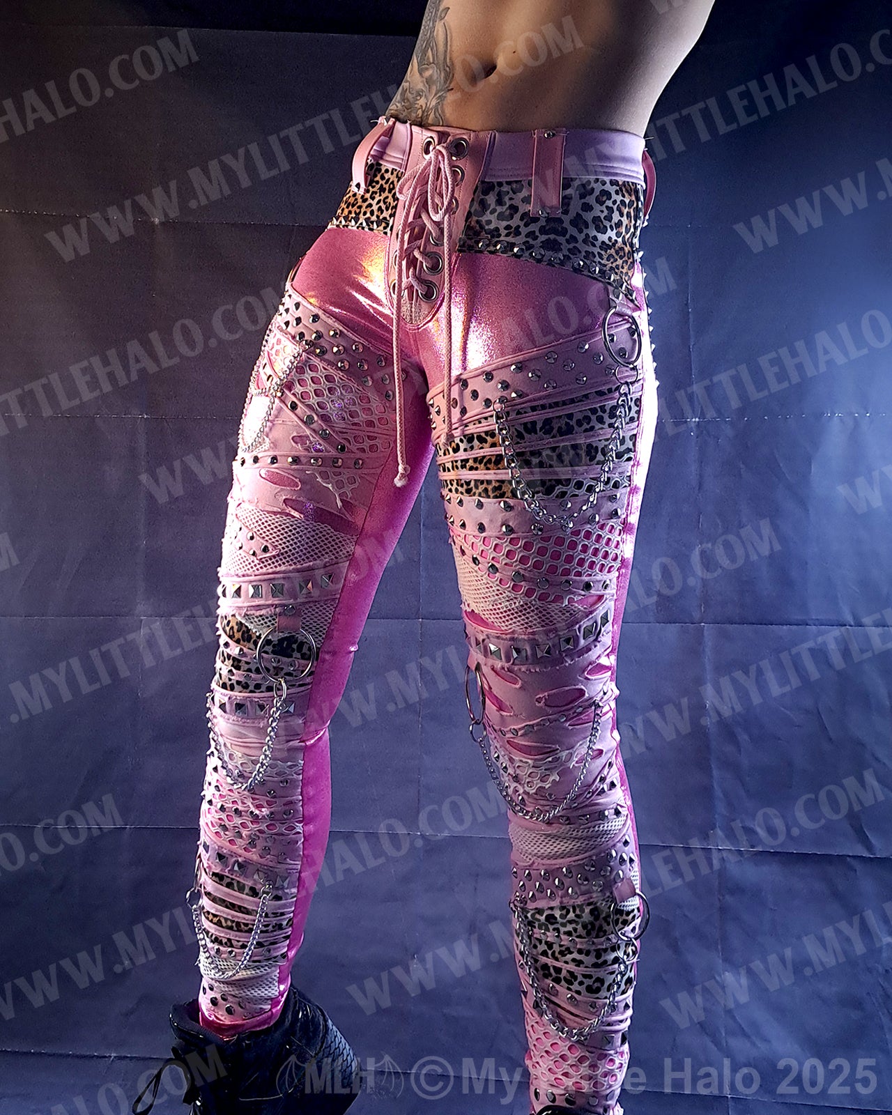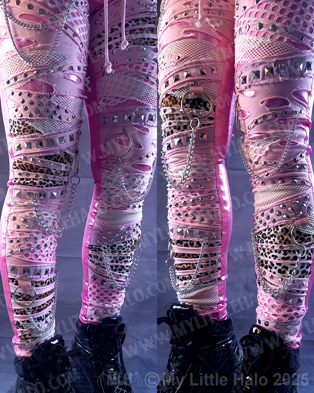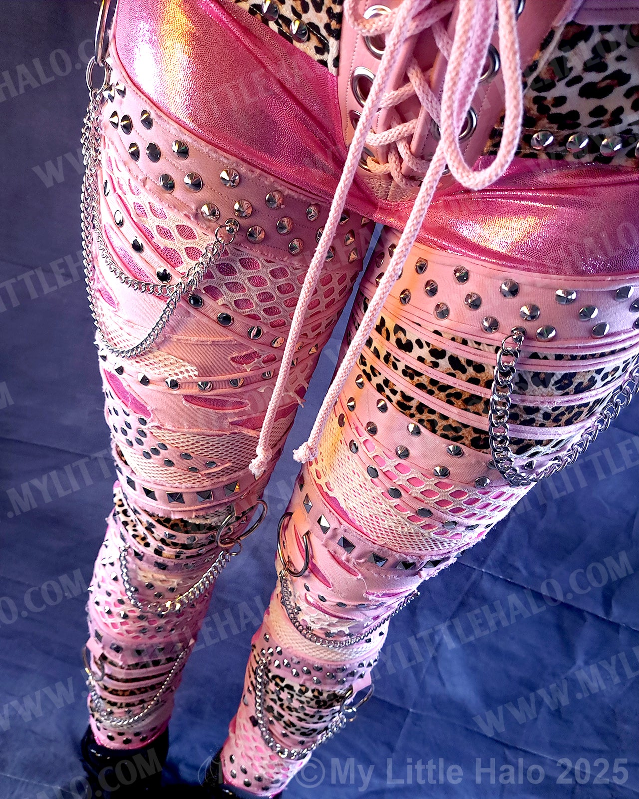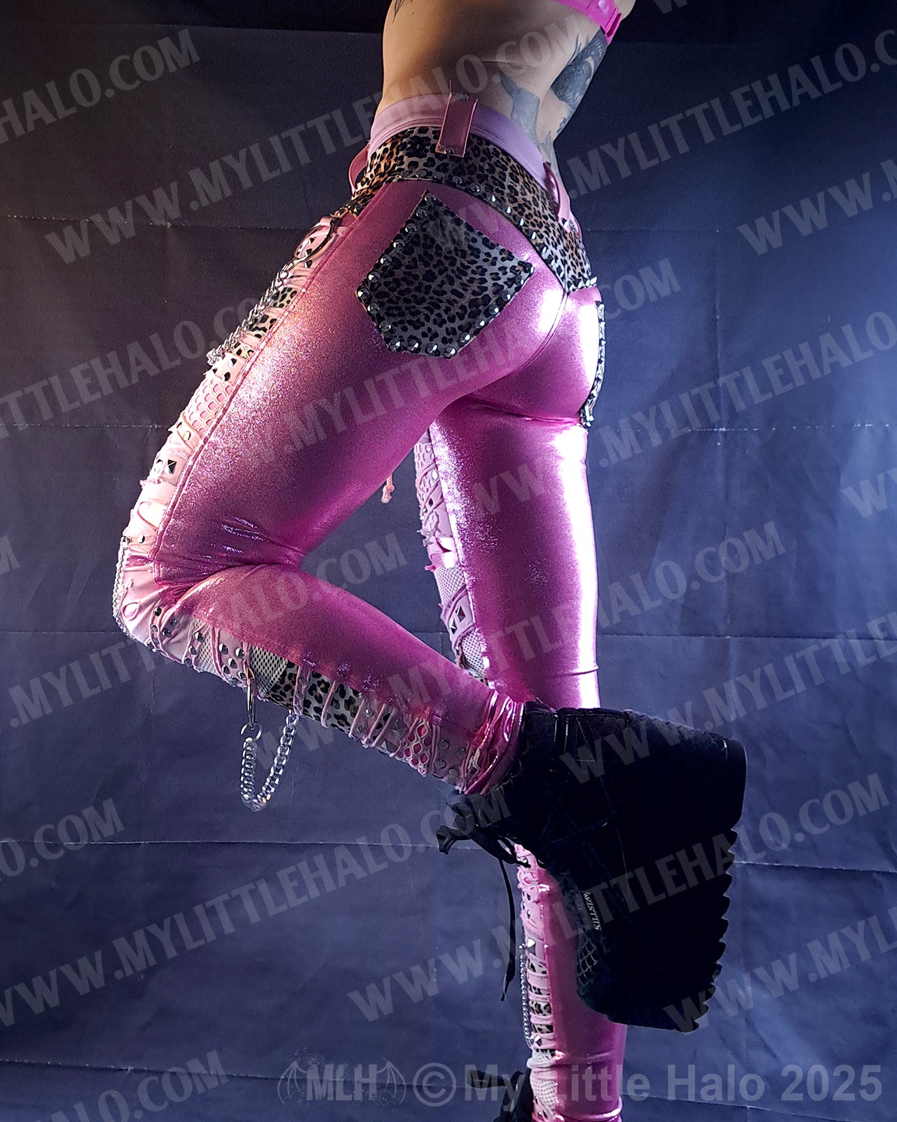 Skinny leg studded pants in baby pink with accents of cheetah print, loads of silver rivets, O-rings & chains